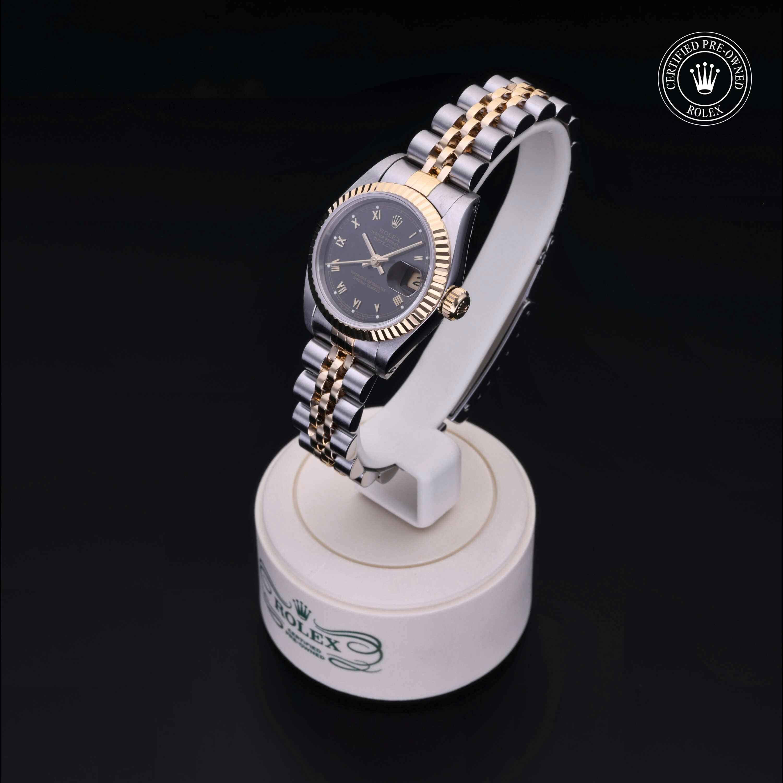 Rolex Certified Pre-Owned Datejust (69173) self - winding automatic watch, features a 26mm stainless steel case with an 18k yellow gold fluted surrounding a dark grey roman dial. The watch is paired on a stainless steel and 18k yellow gold Jubilee bracelet. Functions include hours, minutes, seconds and date. This watch has received Rolex-authorized service and certification. It does not come with the original box or papers, but includes a custom Rolex Certified Pre-Owned hang tag, travel pouch and RCPO international warranty card.