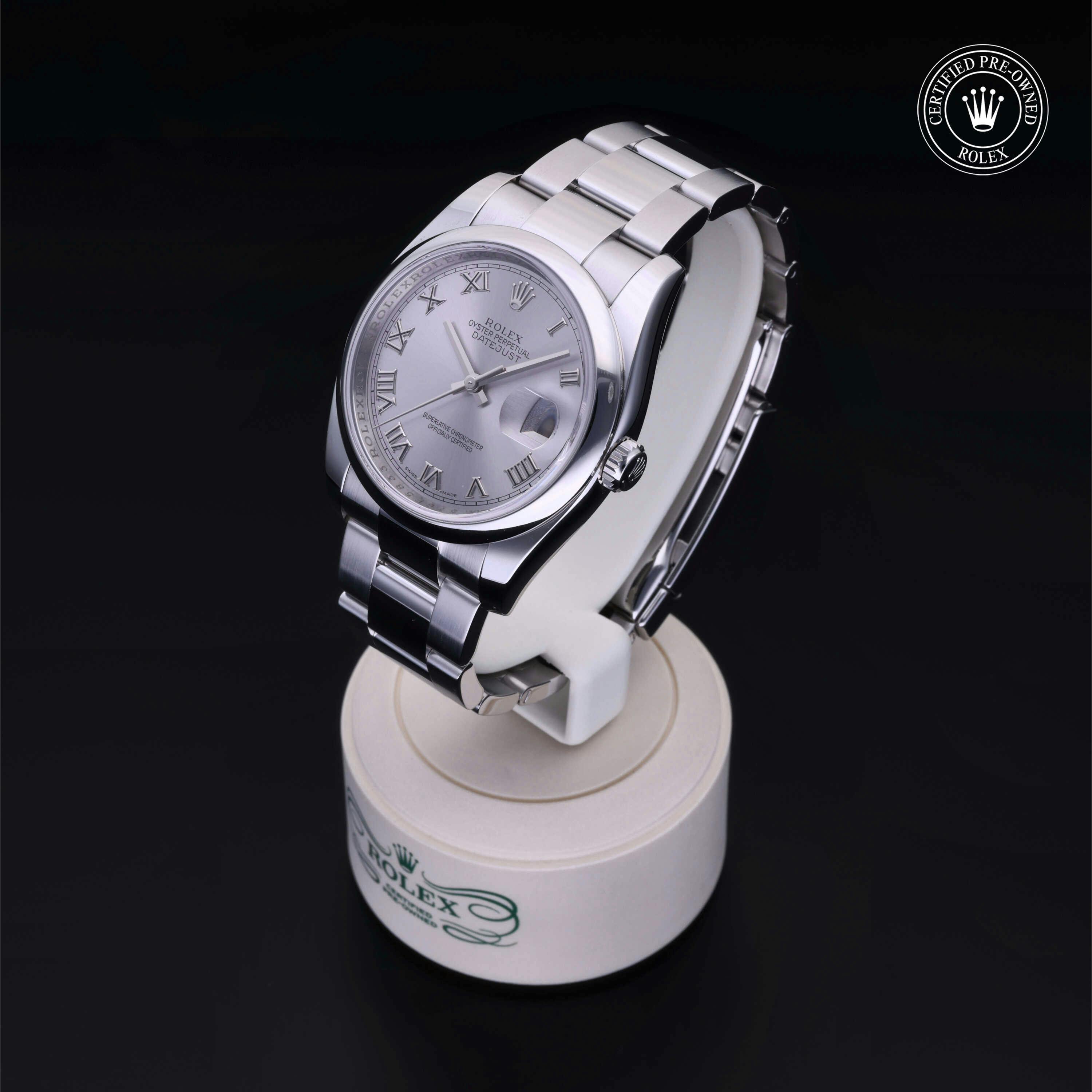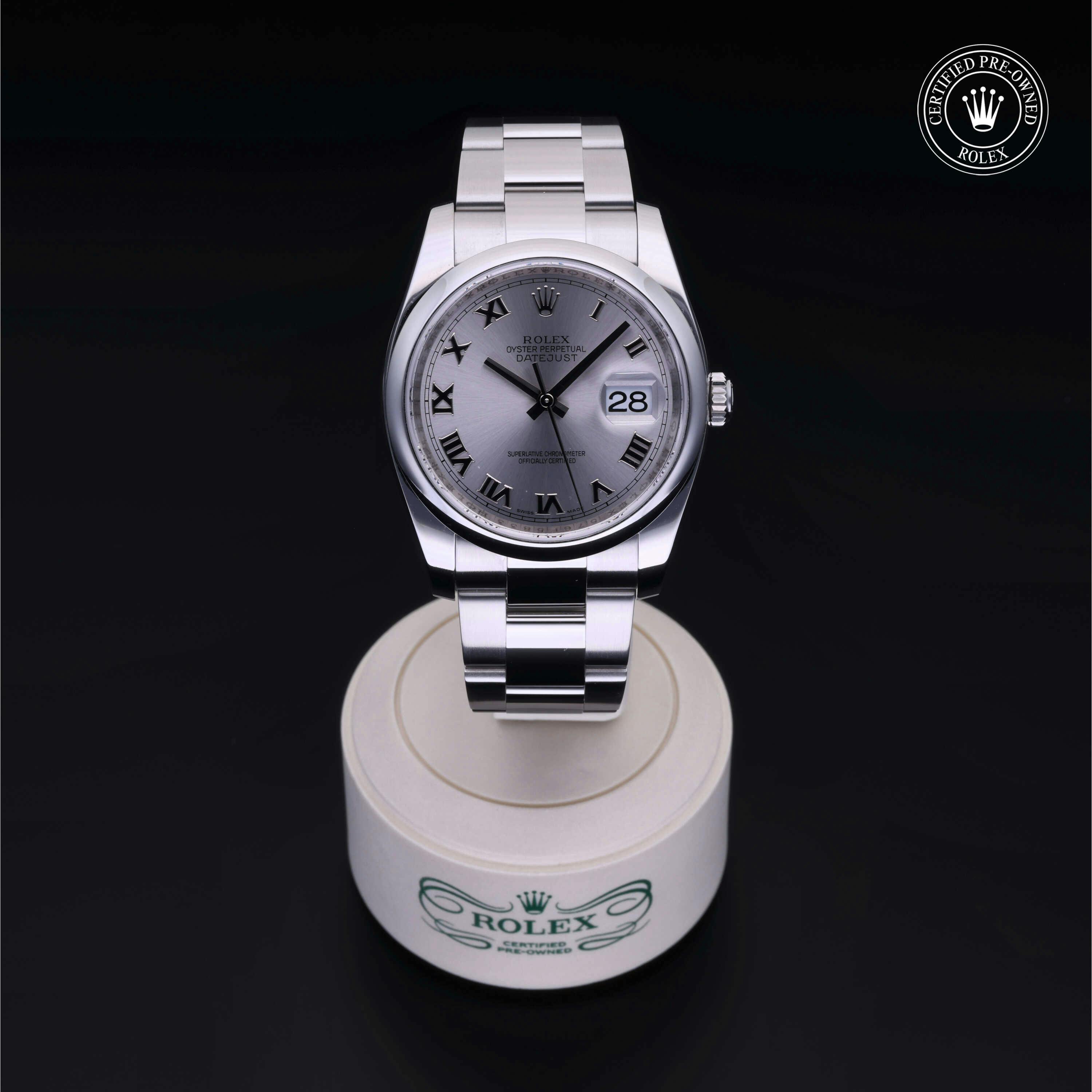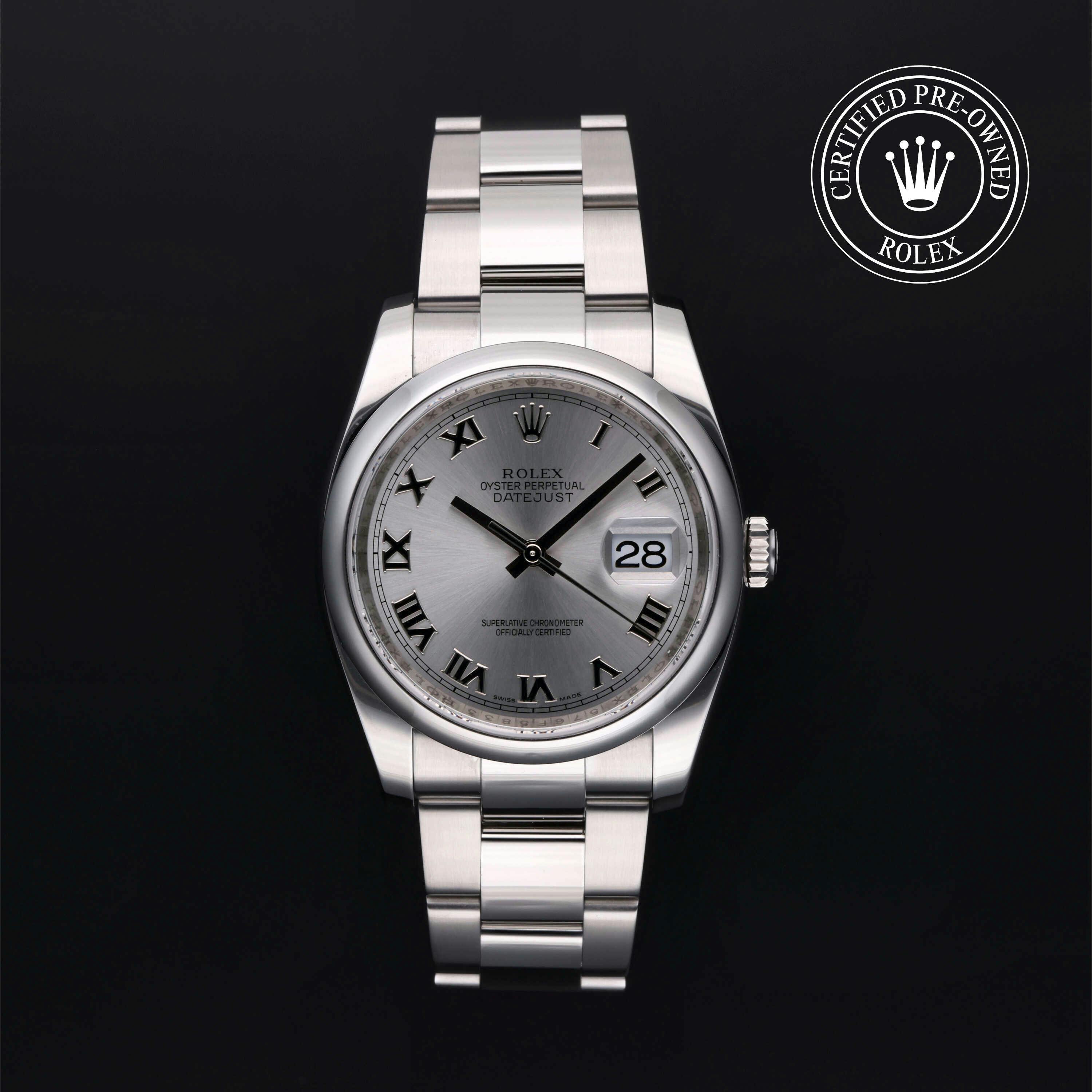 Rolex Certified Pre-Owned Datejust (116200) self - winding automatic watch, features a 36mm stainless steel case and domed bezel surrounding a rhodium dial on a stainless steel oyster bracelet. Functions include hours, minutes, seconds and date. This watch has received Rolex-authorized service and certification. It does not come with the original box or papers, but includes a custom Rolex Certified Pre-Owned hang tag, travel pouch and RCPO international warranty card.