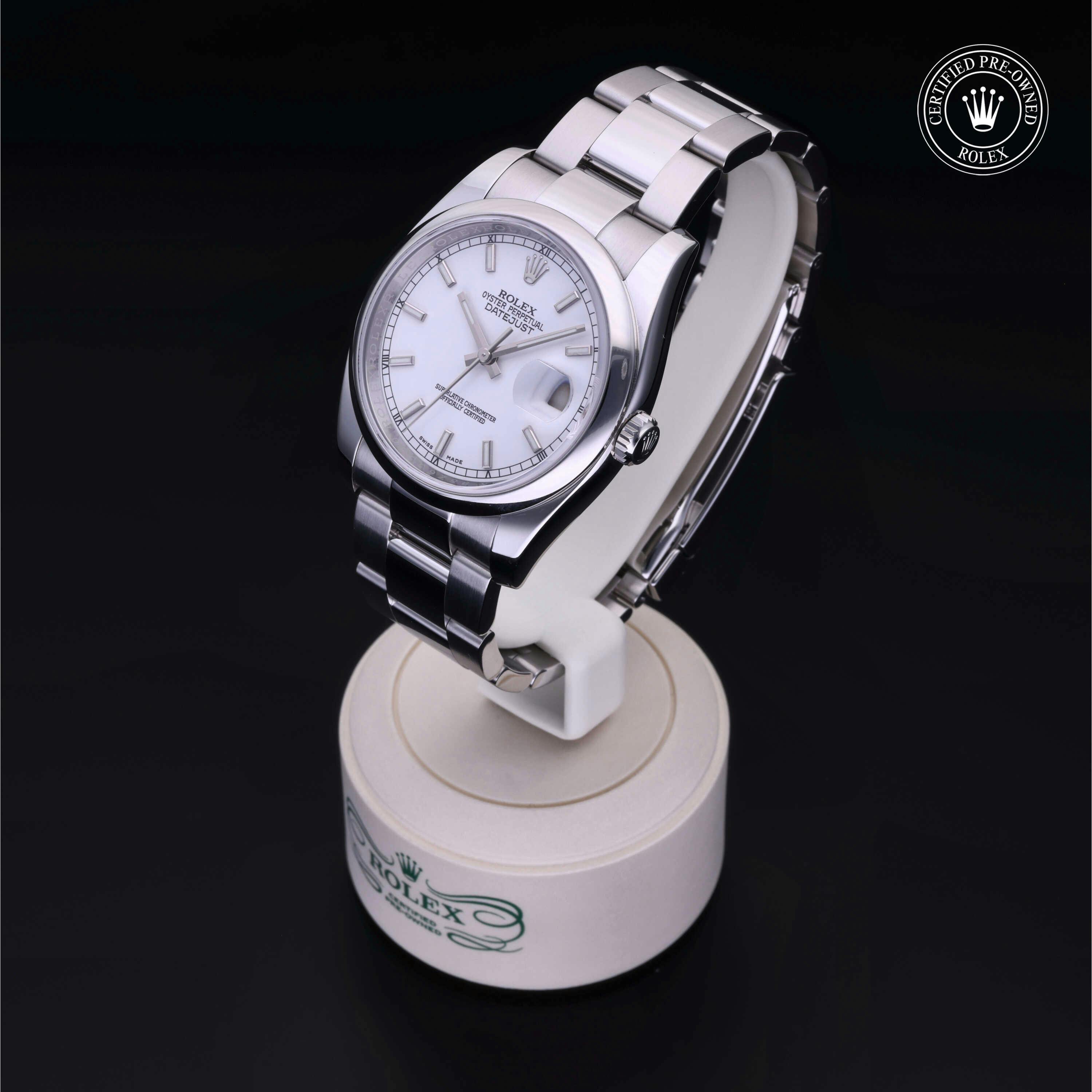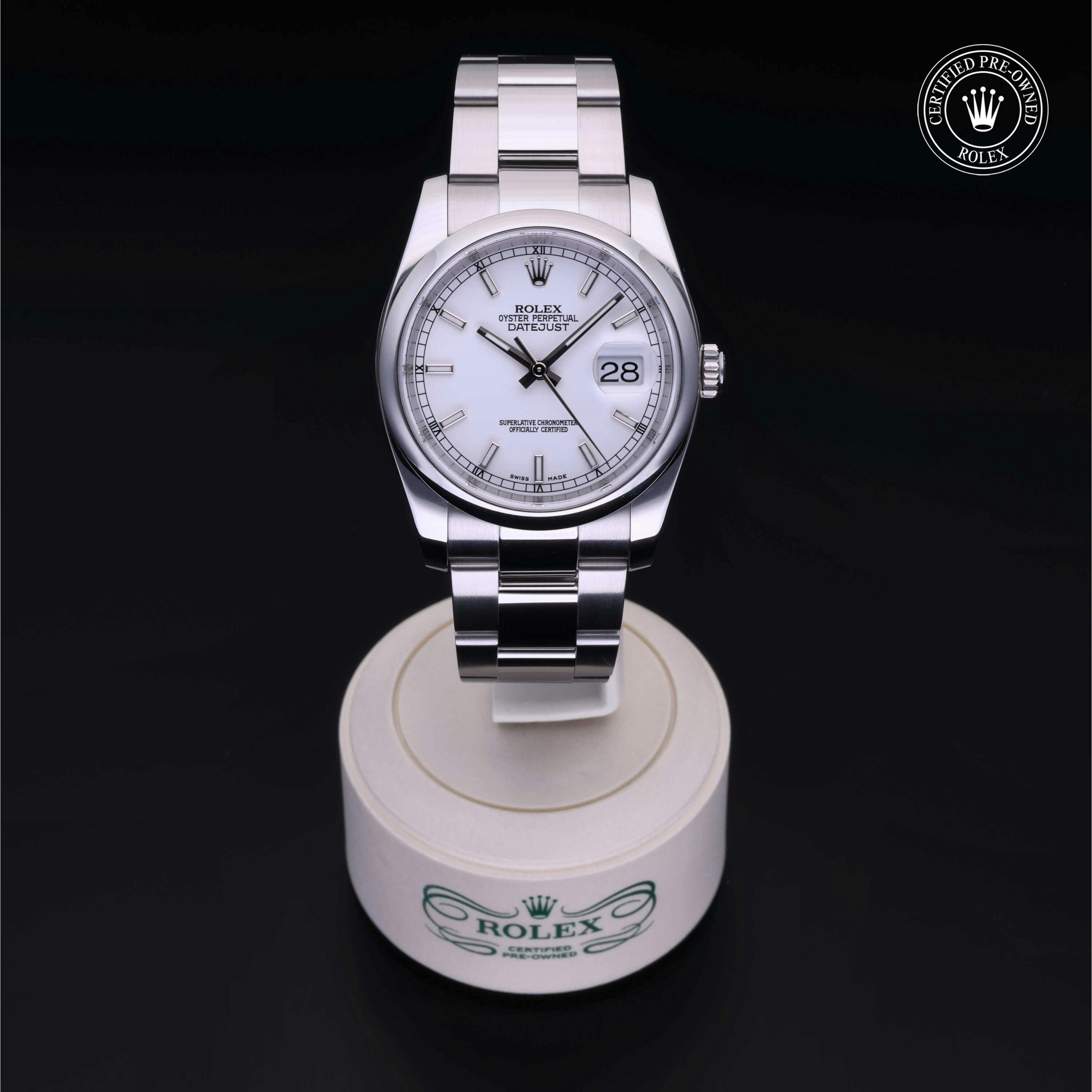 Rolex Certified Pre-Owned Datejust (116200) self - winding automatic watch, features a 36mm stainless steel case and domed bezel surrounding a white dial on a stainless steel oyster bracelet. Functions include hours, minutes, seconds and date. This watch has received Rolex-authorized service and certification. It does not come with the original box or papers, but includes a custom Rolex Certified Pre-Owned hang tag, travel pouch and RCPO international warranty card.