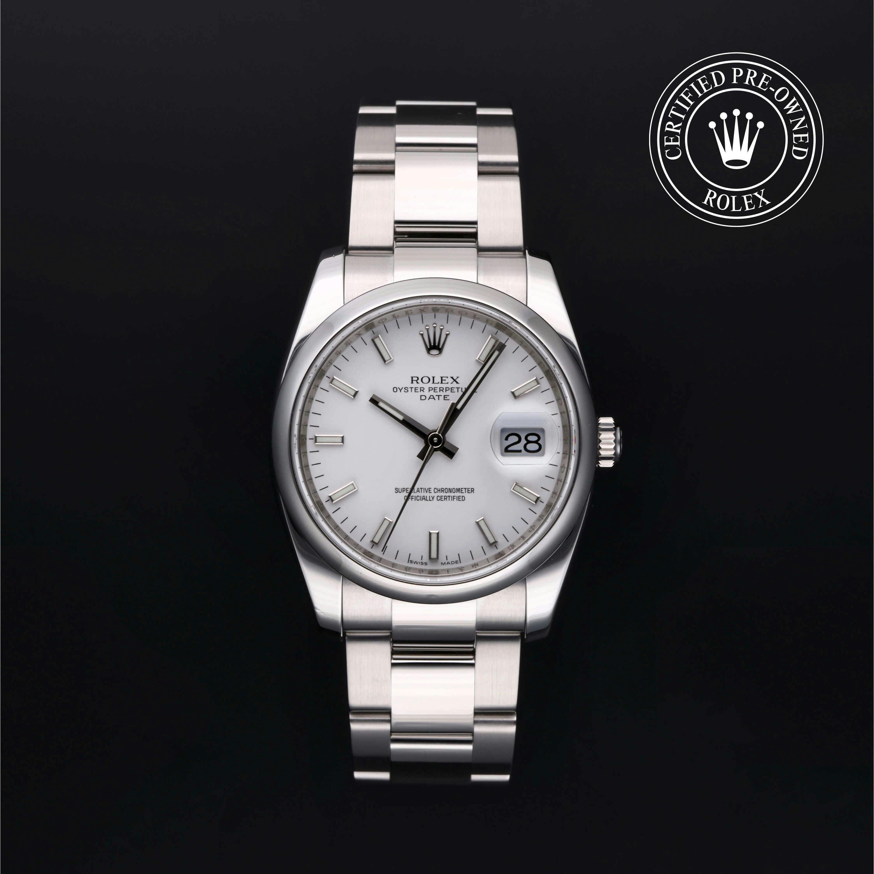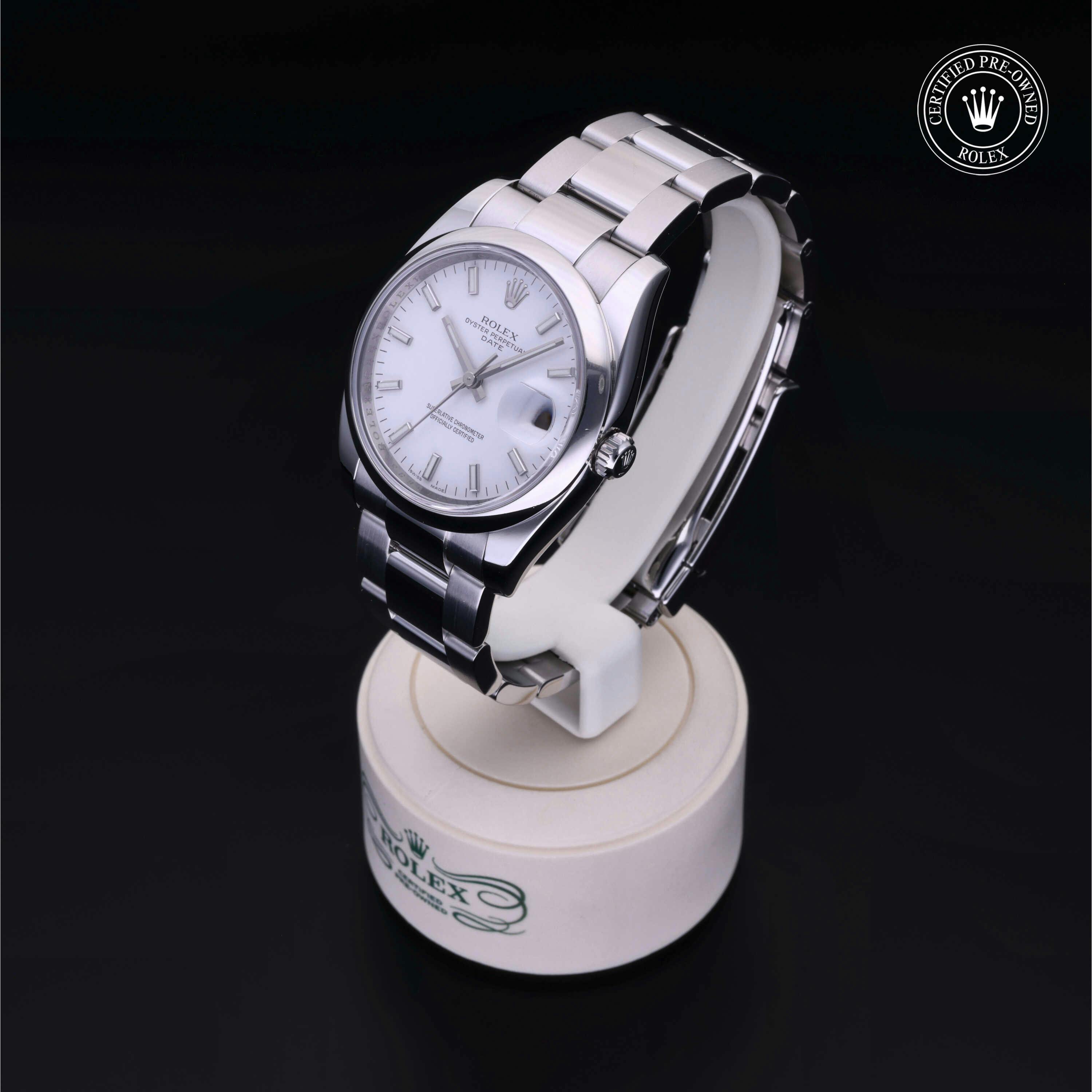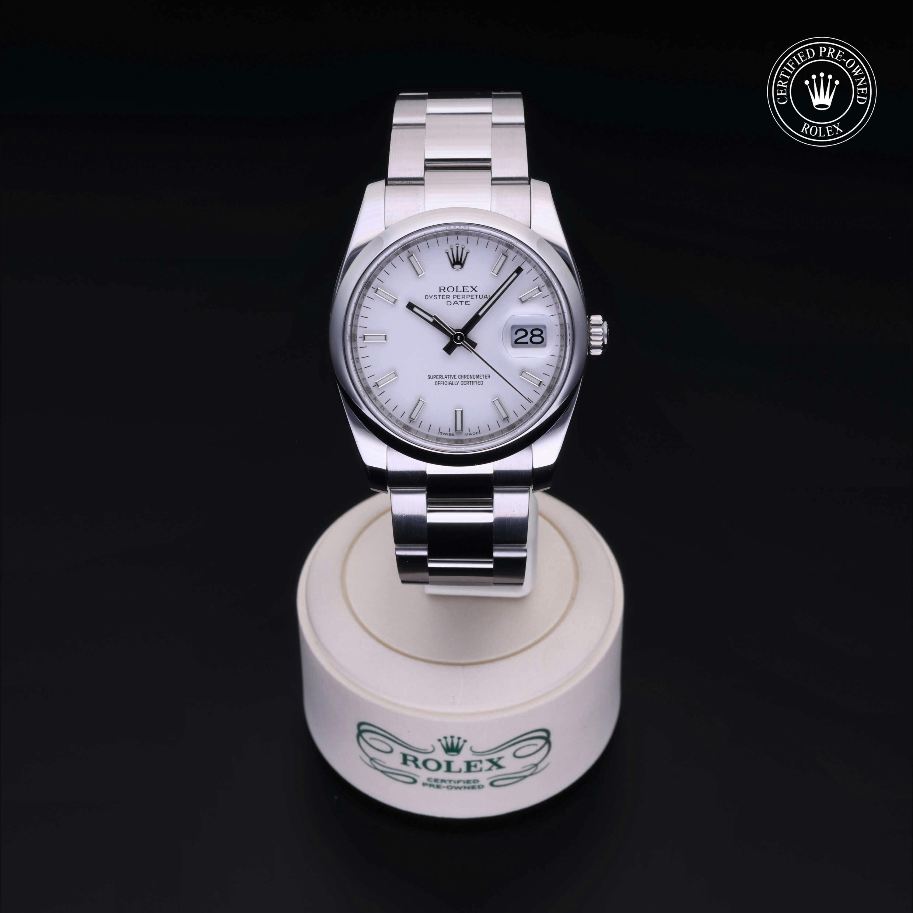 Rolex Certified Pre-Owned Oyster Perpetual Date (115200) self - winding automatic watch, features a 34mm stainless steel case and domed bezel surrounding a white dial on a stainless steel oyster bracelet. Functions include hours, minutes and seconds. This watch has received Rolex-authorized service and certification. It does not come with the original box or papers, but includes a custom Rolex Certified Pre-Owned hang tag, travel pouch and RCPO international warranty card.