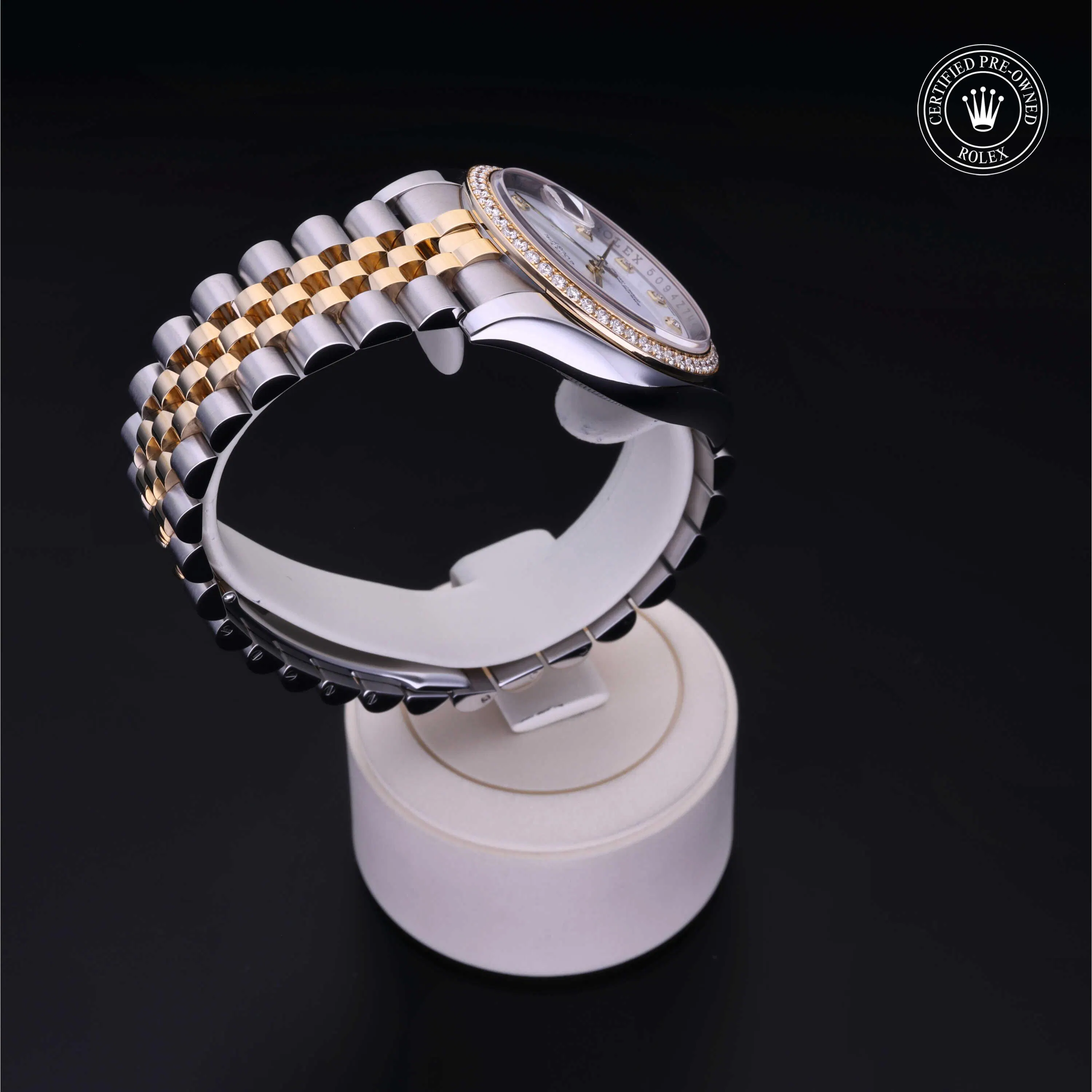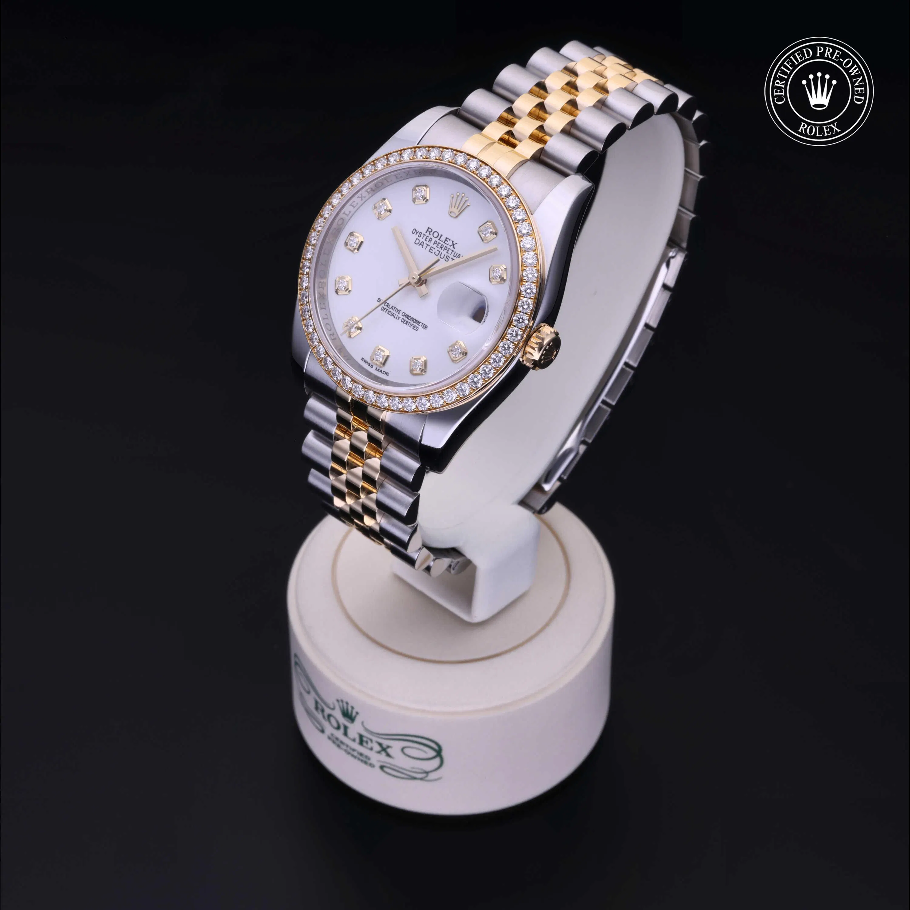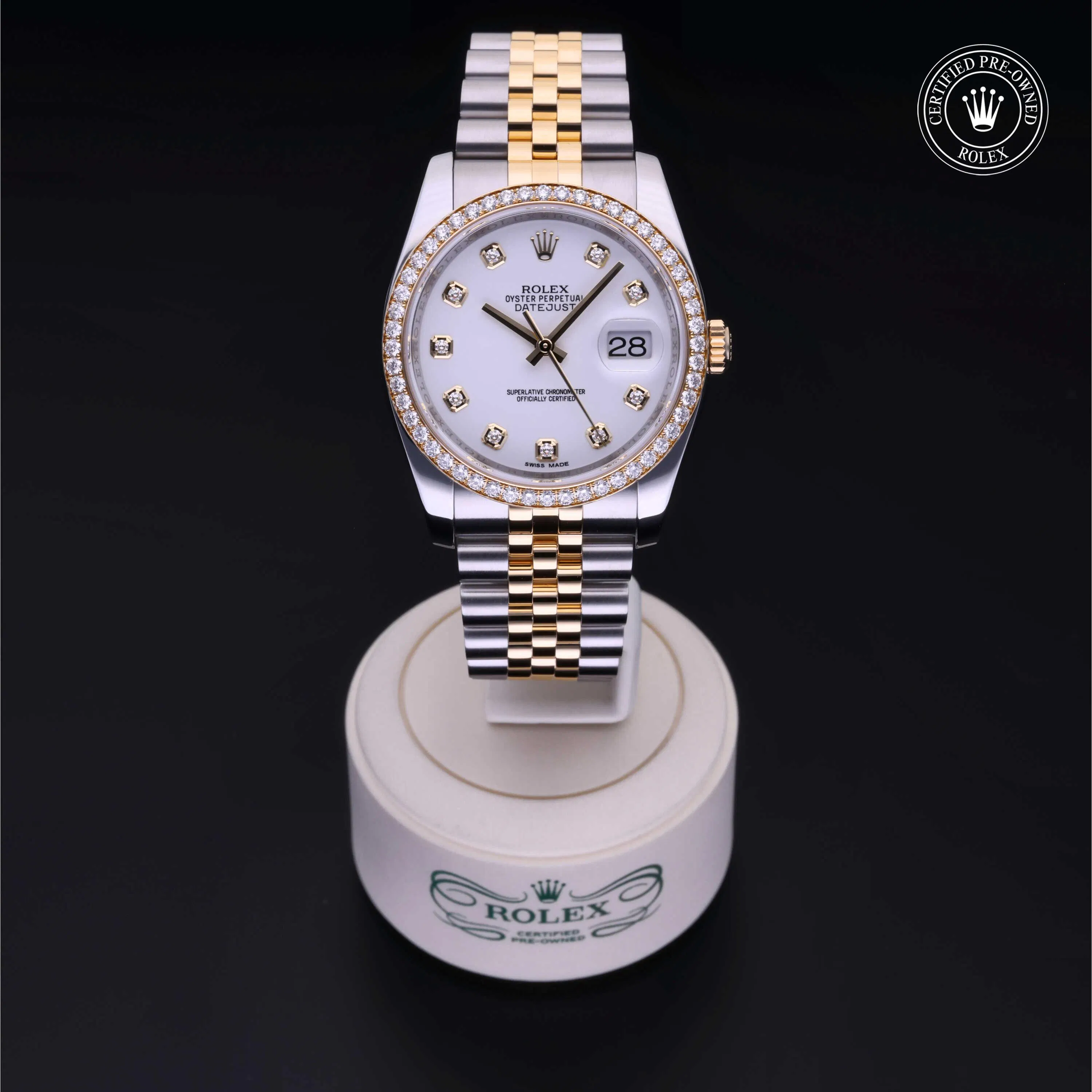 Rolex Certified Pre-Owned Datejust (116243) self - winding automatic watch, features a 36mm stainless steel case with an 18k yellow gold diamond set bezel surrounding a white diamond set dial on a stainless steel and 18k yellow gold jubilee bracelet. Functions include hours, minutes, seconds and date. This watch has received Rolex-authorized service and certification. It does not come with the original box or papers, but includes a custom Rolex Certified Pre-Owned hang tag, travel pouch and RCPO international warranty card.