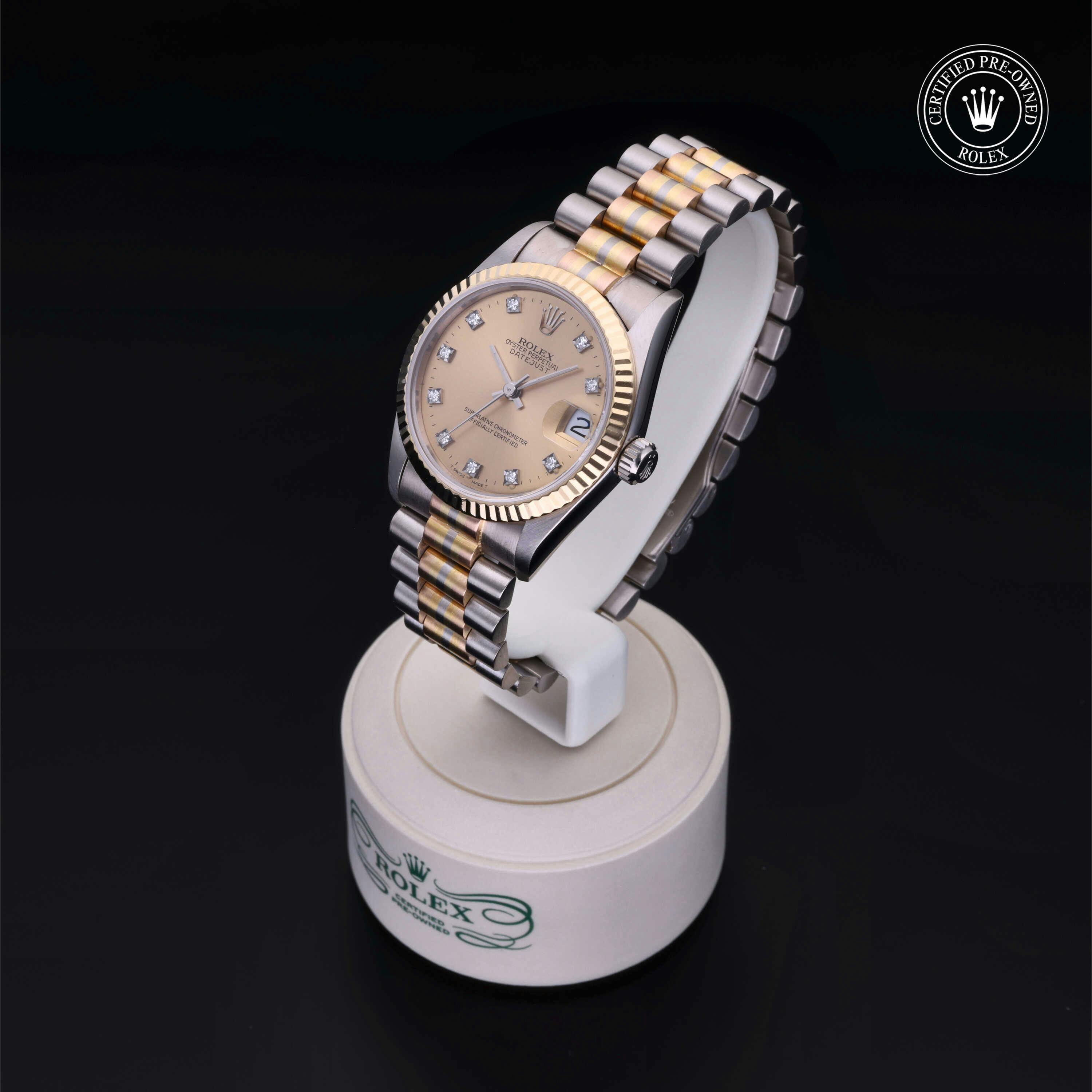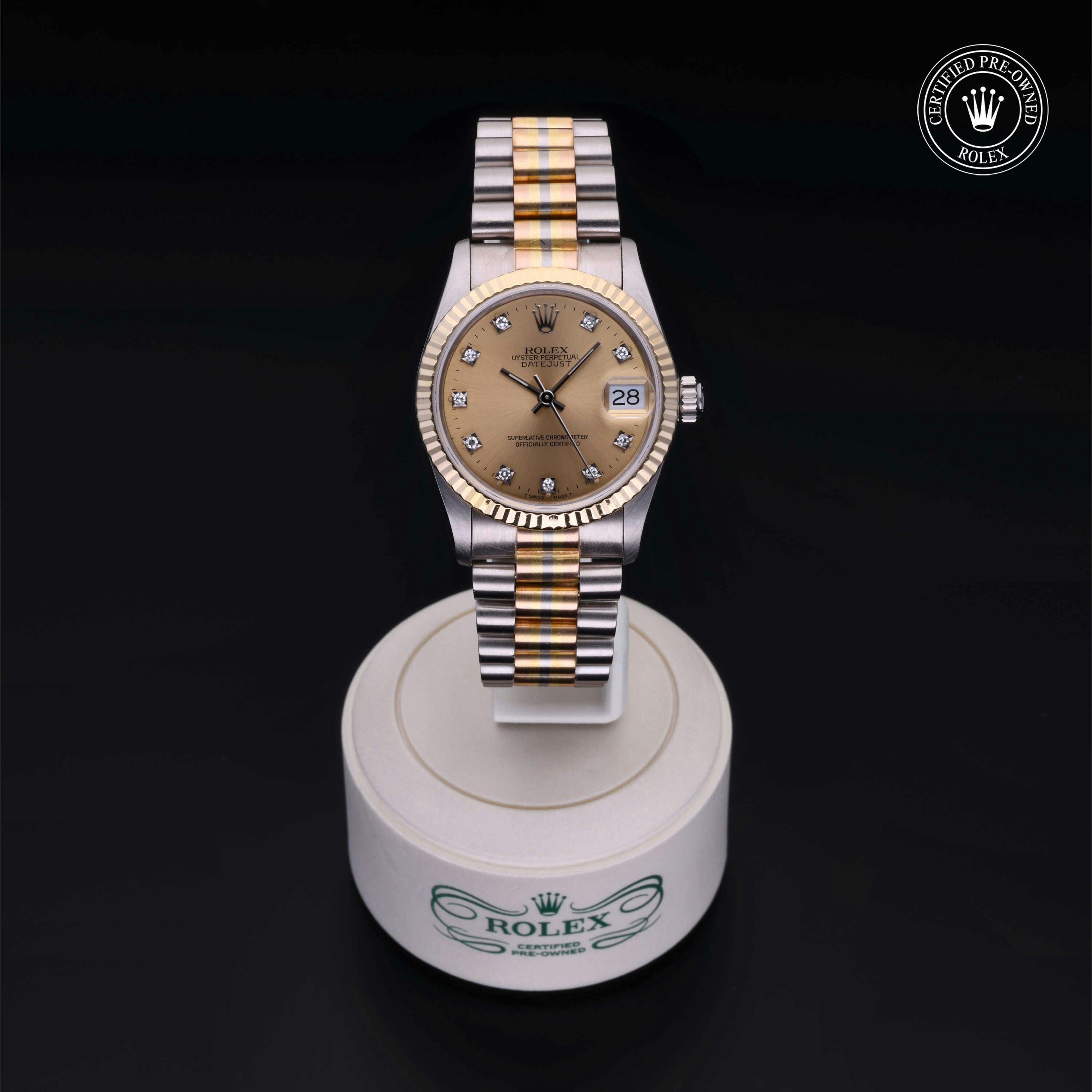 Rolex Certified Pre-Owned Datejust Tridor (68279) self - winding automatic watch, features a 31mm 18k white gold case with an 18k yellow gold fluted bezel surrounding a champagne diamond set dial on an 18k white, yellow and rose gold Tridor president bracelet. Functions include hours, minutes, seconds and date. This watch has received Rolex-authorized service and certification. It does not come with the original box or papers, but includes a custom Rolex Certified Pre-Owned hang tag, travel pouch and RCPO international warranty card.