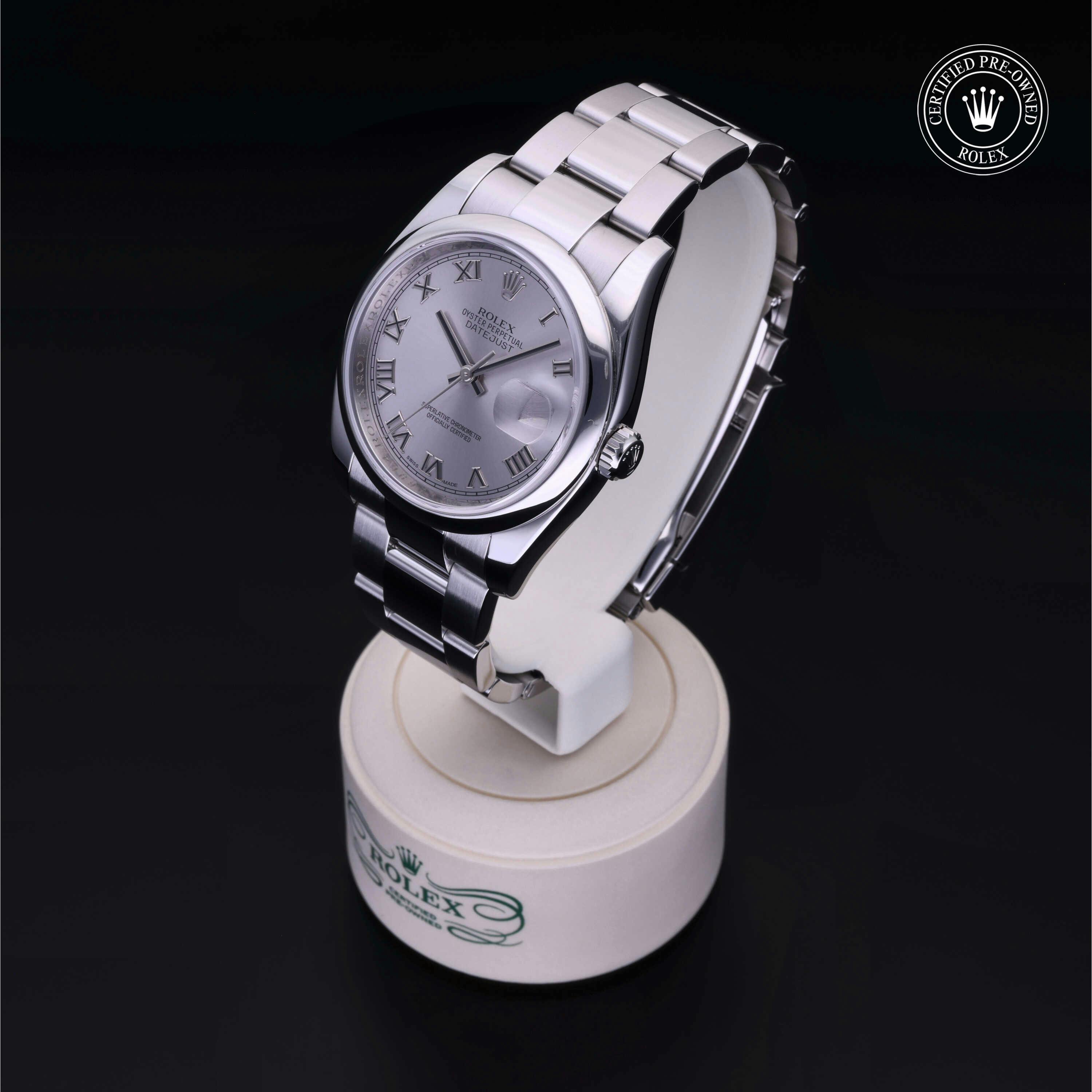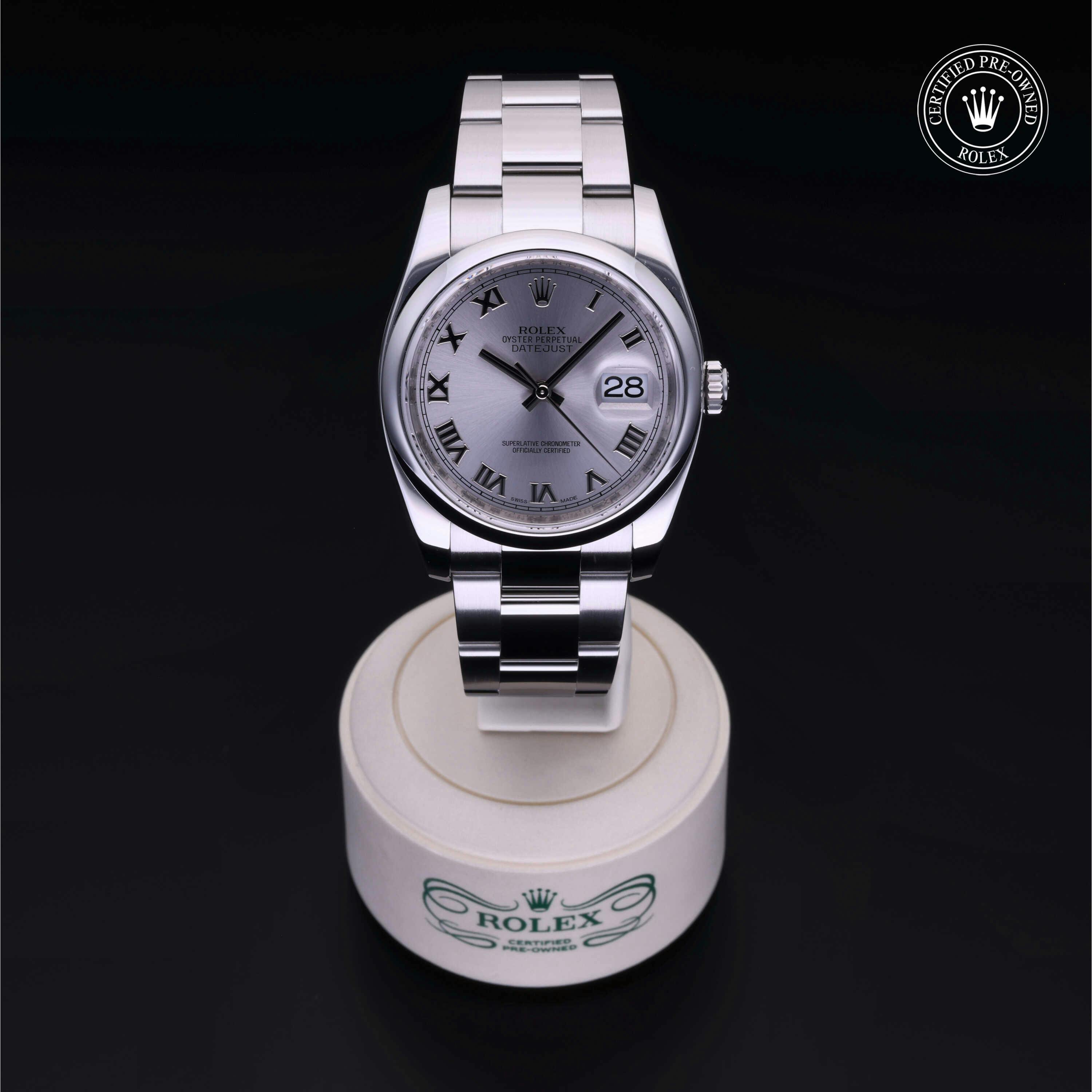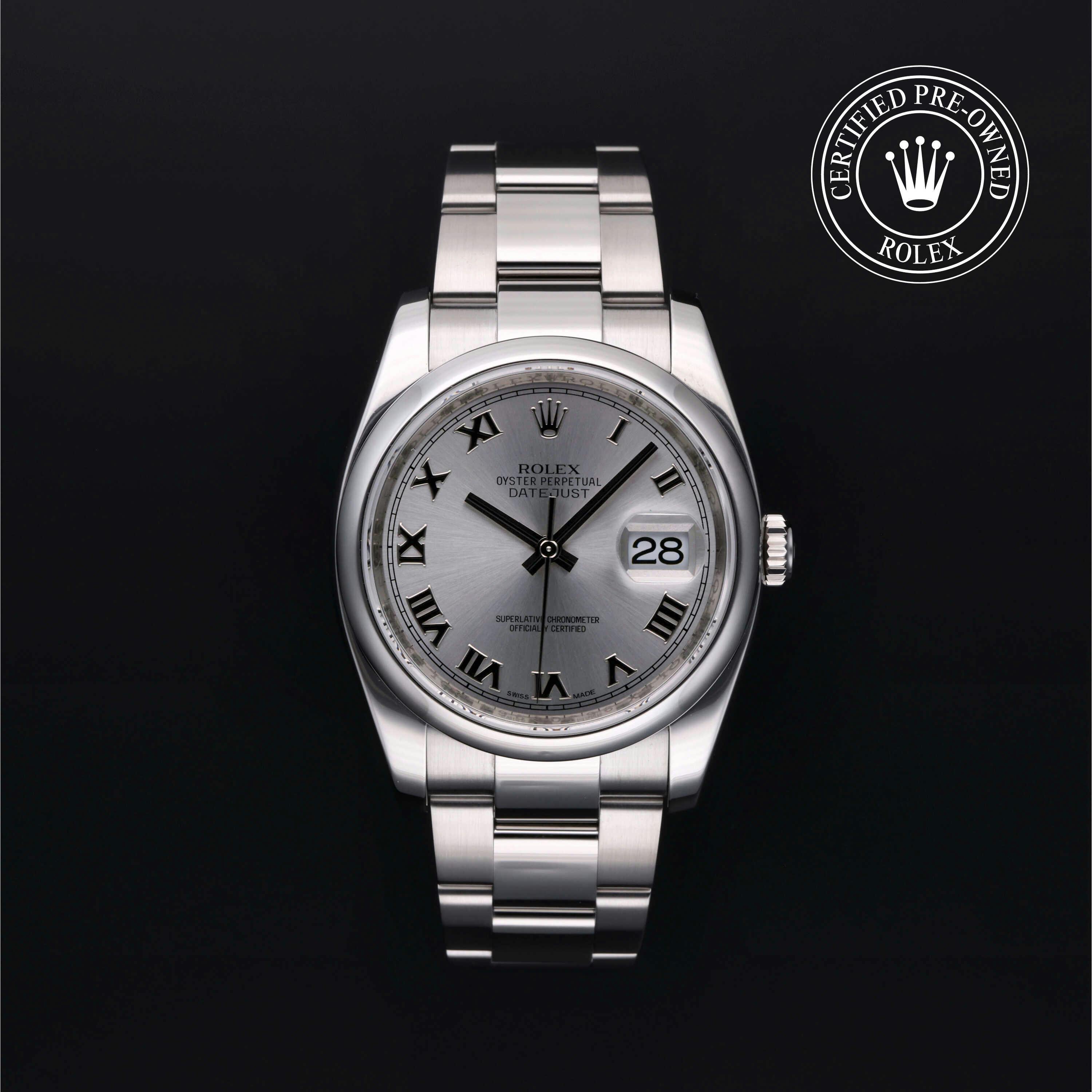 Rolex Certified Pre-Owned Datejust (116200) self - winding automatic watch, features a 36mm stainless steel case and domed bezel surrounding a rhodium dial on a stainless steel oyster bracelet. Functions include hours, minutes, seconds and date. This watch has received Rolex-authorized service and certification. It does not come with the original box or papers, but includes a custom Rolex Certified Pre-Owned hang tag, travel pouch and RCPO international warranty card.