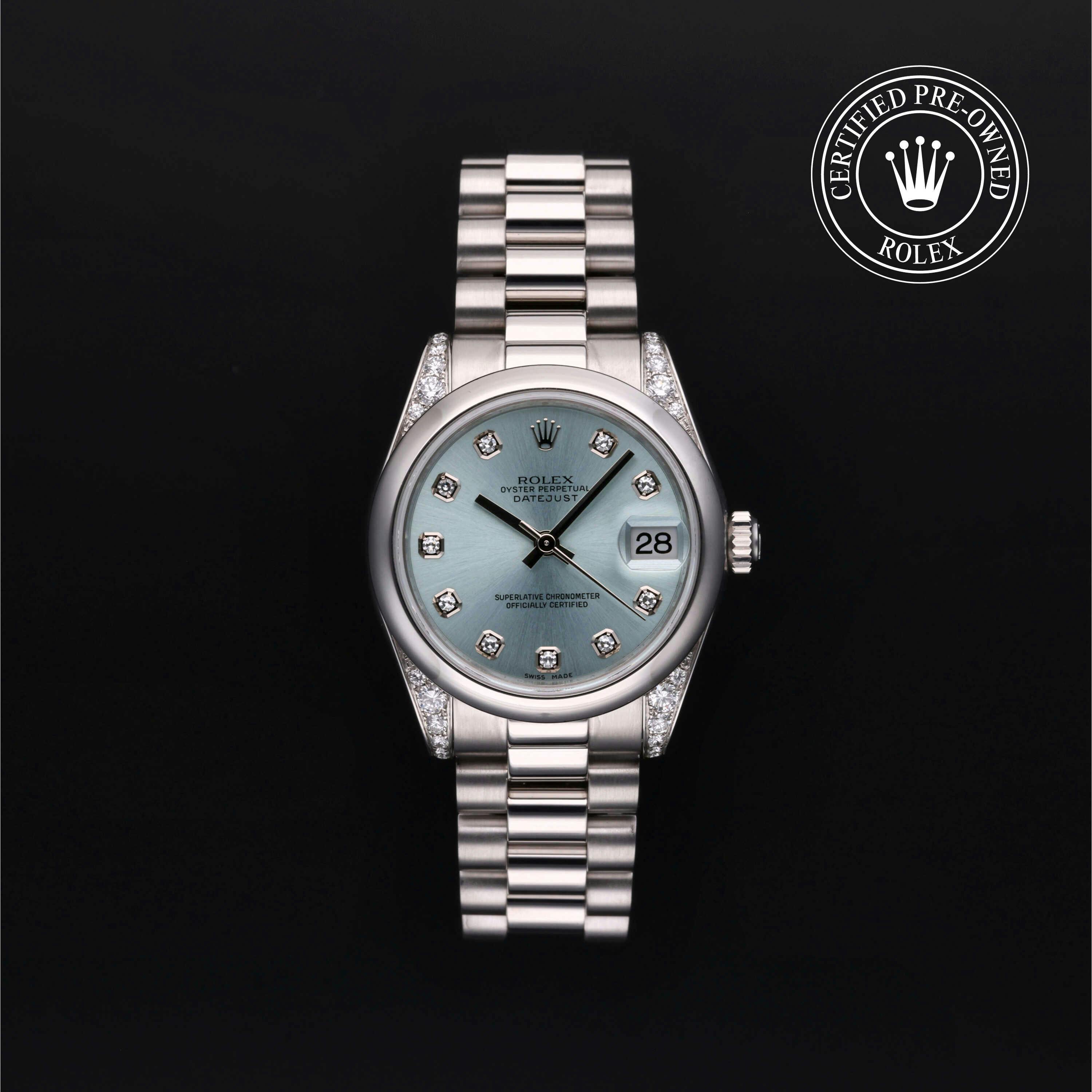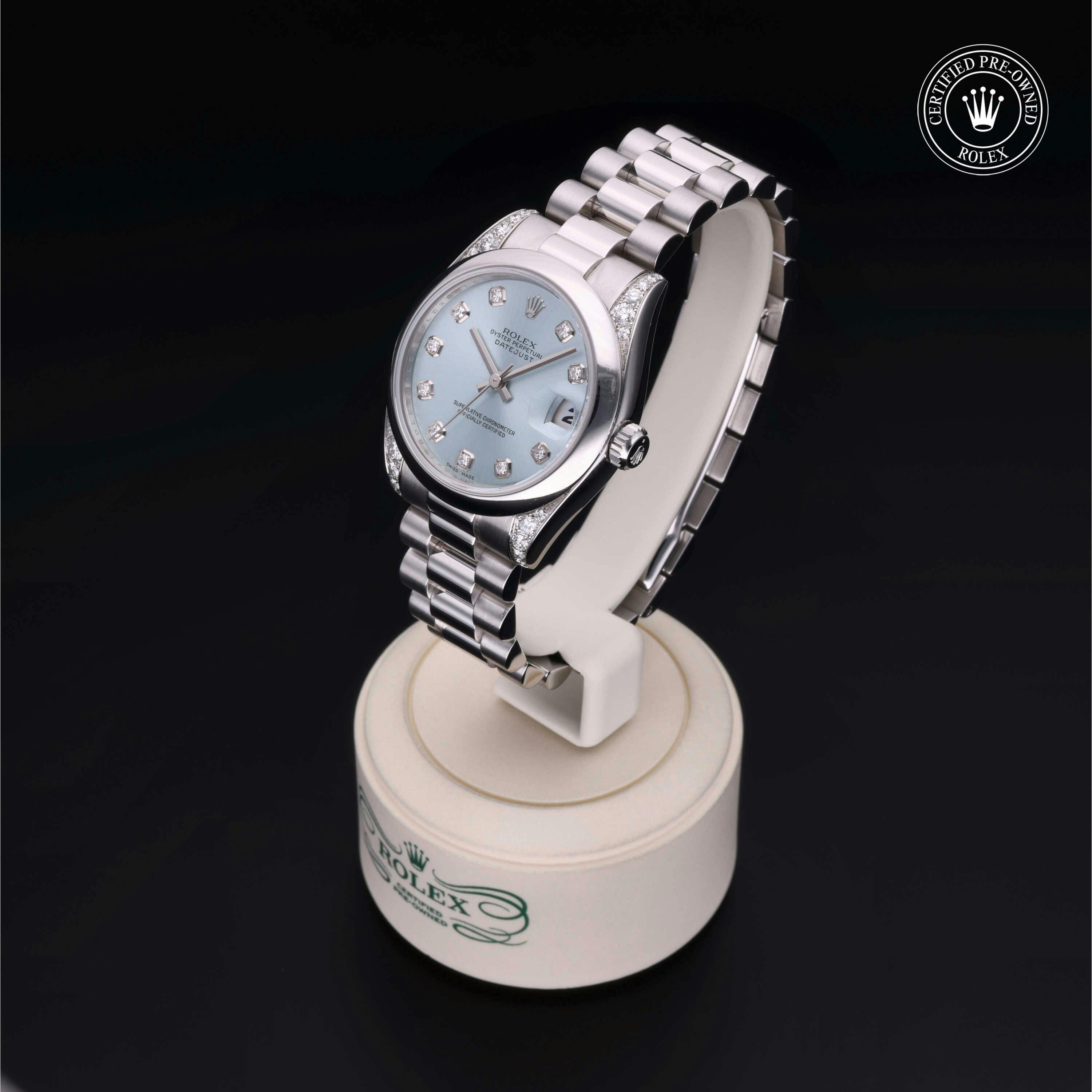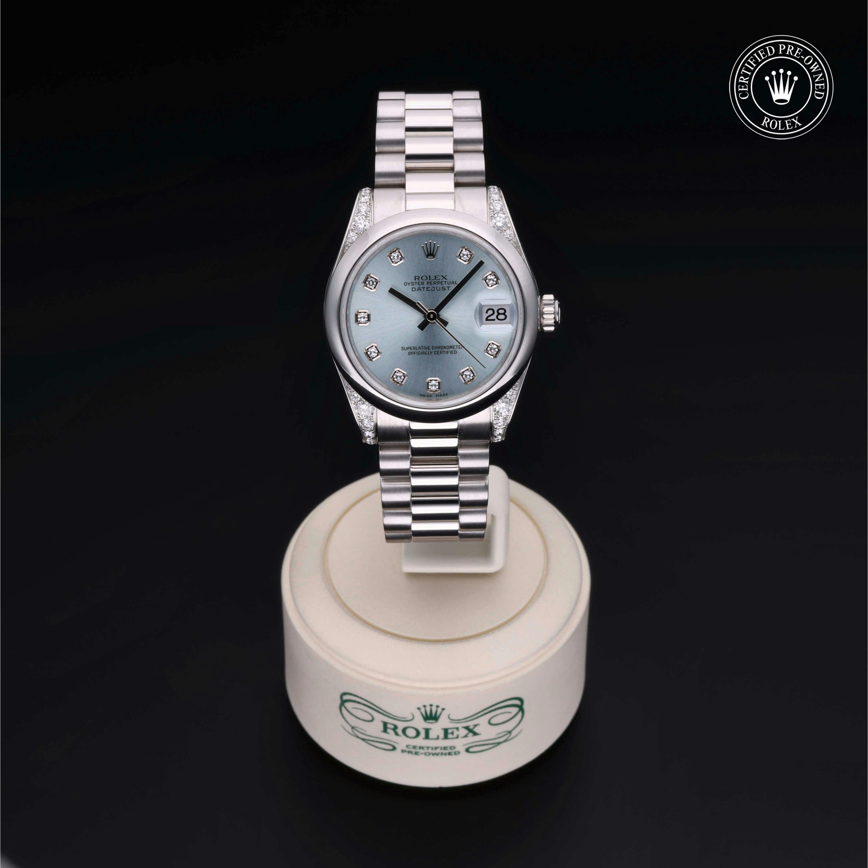 Rolex Certified Pre-Owned Datejust (178296) self - winding automatic watch, features a 31mm platinum diamond set case and domed bezel surrounding an ice blue diamond set dial on a platinum president bracelet. Functions include hours and minutes. This watch has received Rolex-authorized service and certification. It comes with the original box and papers, and includes a custom Rolex Certified Pre-Owned hang tag, travel pouch and RCPO international warranty card.