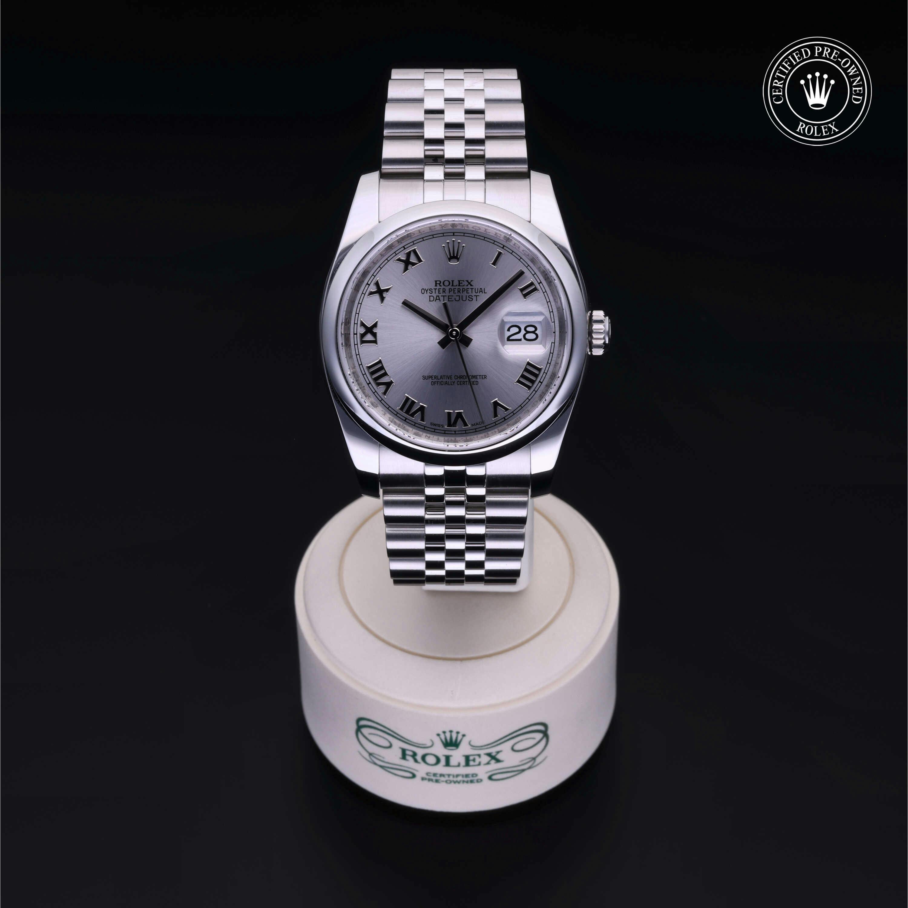 Rolex Certified Pre-Owned Datejust (116200) self - winding automatic watch, features a 36mm stainless steel case and domed bezel surrounding a rhodium dial on a stainless steel jubilee bracelet. Functions include hours, minutes, seconds and date. This watch has received Rolex-authorized service and certification. It comes with the original papers, and includes a custom Rolex Certified Pre-Owned hang tag, travel pouch and RCPO international warranty card.