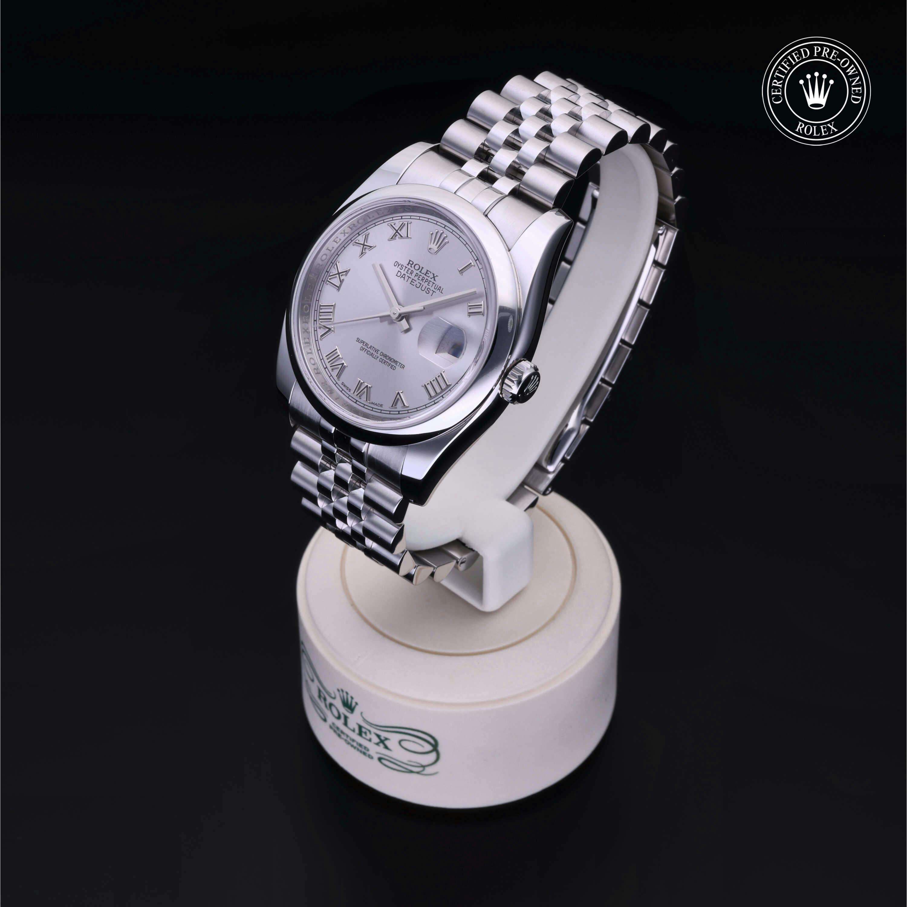 Rolex Certified Pre-Owned Datejust (116200) self - winding automatic watch, features a 36mm stainless steel case and domed bezel surrounding a rhodium dial on a stainless steel jubilee bracelet. Functions include hours, minutes, seconds and date. This watch has received Rolex-authorized service and certification. It comes with the original papers, and includes a custom Rolex Certified Pre-Owned hang tag, travel pouch and RCPO international warranty card.