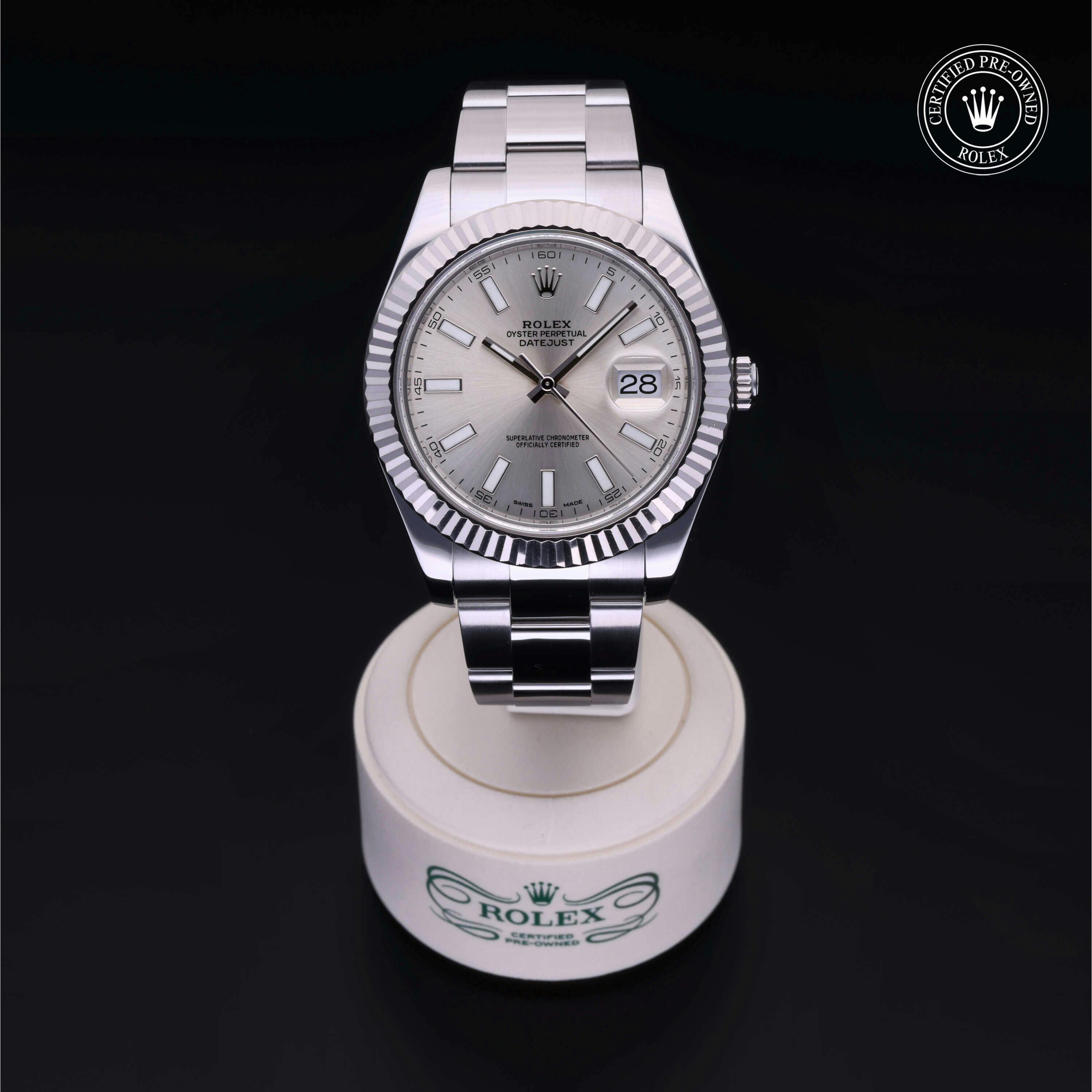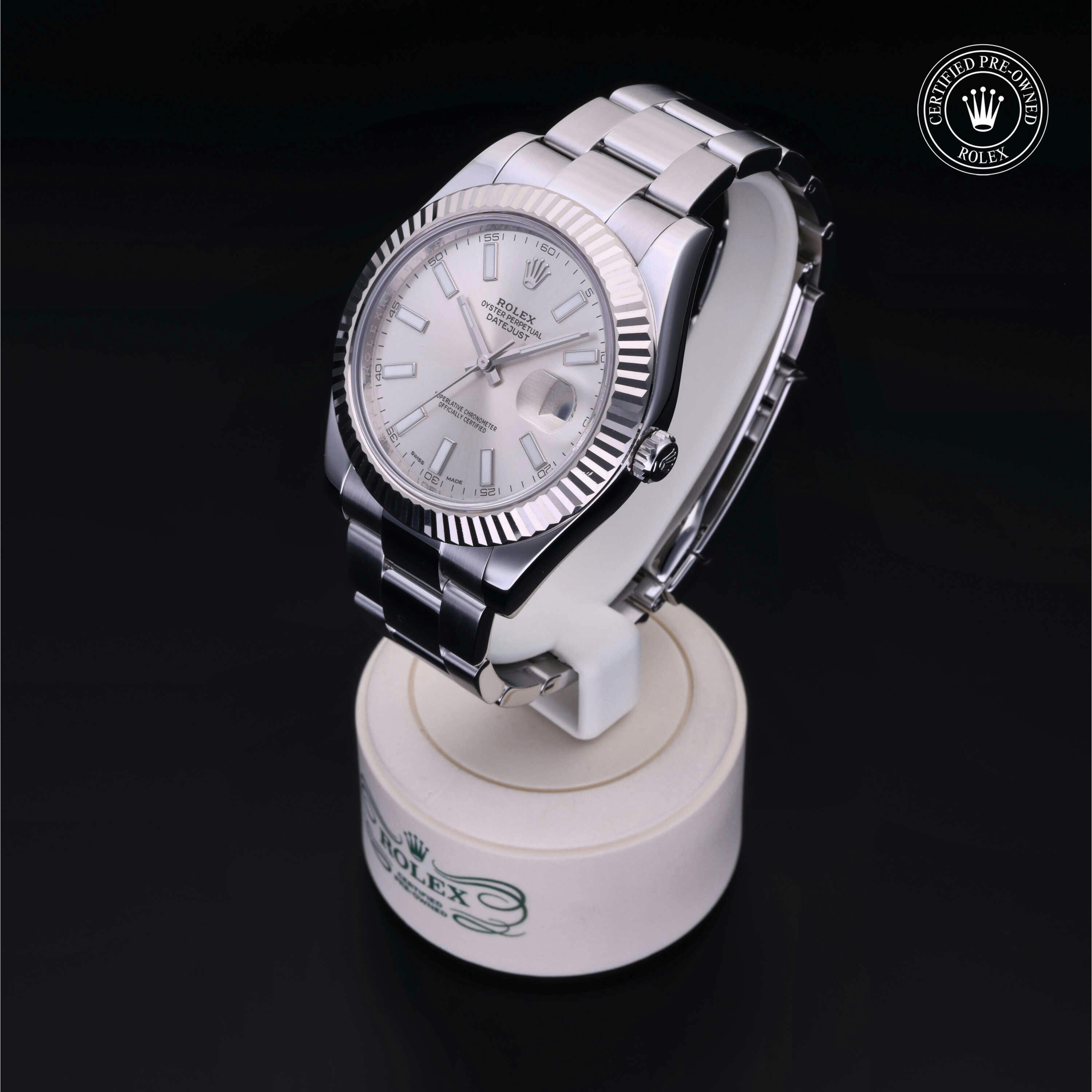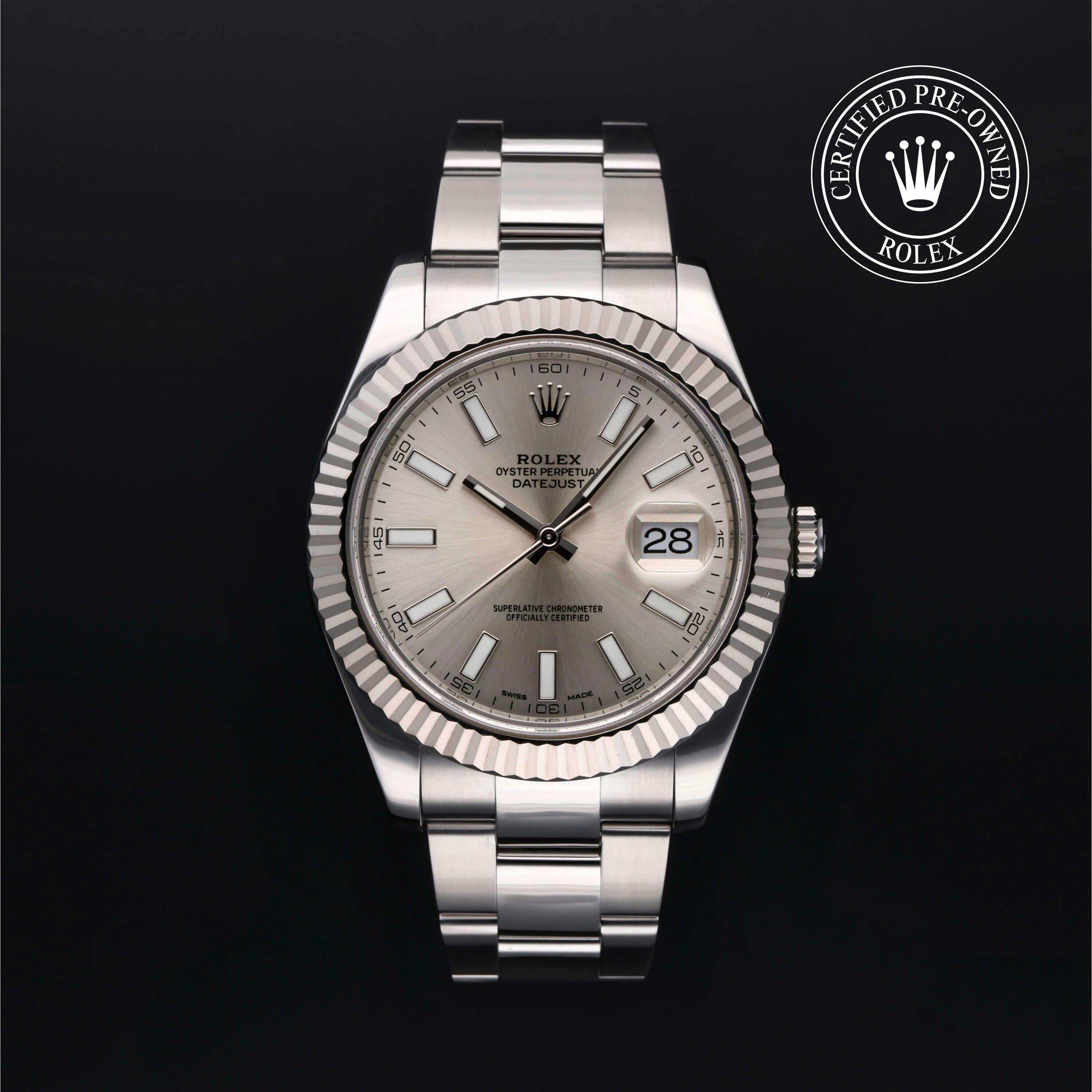Rolex Certified Pre-Owned Datejust II (116334) self - winding automatic watch, features a 41mm stainless steel case with an 18k white gold fluted bezel surrounding a silver dial on a stainless steel oyster bracelet. Functions include hours, minutes, seconds and date. This watch has received Rolex-authorized service and certification. It does not come with the original box or papers, but includes a custom Rolex Certified Pre-Owned hang tag, travel pouch and RCPO international warranty card.