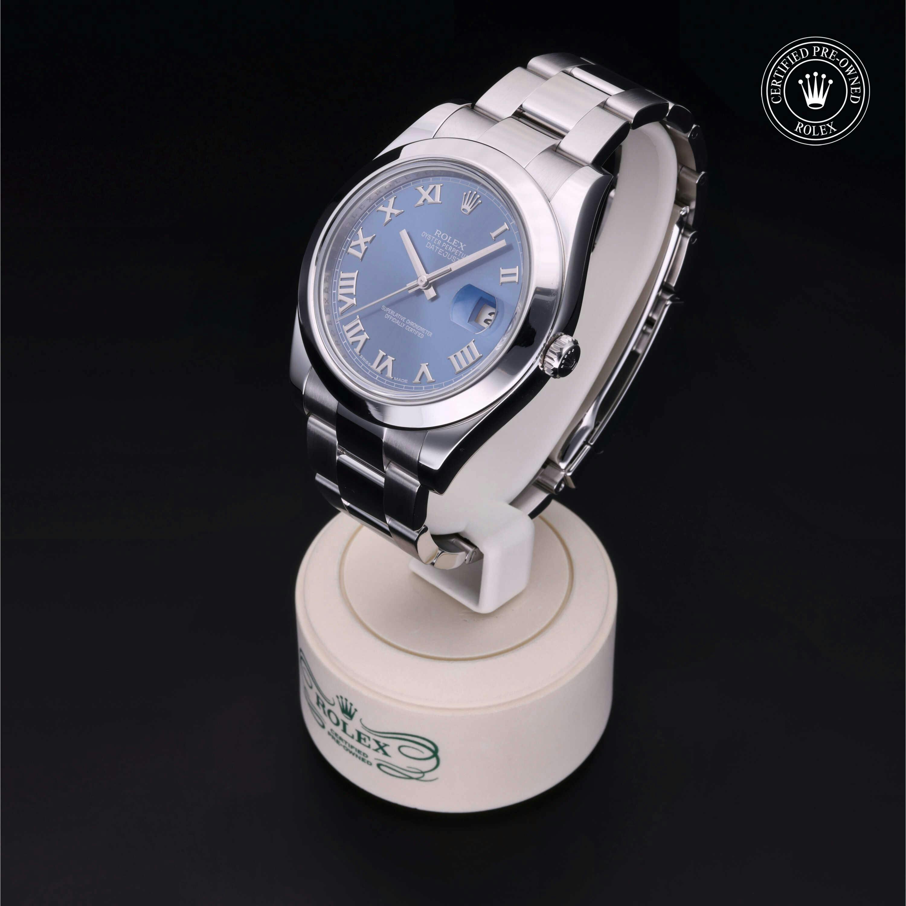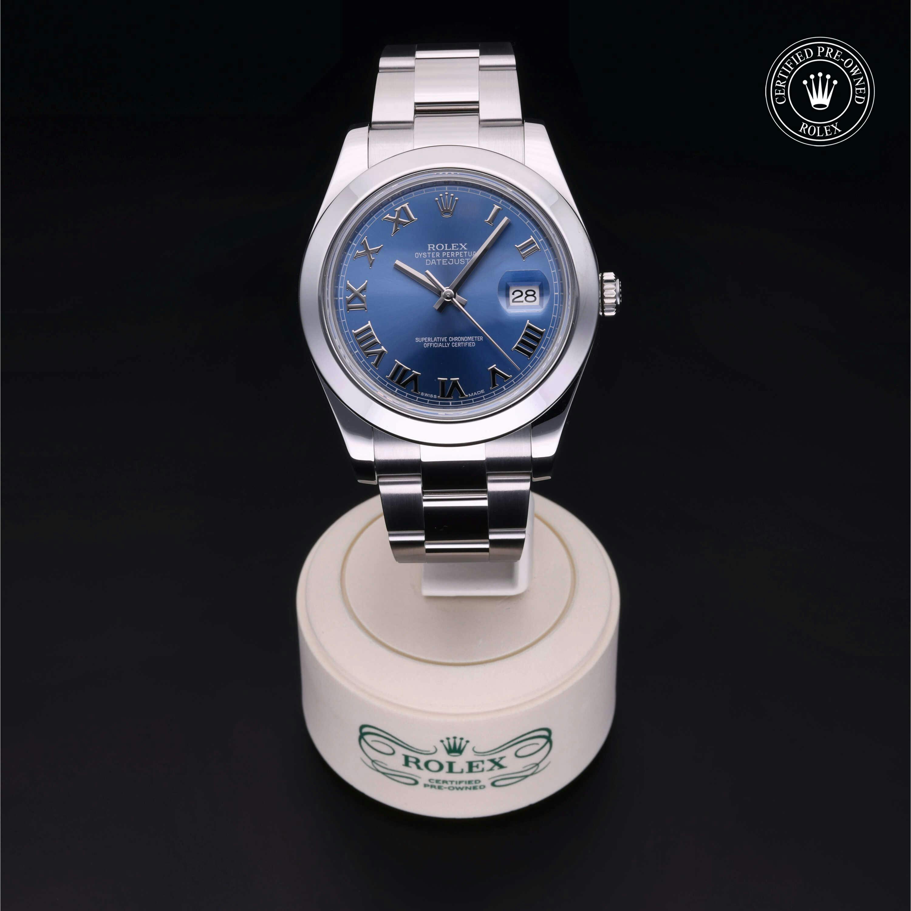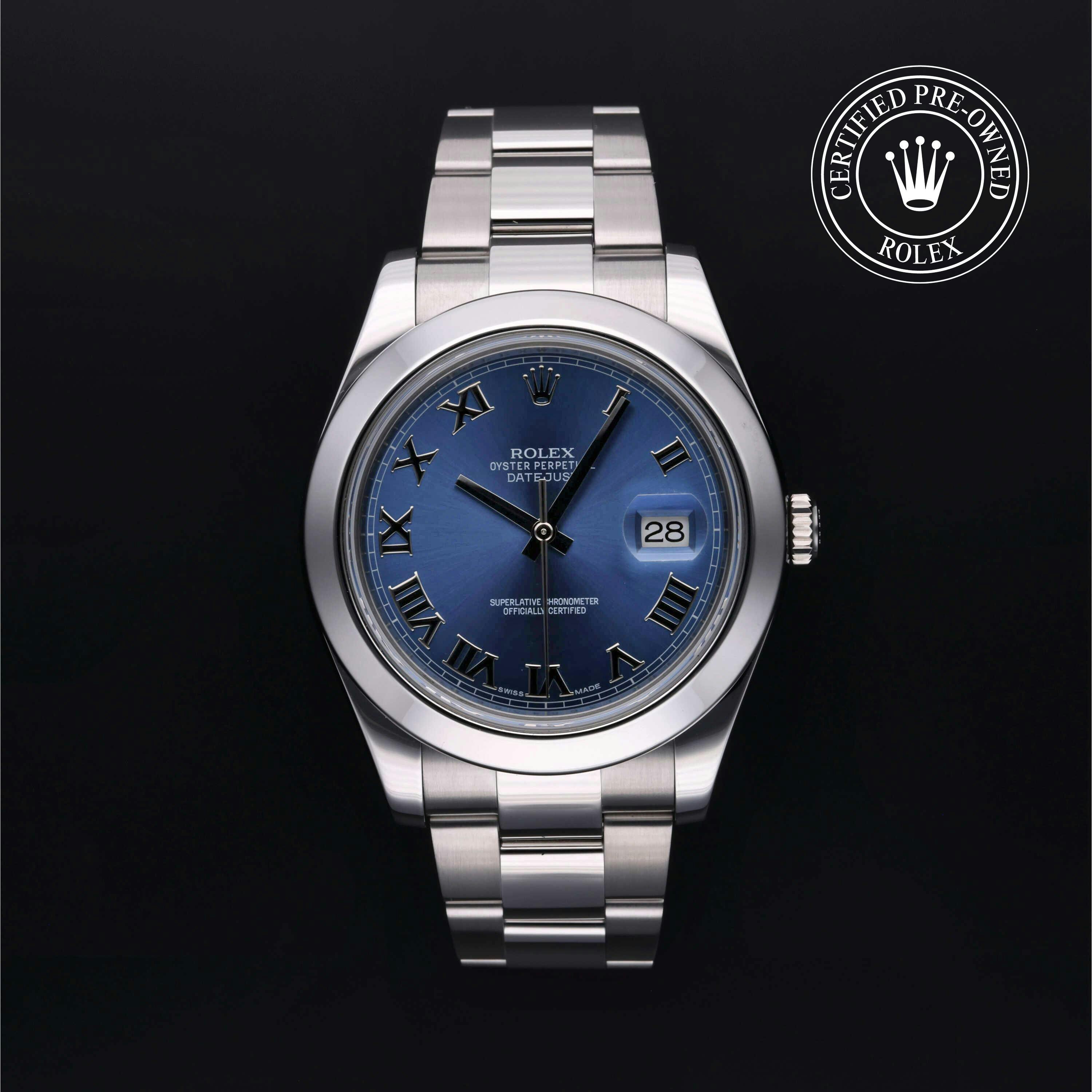 Rolex Certified Pre-Owned Datejust II (116300) self - winding automatic watch, features a 41mm stainless steel case and smooth bezel surrounding an Azzurro blue dial on a stainless steel oyster bracelet. Functions include hours, minutes, seconds and date. This watch has received Rolex-authorized service and certification. It does not come with the original box or papers, but includes a custom Rolex Certified Pre-Owned hang tag, travel pouch and RCPO international warranty card.