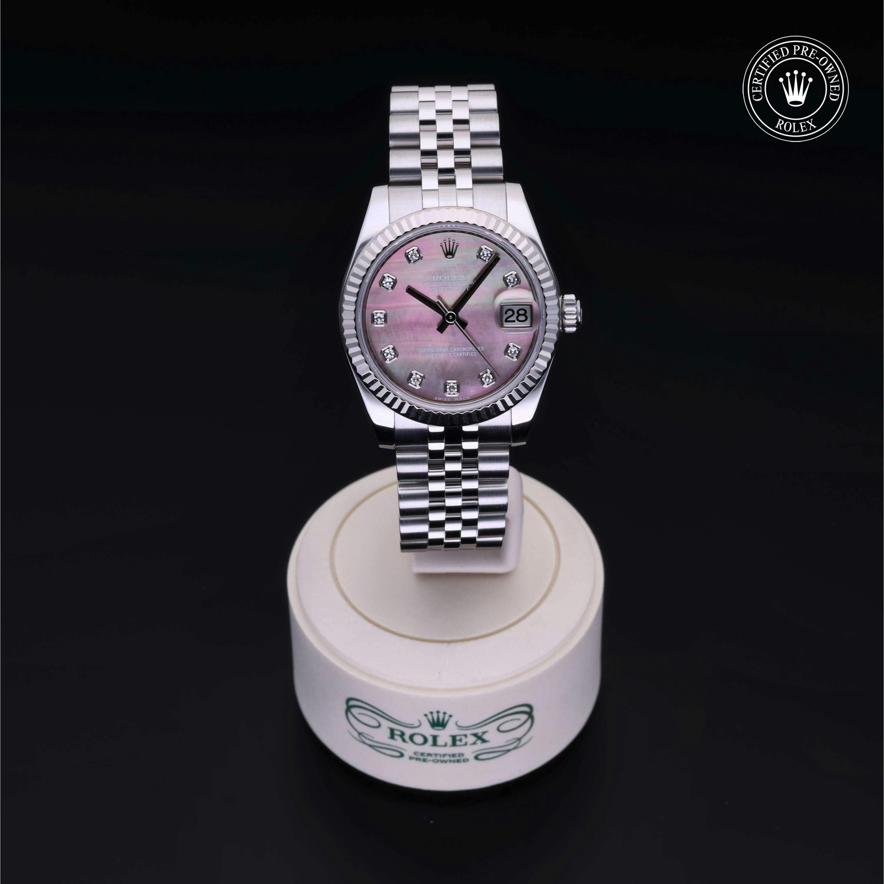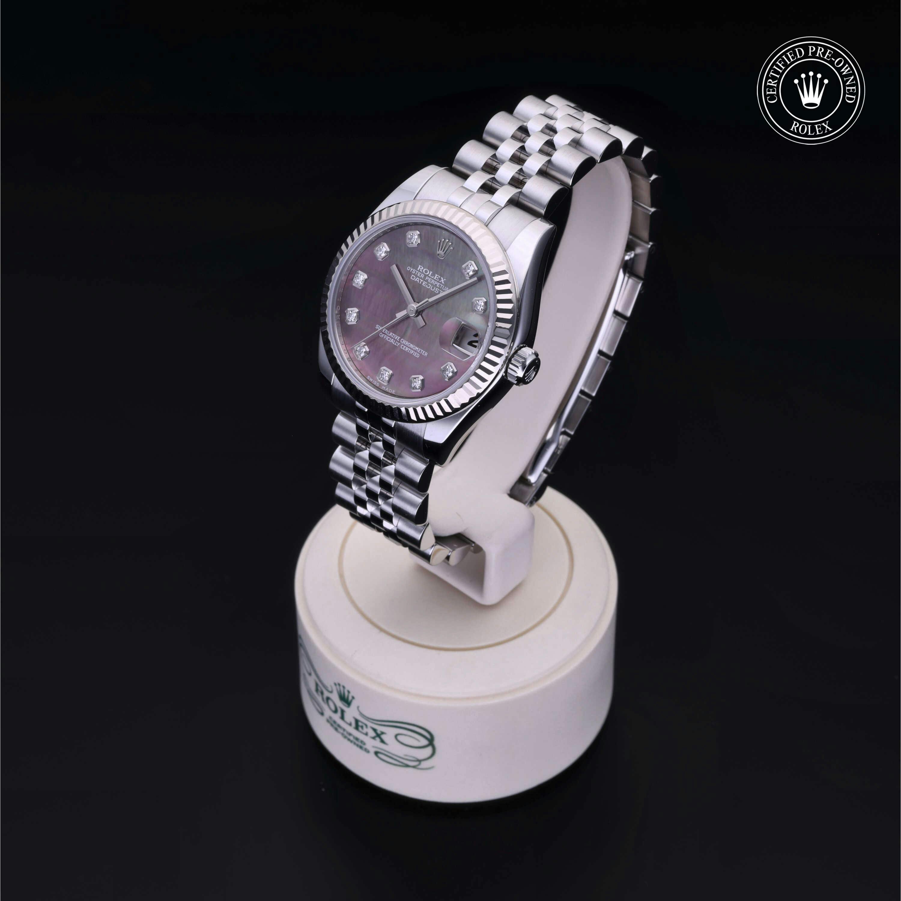 Rolex Certified Pre-Owned Datejust (178274) self - winding automatic watch, features a 31mm stainless steel case with an 18k white gold fluted bezel surrounding a black, mother of pearl diamond set dial on a stainless steel jubilee bracelet. Functions include hours, minutes, seconds and date. This watch has received Rolex-authorized service and certification. It comes with the original box and papers, and includes a custom Rolex Certified Pre-Owned hang tag, travel pouch and RCPO international warranty card.