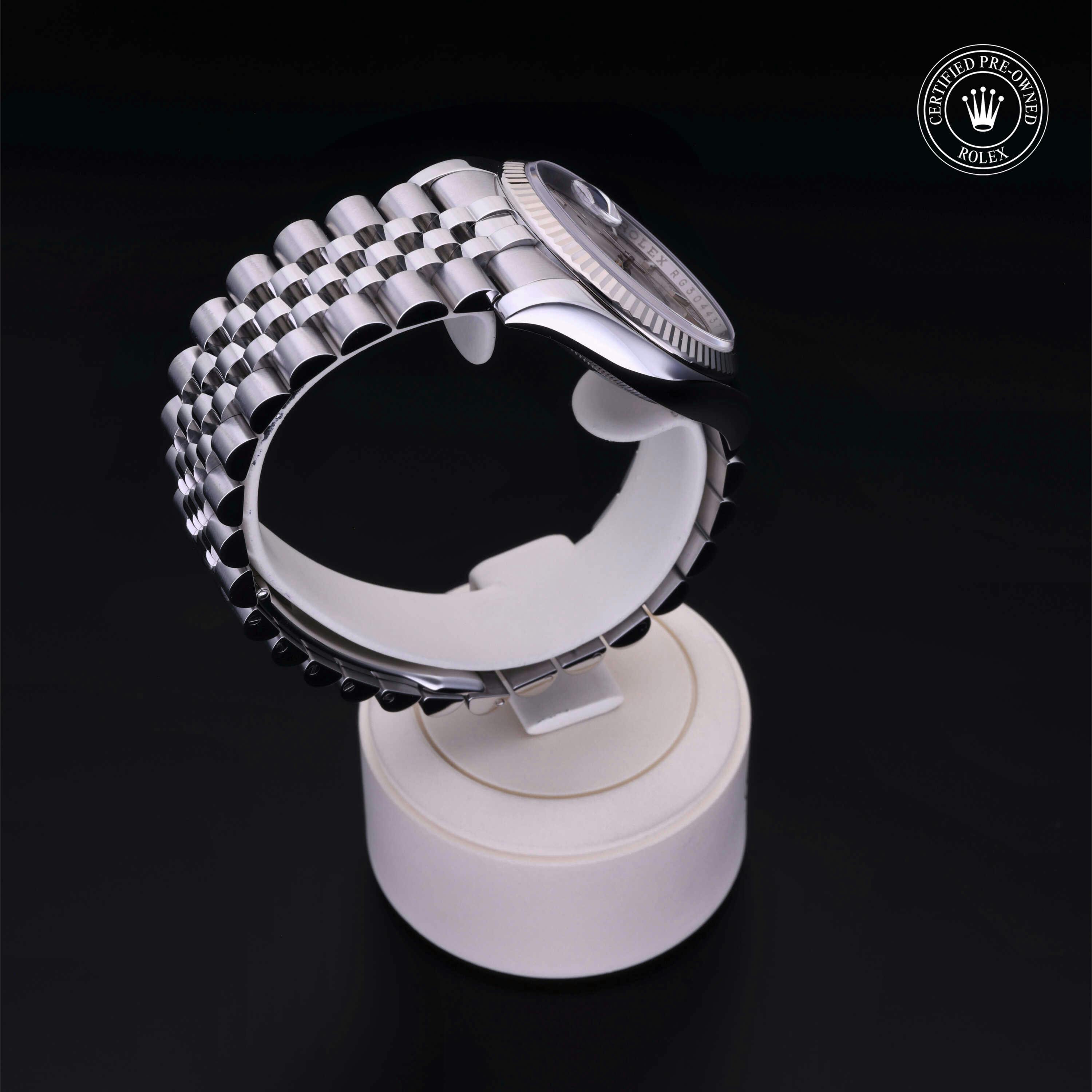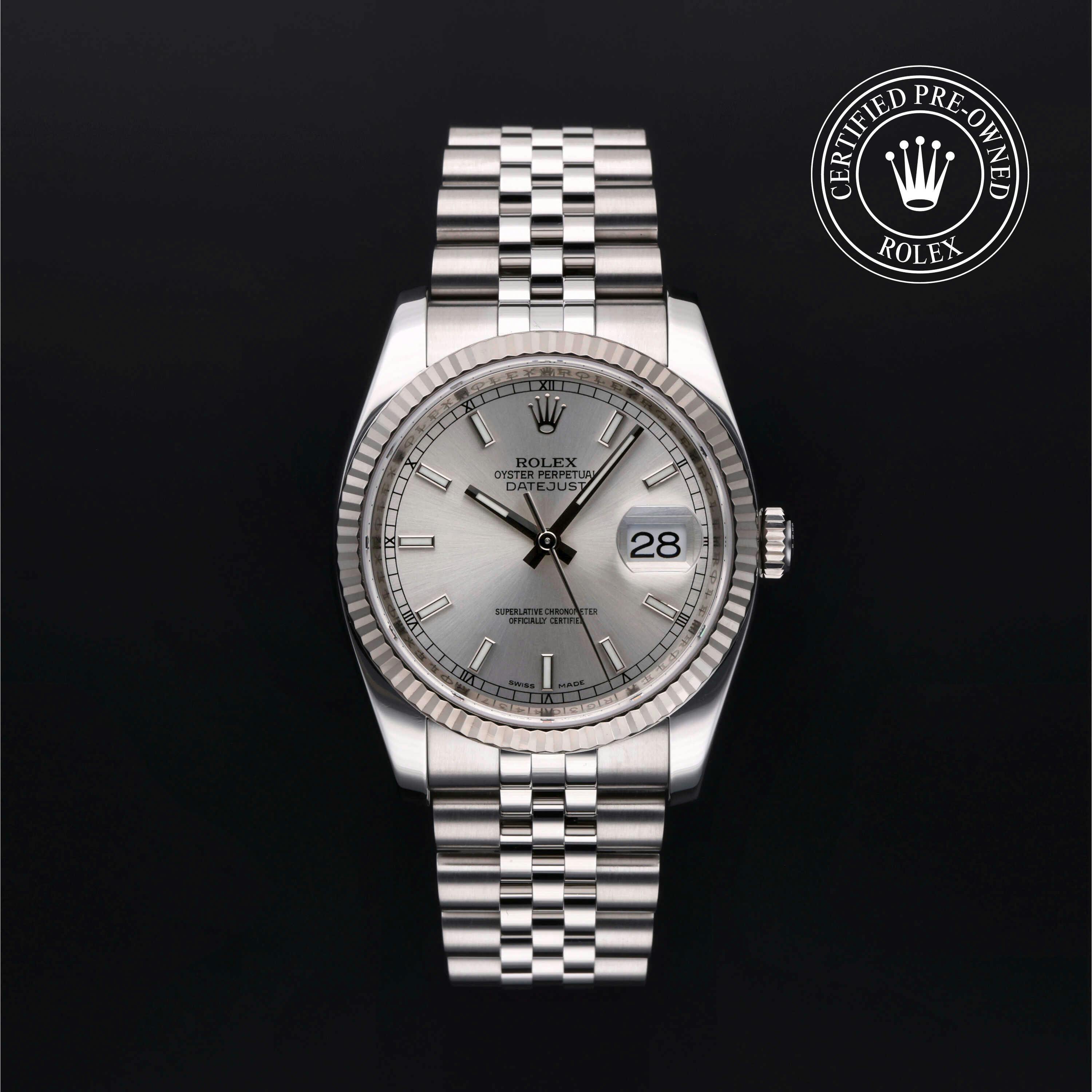 Rolex Certified Pre-Owned Datejust (116234) self - winding automatic watch, features a 36mm stainless steel case with an 18k white gold fluted bezel surrounding a silver index dial. The watch is secured on a stainless steel Jubilee bracelet complete with a folding buckle. Functions include hours, minutes, seconds and date. This watch has been serviced by an authorized service center and certified by Rolex. It does not come with the original box or papers, but includes a custom Rolex Certified Pre-Owned hang tag, travel pouch and international warranty card.