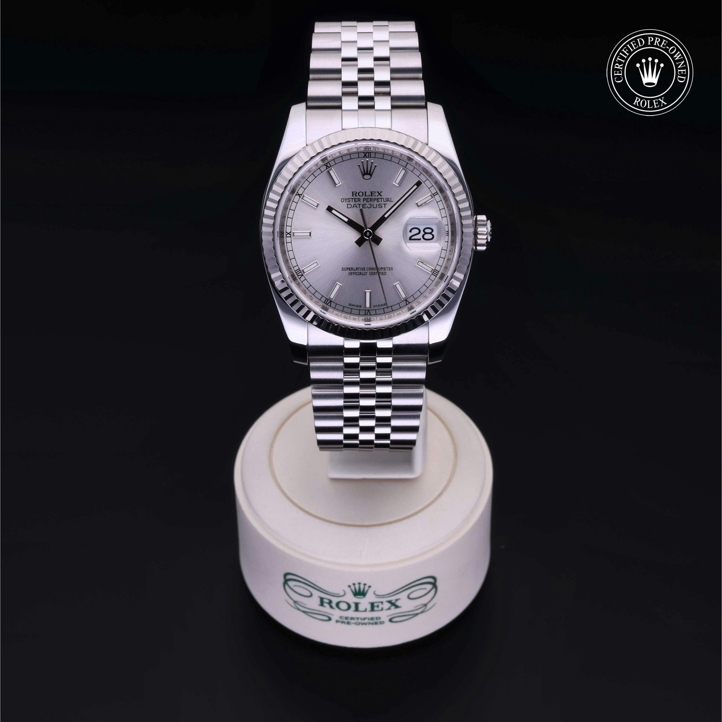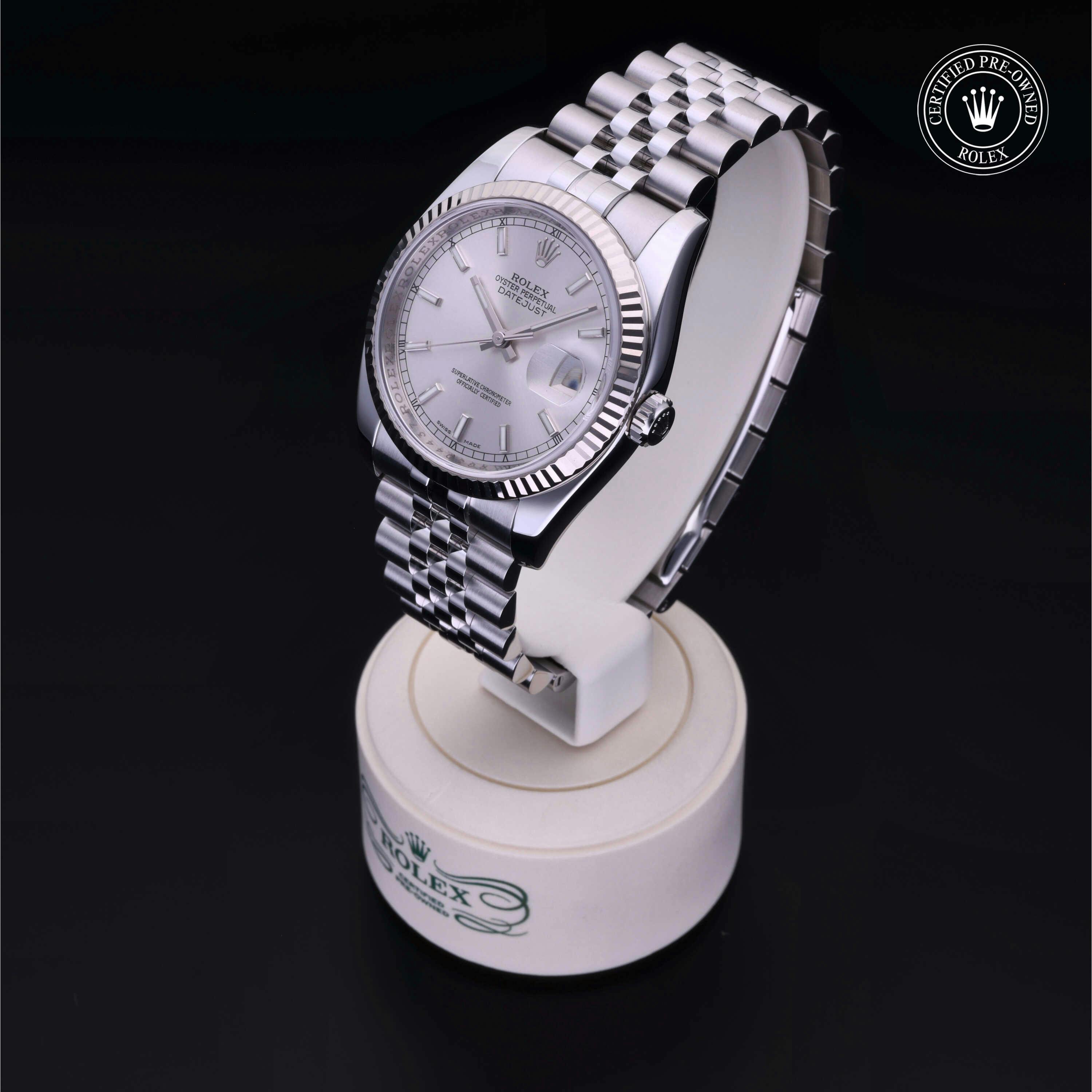 Rolex Certified Pre-Owned Datejust (116234) self - winding automatic watch, features a 36mm stainless steel case with an 18k white gold fluted bezel surrounding a silver index dial. The watch is secured on a stainless steel Jubilee bracelet complete with a folding buckle. Functions include hours, minutes, seconds and date. This watch has been serviced by an authorized service center and certified by Rolex. It does not come with the original box or papers, but includes a custom Rolex Certified Pre-Owned hang tag, travel pouch and international warranty card.