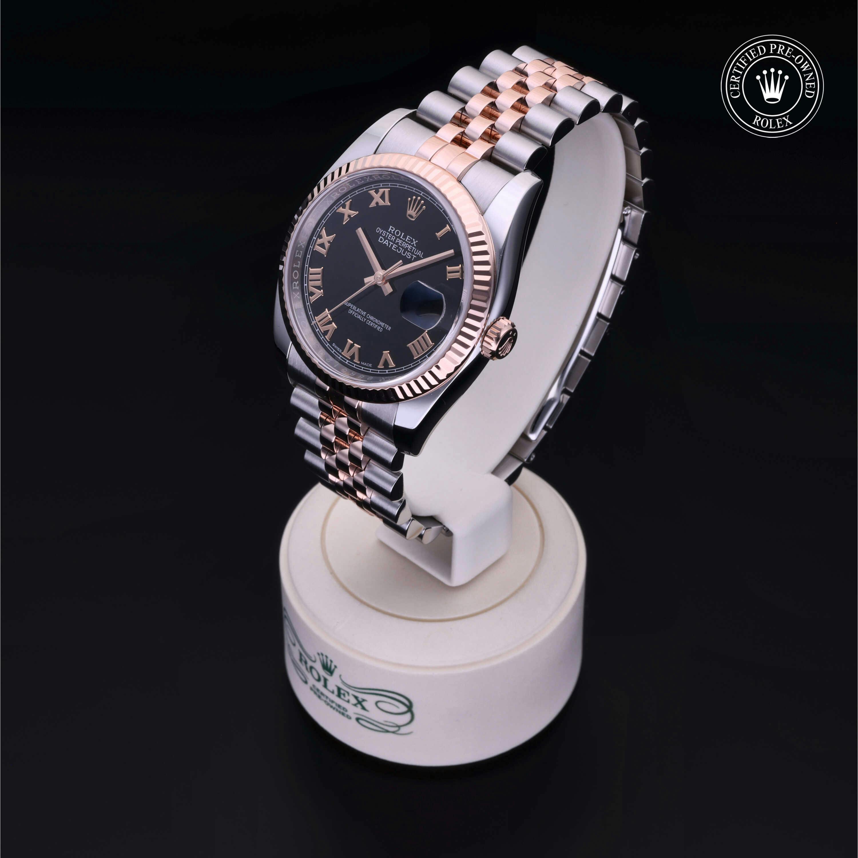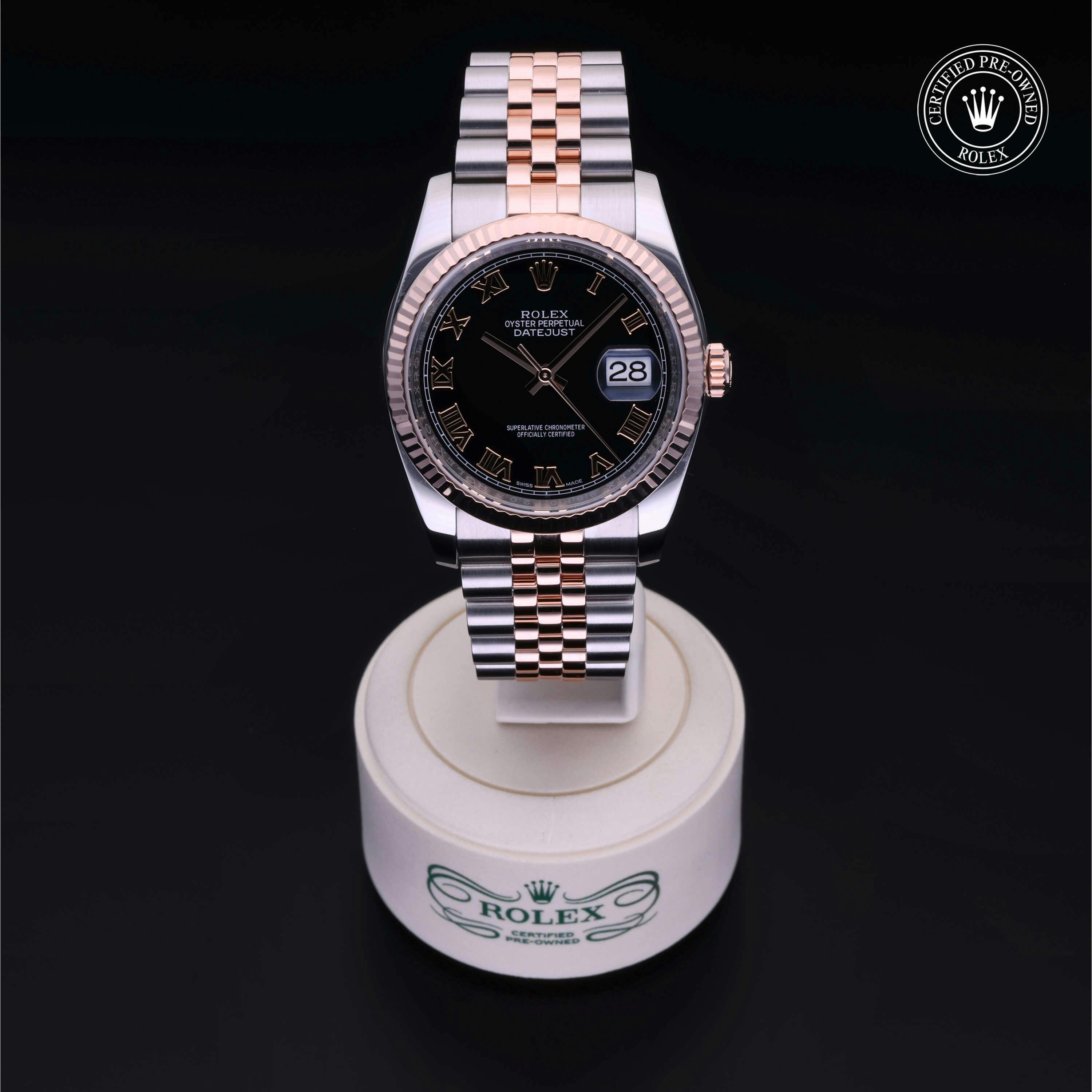 Rolex Certified Pre-Owned Datejust (116231) self - winding automatic watch, features a 36mm stainless steel case with an 18k rose gold fluted bezel surrounding a black dial on a stainless steel and 18k rose gold jubilee bracelet. Functions include hours, minutes, seconds and date. This watch has received Rolex-authorized service and certification. It does not come with the original box or papers, but includes a custom Rolex Certified Pre-Owned hang tag, travel pouch and RCPO international warranty card.
