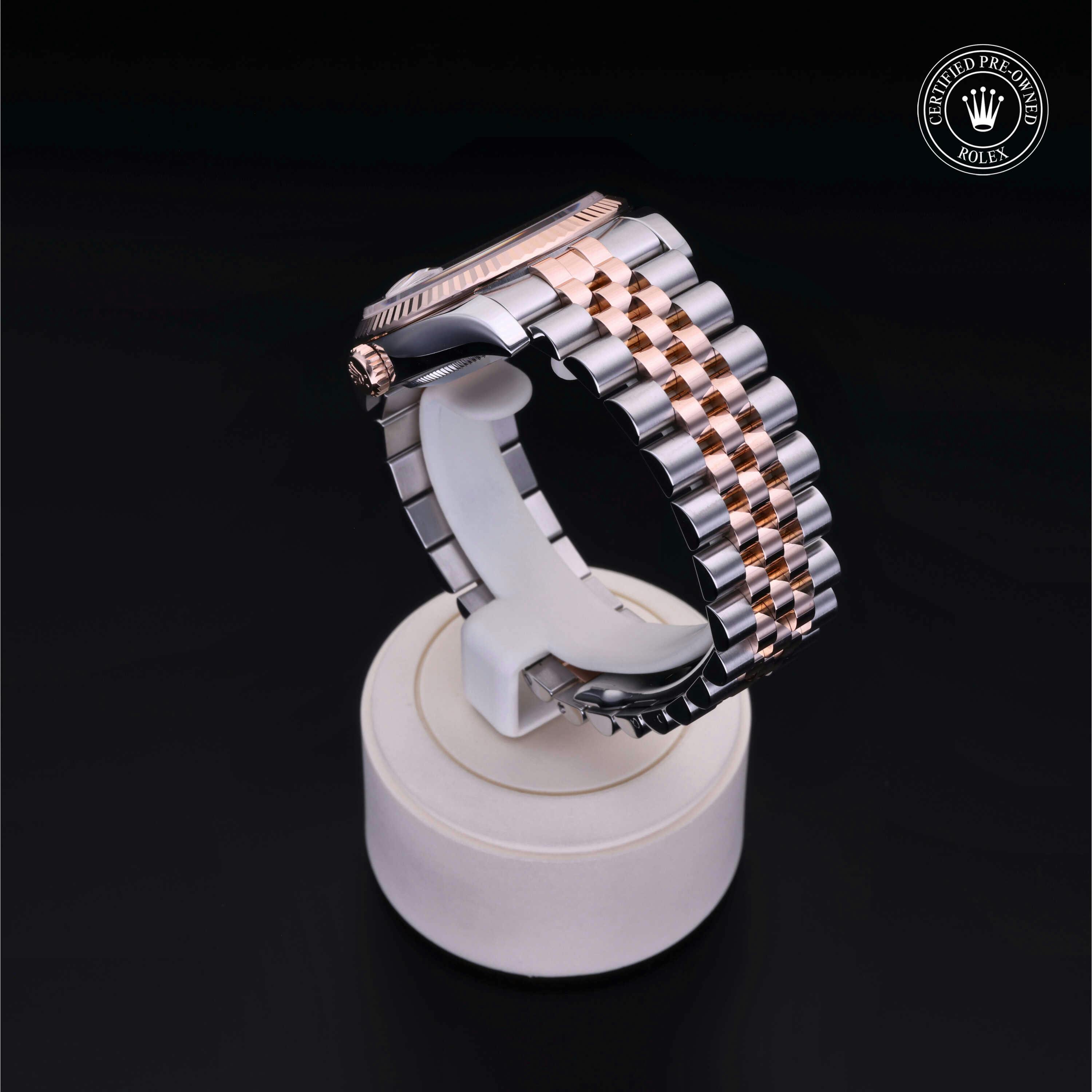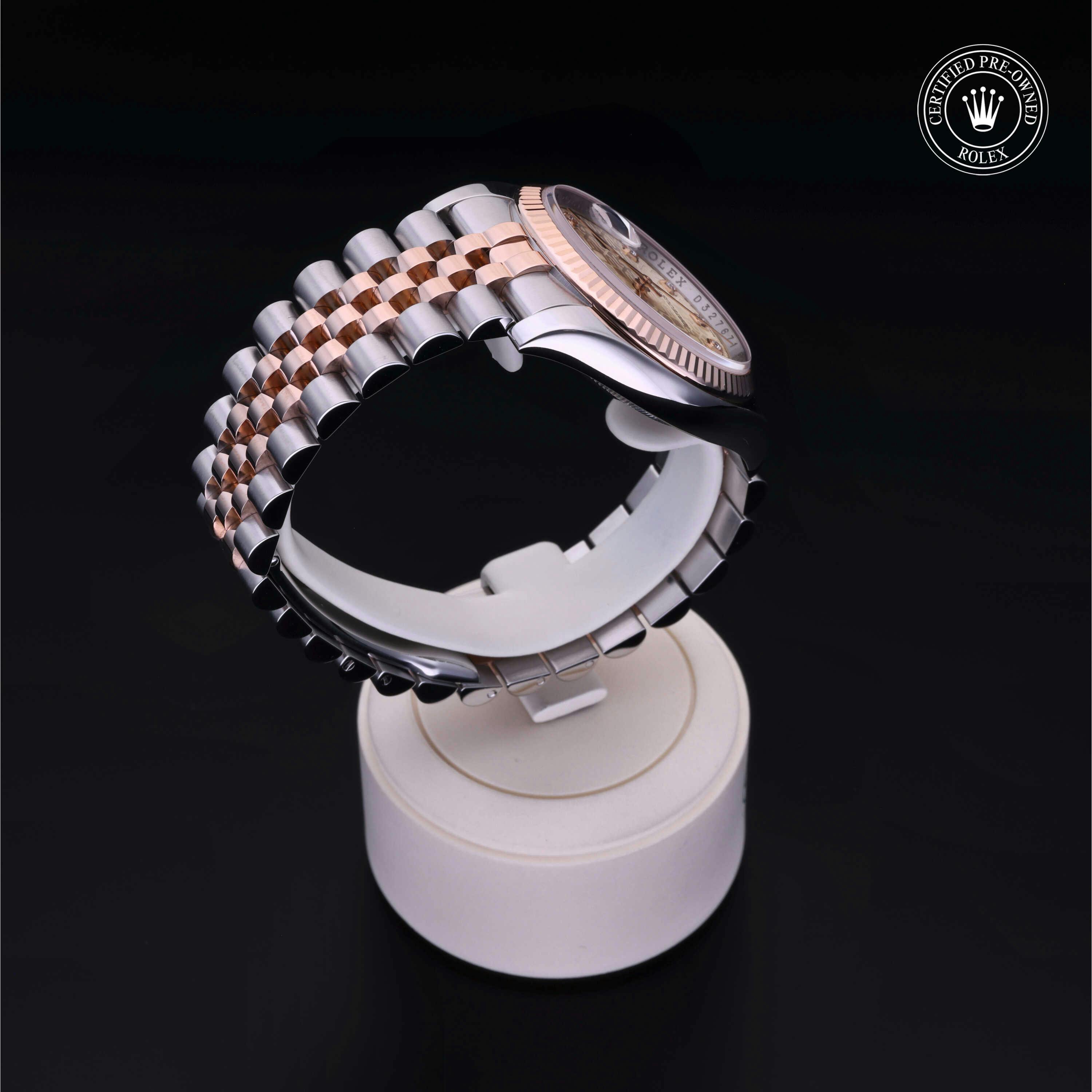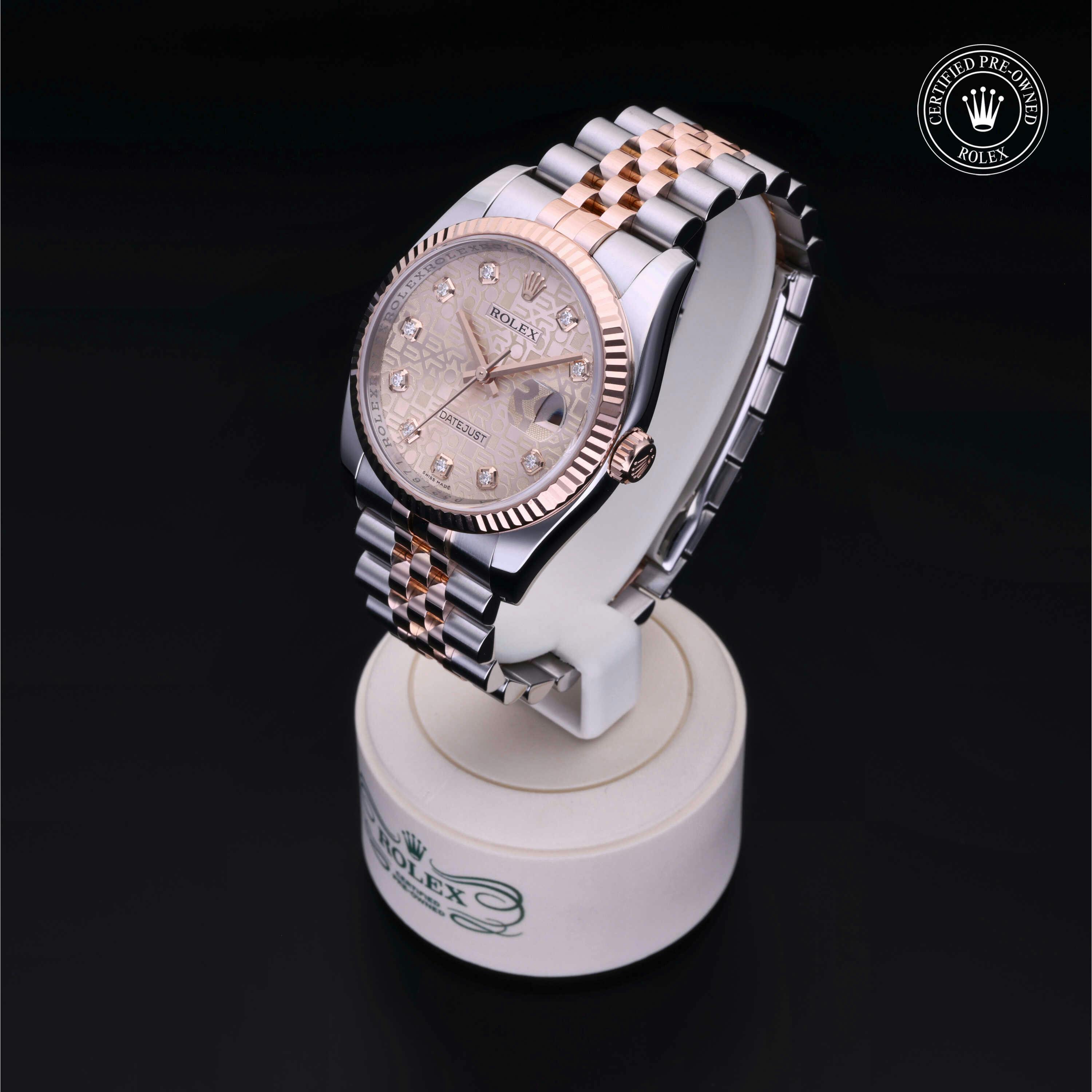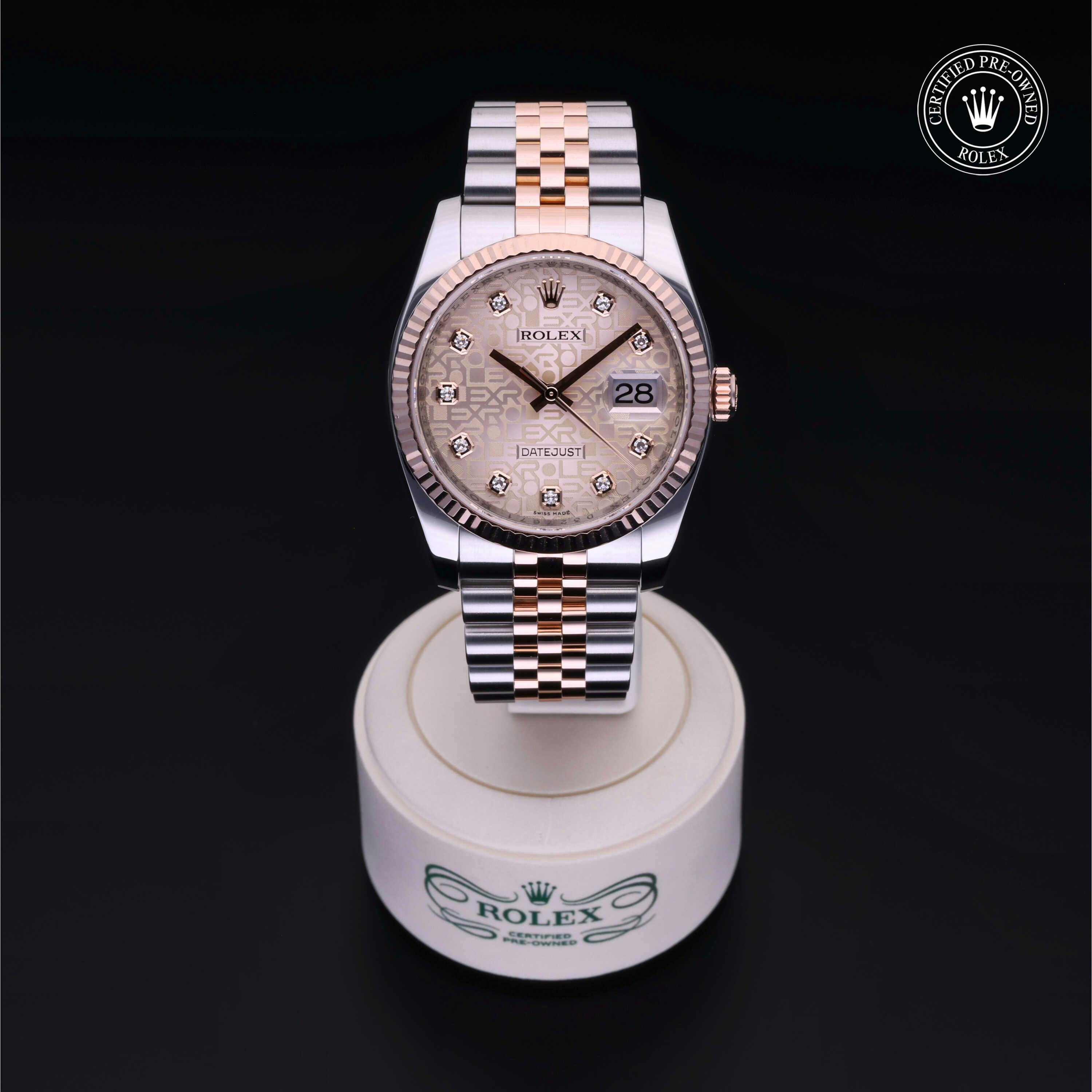 Rolex Certified Pre-Owned Datejust (116231) self - winding automatic watch, features a 36mm stainless steel case with an 18k rose gold fluted bezel surrounding a pink Jubilee diamond set dial. The watch is secured on a stainless steel and 18k rose gold Jubilee bracelet complete with a folding buckle. Functions include hours, minutes, seconds and date. This watch has been serviced by an authorized service center and certified by Rolex. It does not come with the original box or papers, but includes a custom Rolex Certified Pre-Owned hang tag, travel pouch and international warranty card.