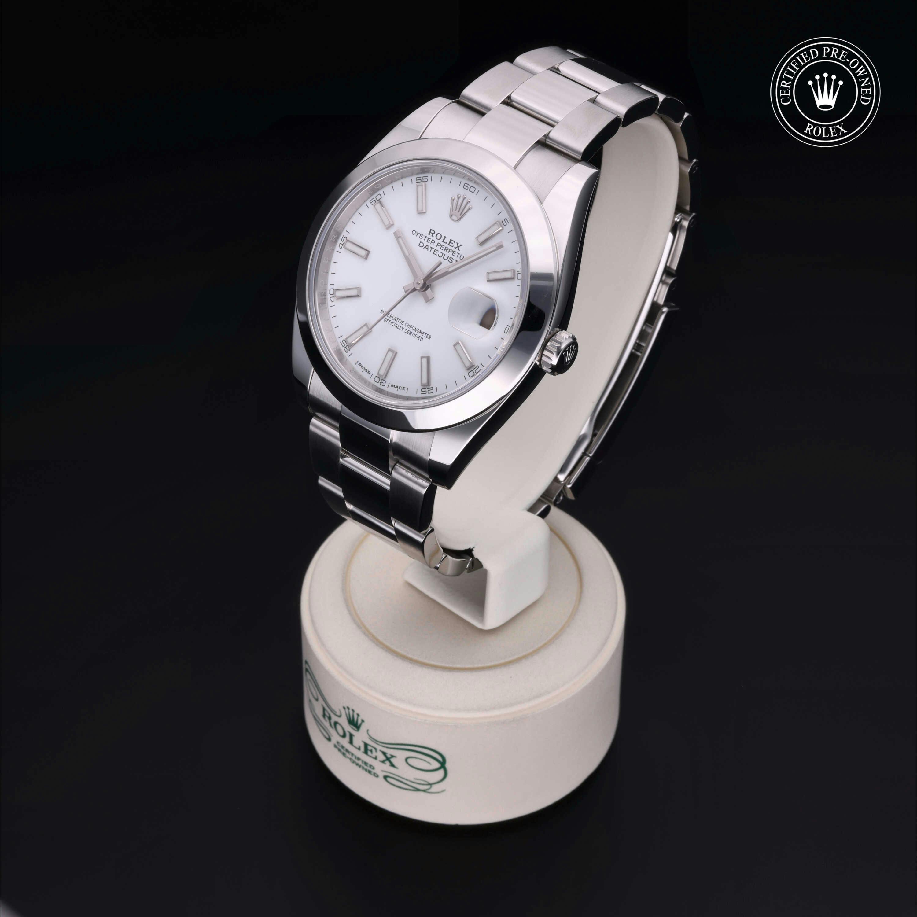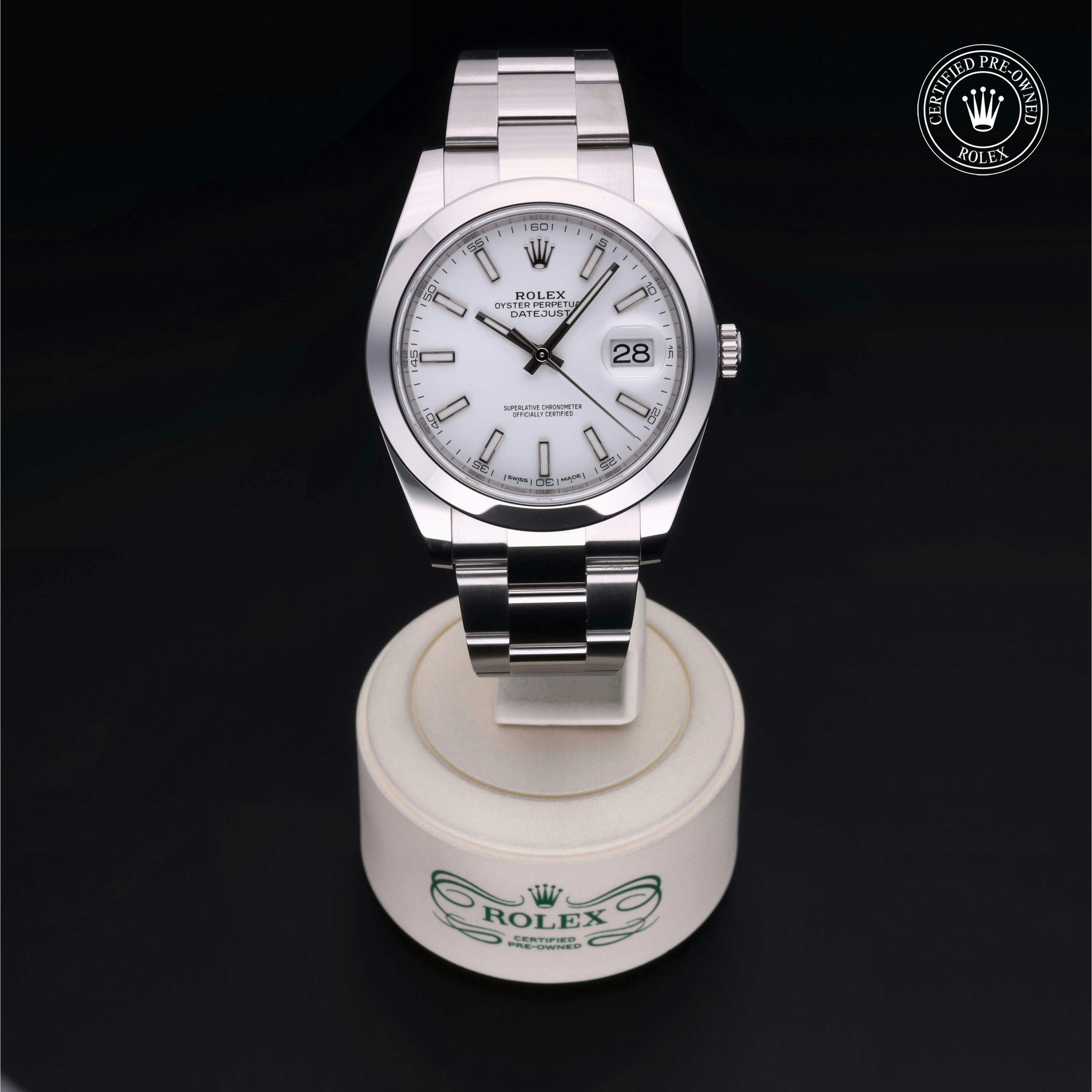 Rolex Certified Pre-owned Datejust (126300) self - winding automatic watch, features a 41mm stainless steel case with a smooth bezel surrounding a white index dial. The watch is secured on a stainless steel Oyster bracelet complete with a folding buckle. Functions include hours, minutes, seconds and date. This watch has been received Rolex-authorized service and certified by Rolex. It comes with papers, and includes a custom Rolex Certified Pre-Owned hang tag, travel pouch and international warranty card.