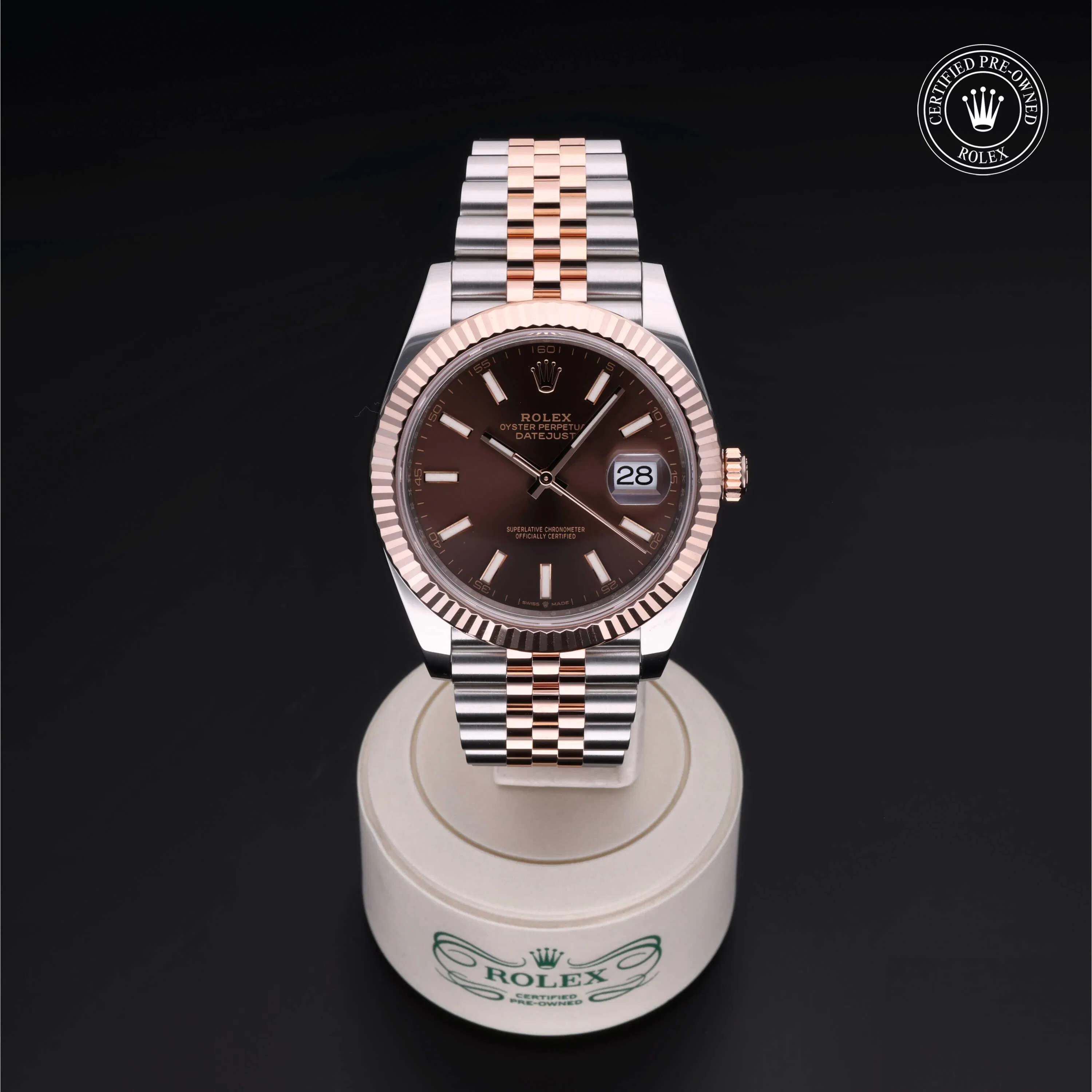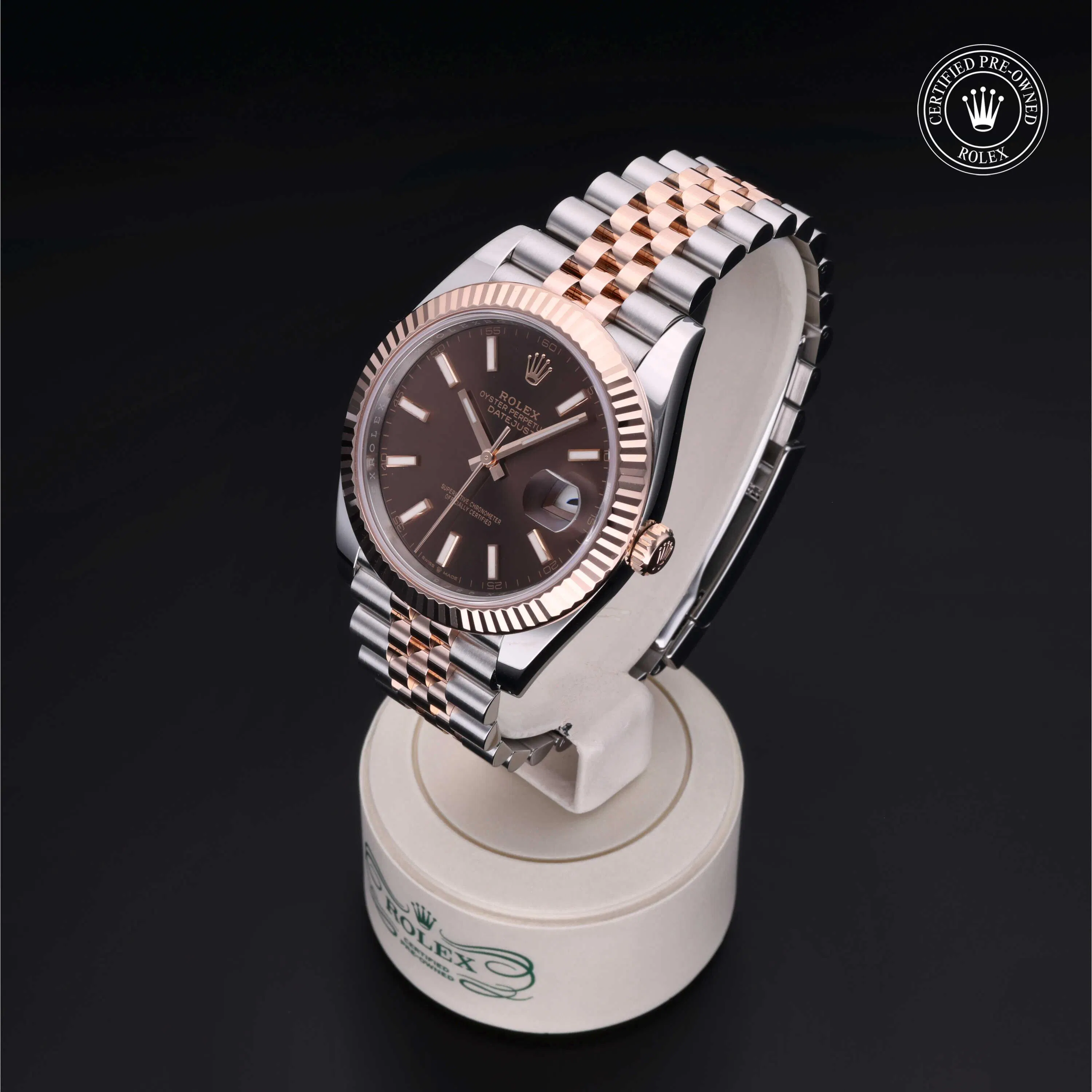 Rolex Certified Pre-Owned Datejust (126331) self - winding automatic watch, features a 41mm stainless steel case with an 18k rose gold fluted bezel surrounding a Chocolate brown dial on a stainless steel and 18k rose gold jubilee bracelet. Functions include hours, minutes, seconds and date. This watch has received Rolex-authorized service and certification. It comes with the original box and papers, and includes a custom Rolex Certified Pre-Owned hang tag, travel pouch and RCPO international warranty card.