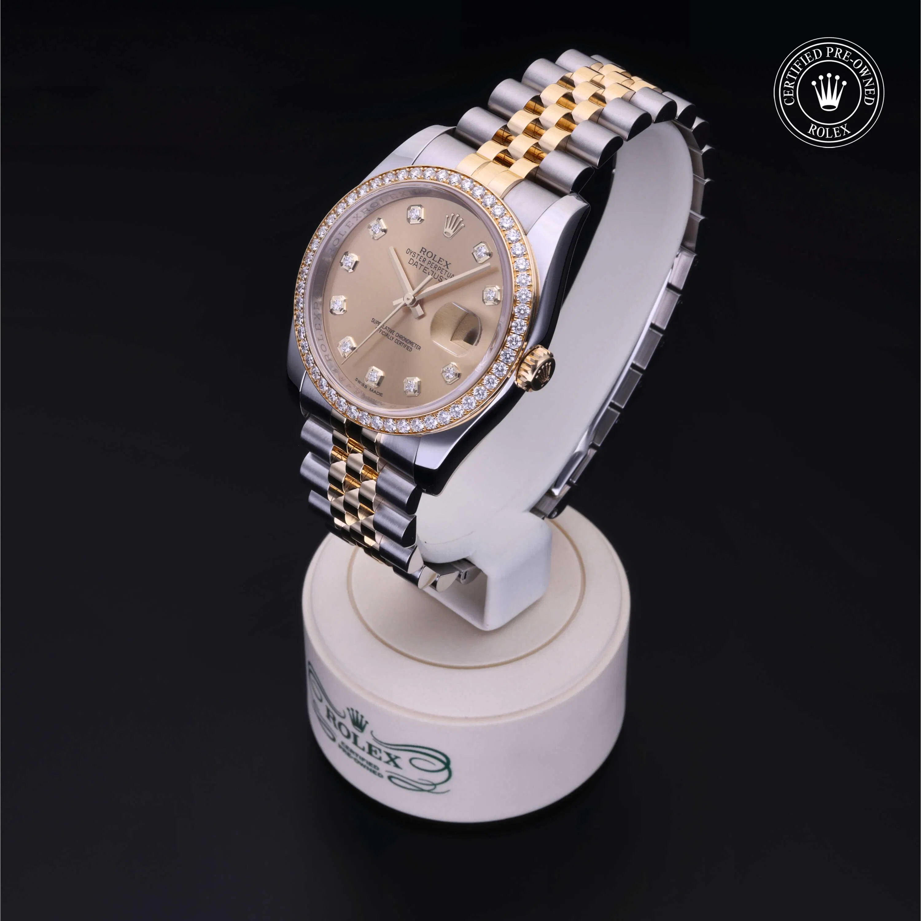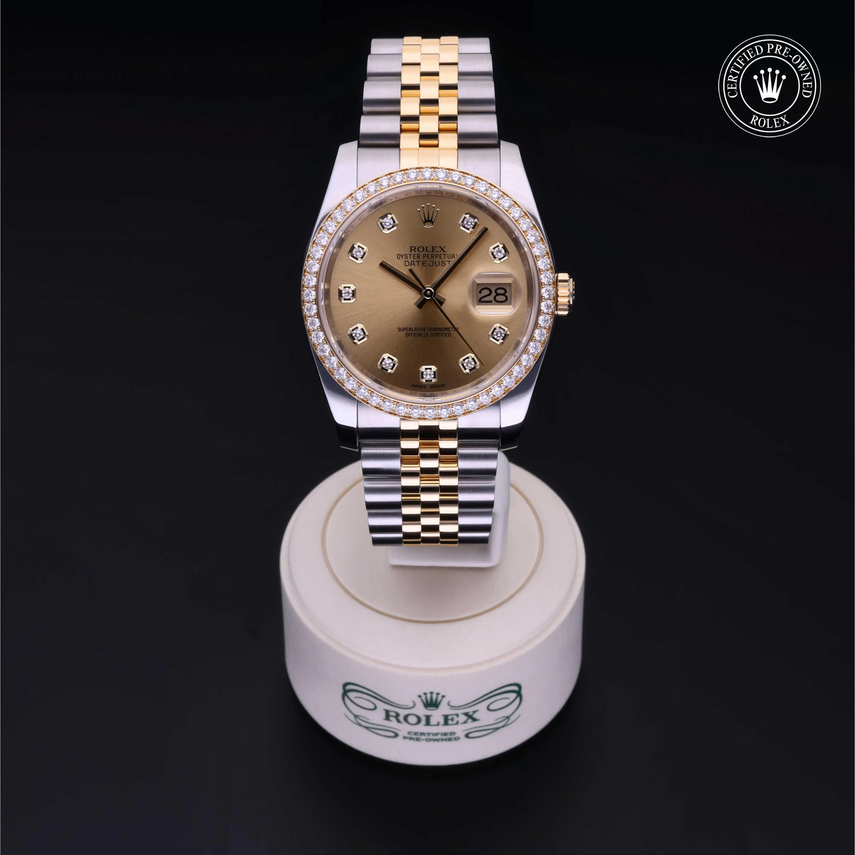 Rolex Certified Pre-Owned Datejust (116243) self - winding automatic watch, features a 36mm stainless steel case with an 18k yellow gold diamonds set bezel surrounding a champagne diamond set dial on a stainless steel and 18k yellow gold jubilee bracelet. Functions include hours, minutes, seconds and date. This watch has received Rolex-authorized service and certification. It does not come with the original box or papers, but includes a custom Rolex Certified Pre-Owned hang tag, travel pouch and RCPO international warranty card.