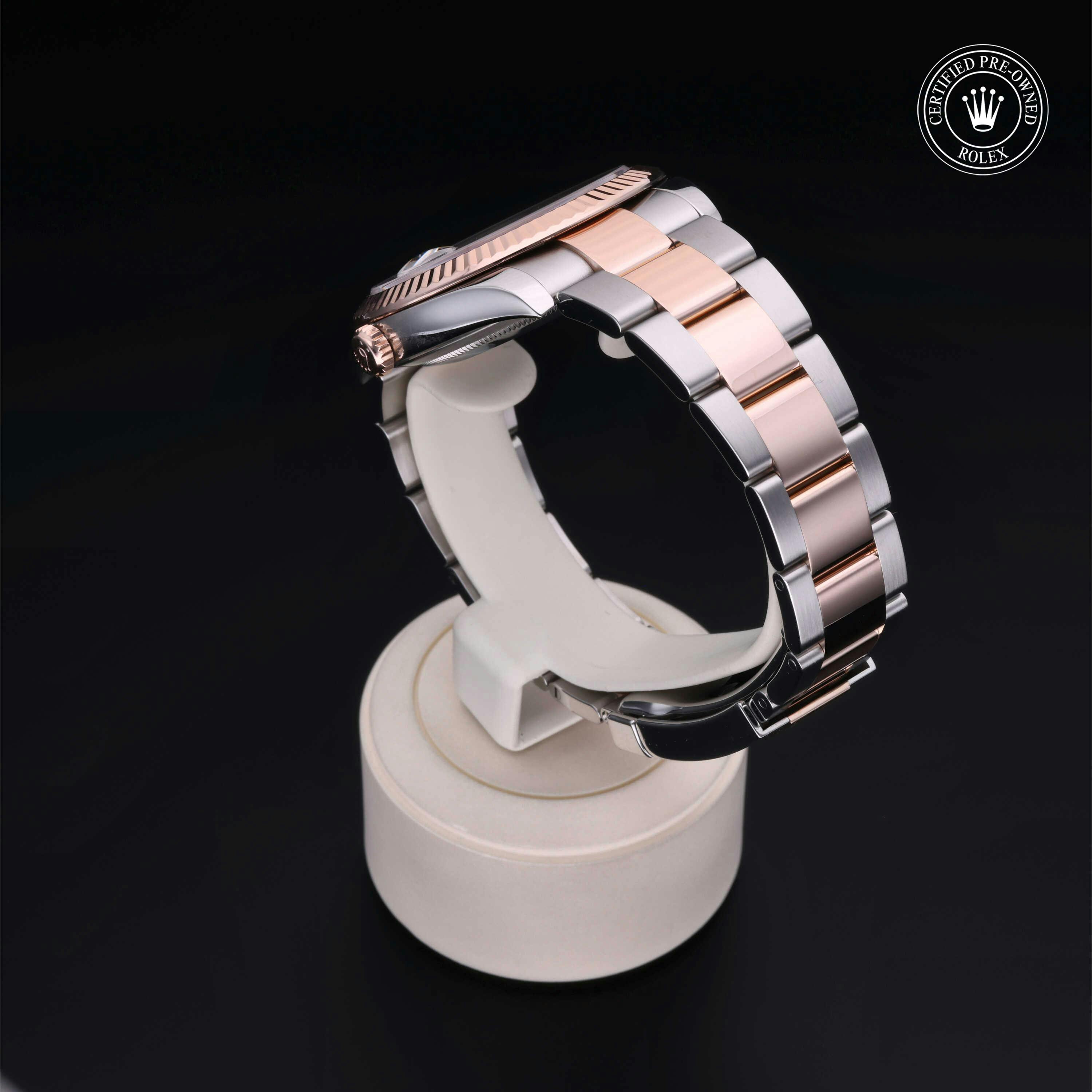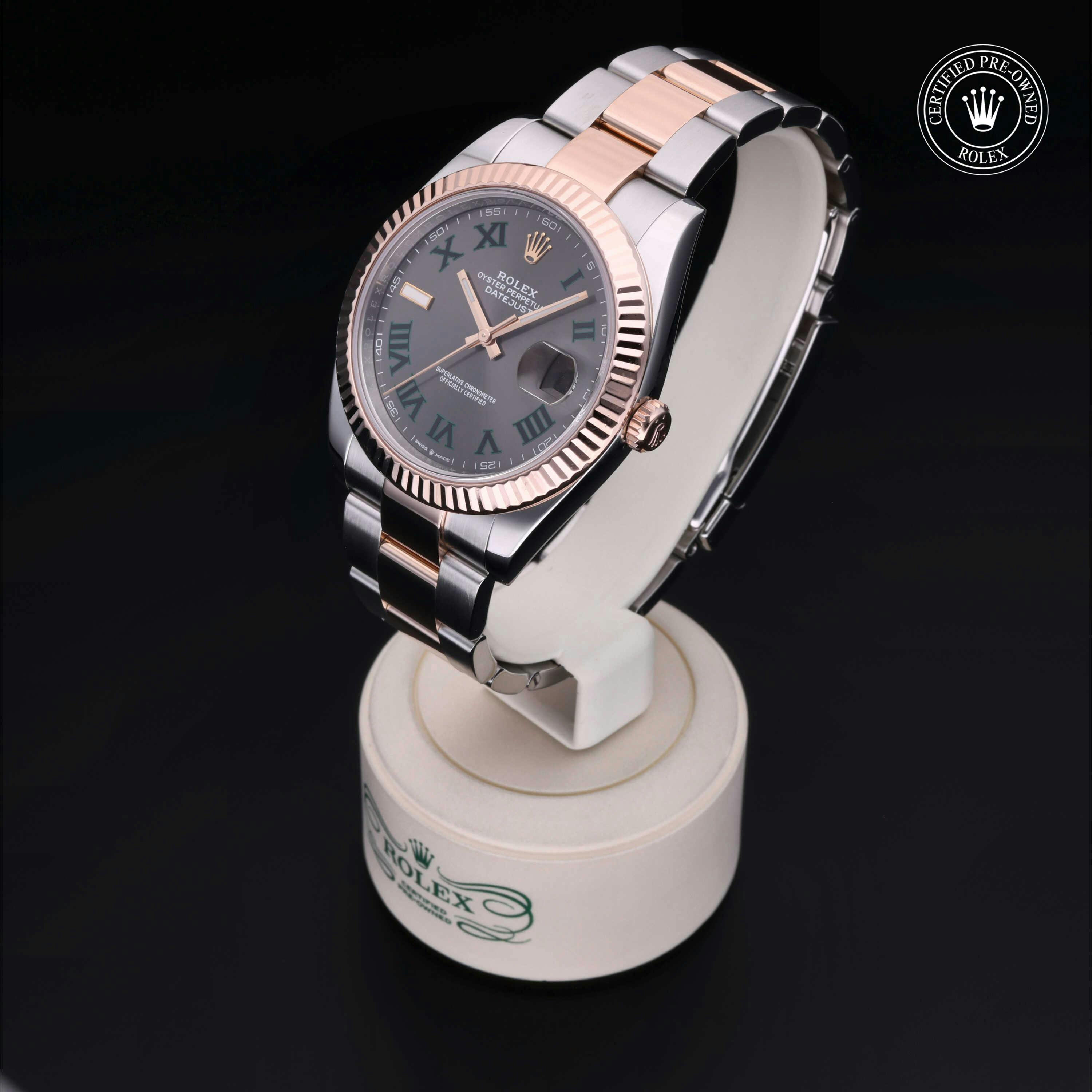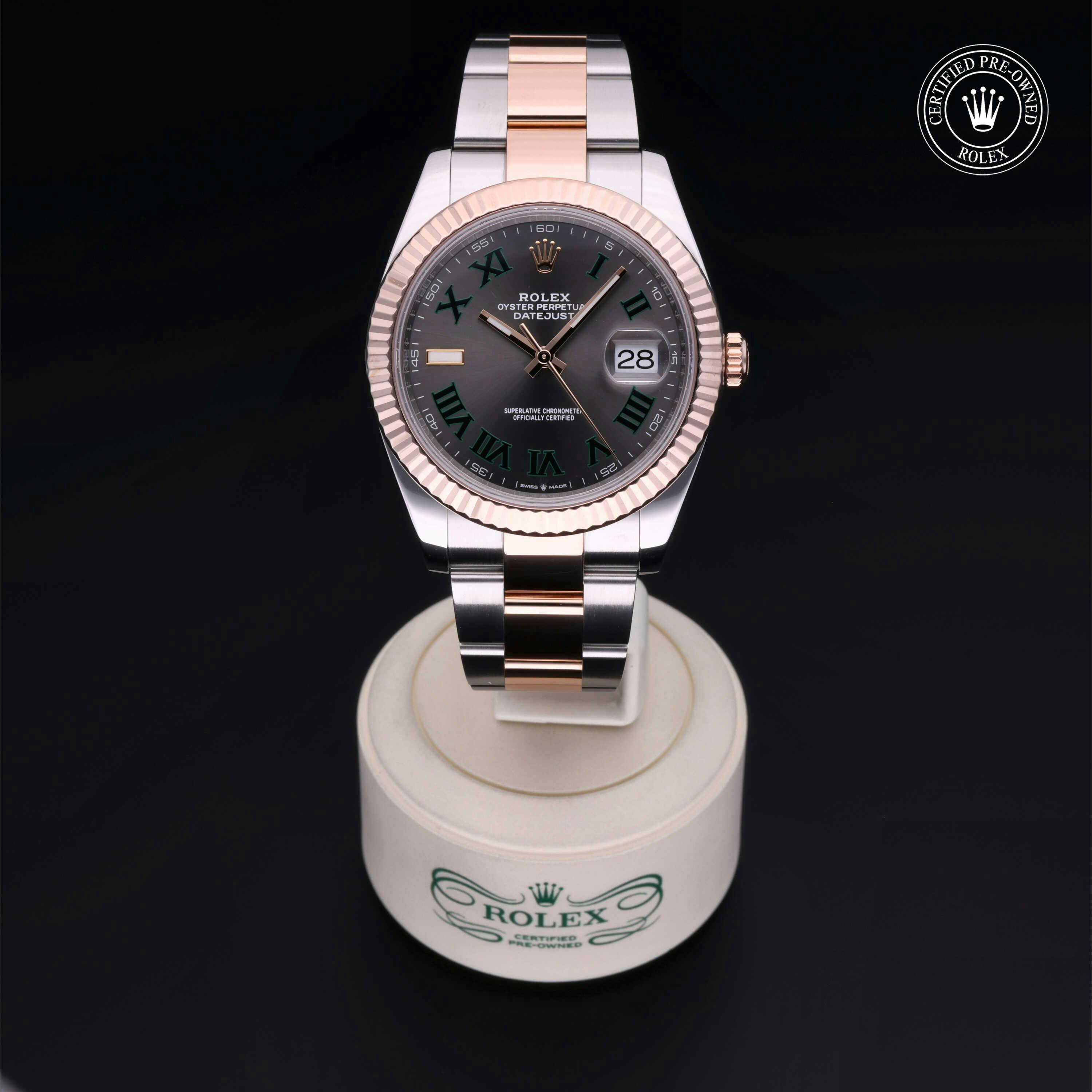 Rolex Certified Pre-Owned Datejust (126331) self - winding automatic watch, features a 41mm stainless steel case with an 18k rose gold fluted bezel surrounding a slate dial on a stainless steel and 18k rose gold oyster bracelet. Functions include hours, minutes, seconds and date. This watch has received Rolex-authorized service and certification. It comes with the original box and papers, and includes a custom Rolex Certified Pre-Owned hang tag, travel pouch and RCPO international warranty card.