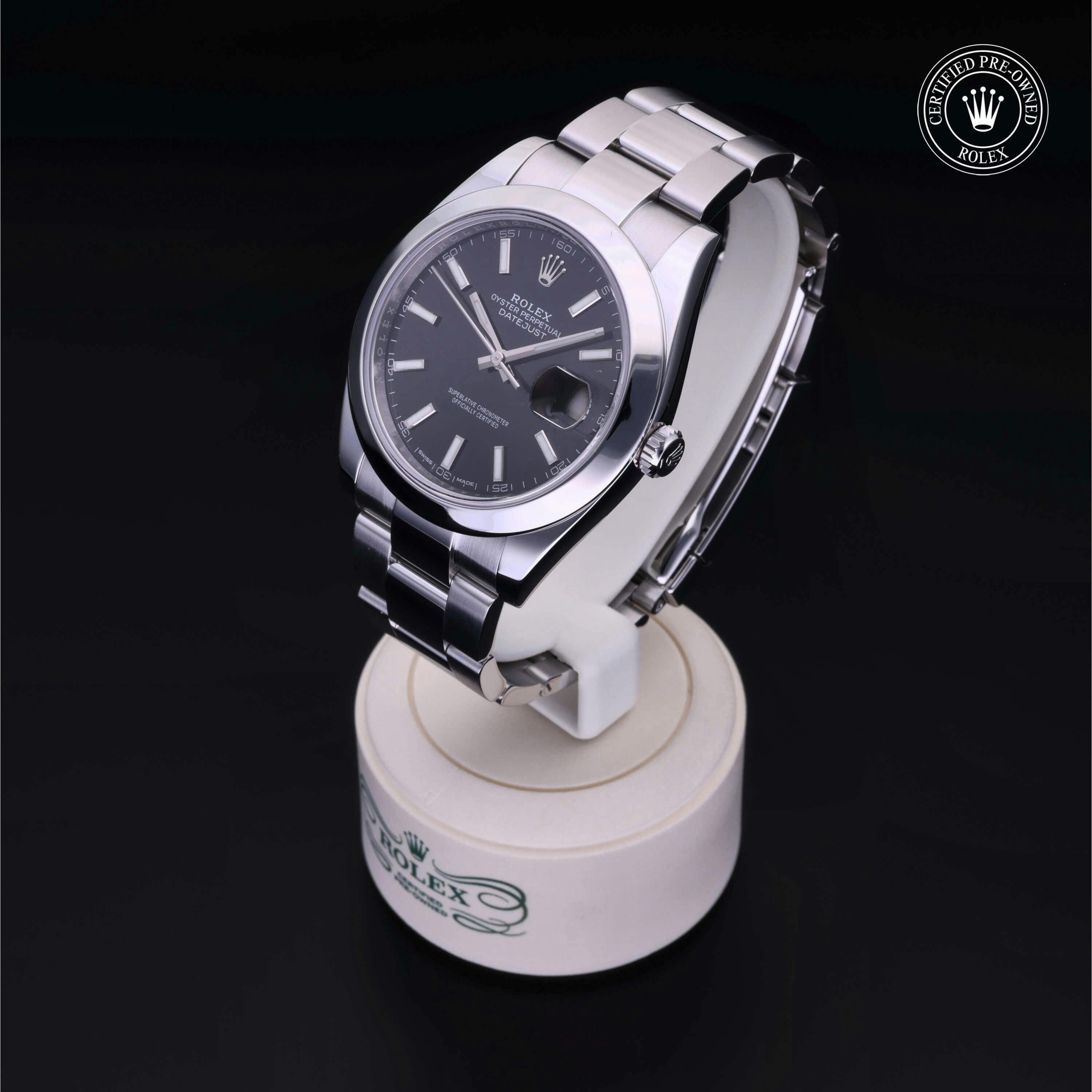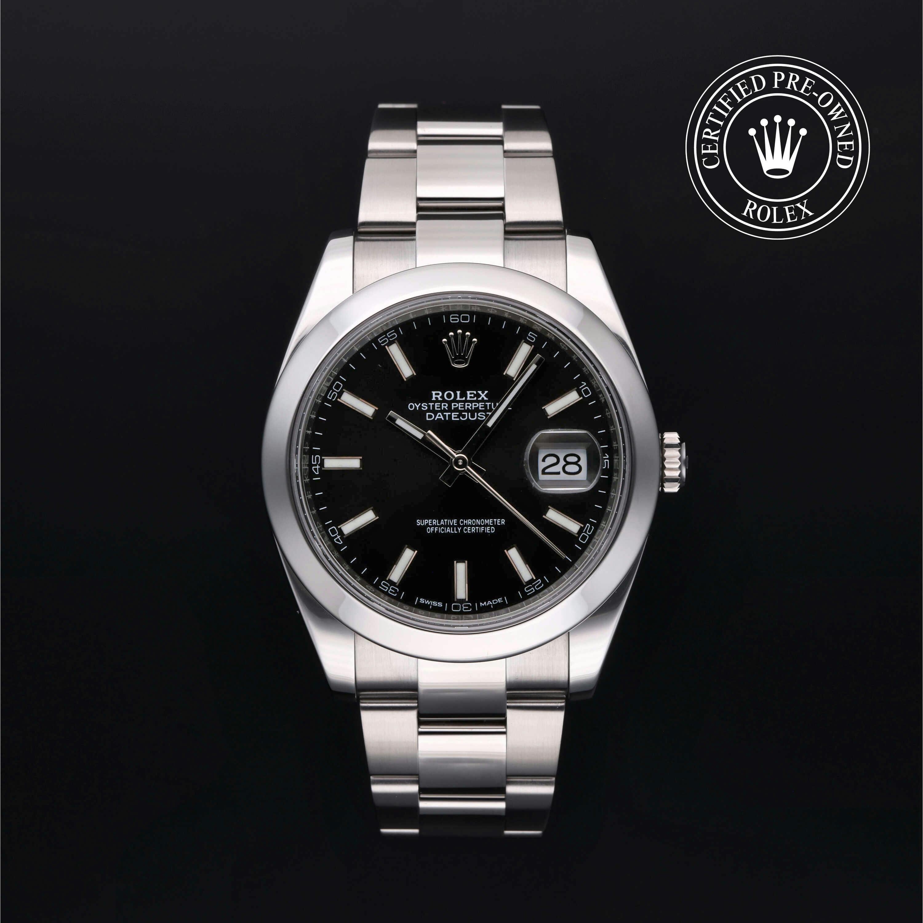 Rolex Certified Pre-Owned Datejust (126300) self - winding automatic watch, features a 41mm stainless steel case with a smooth bezel surrounding a black index dial. The watch is secured on a stainless steel Oyster bracelet complete with a folding buckle. Functions include hours, minutes, seconds and date. This watch has been serviced by an authorized service center and certified by Rolex. It does not come with the original box or papers, but includes a custom Rolex Certified Pre-Owned hang tag, travel pouch and international warranty card.