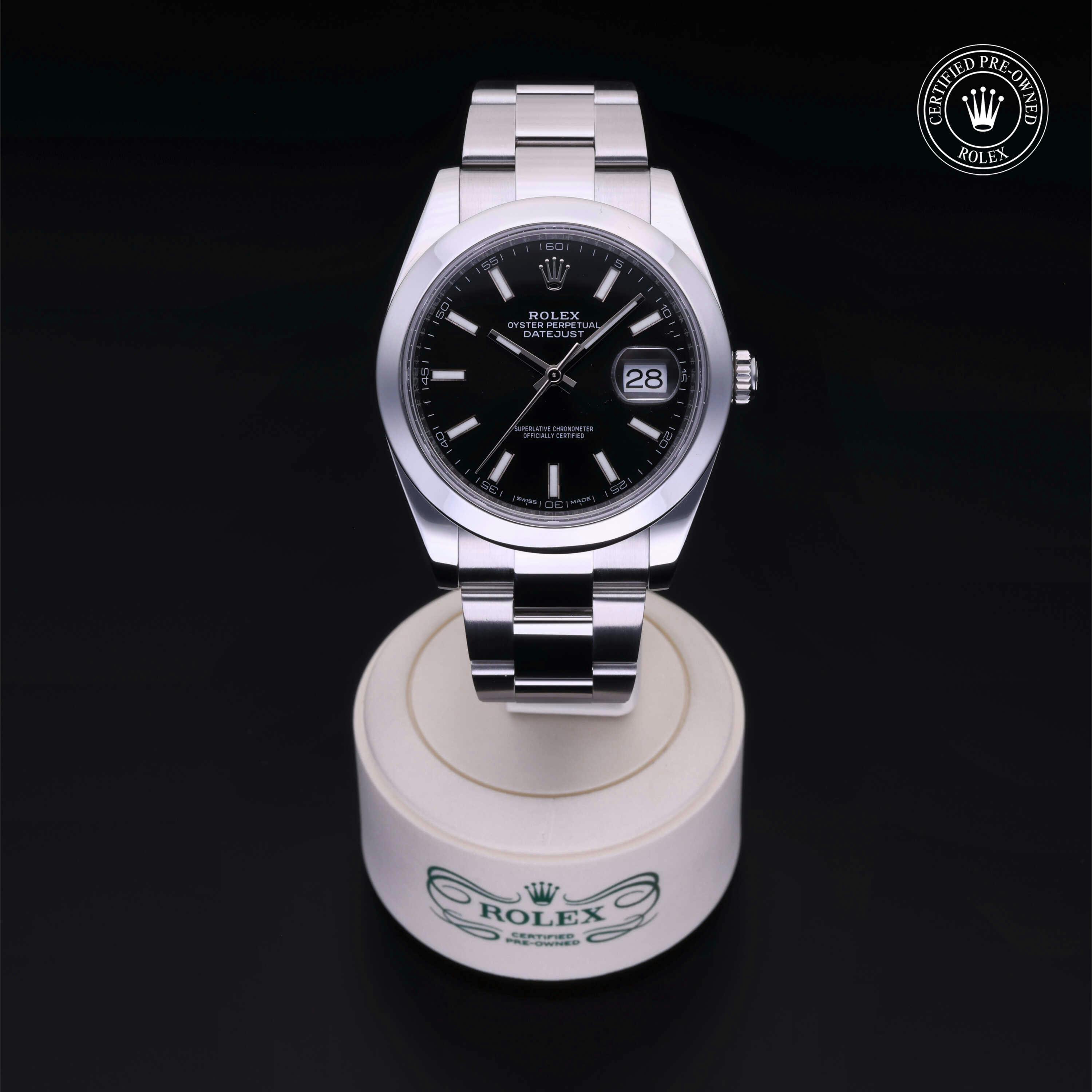 Rolex Certified Pre-Owned Datejust (126300) self - winding automatic watch, features a 41mm stainless steel case with a smooth bezel surrounding a black index dial. The watch is secured on a stainless steel Oyster bracelet complete with a folding buckle. Functions include hours, minutes, seconds and date. This watch has been serviced by an authorized service center and certified by Rolex. It does not come with the original box or papers, but includes a custom Rolex Certified Pre-Owned hang tag, travel pouch and international warranty card.