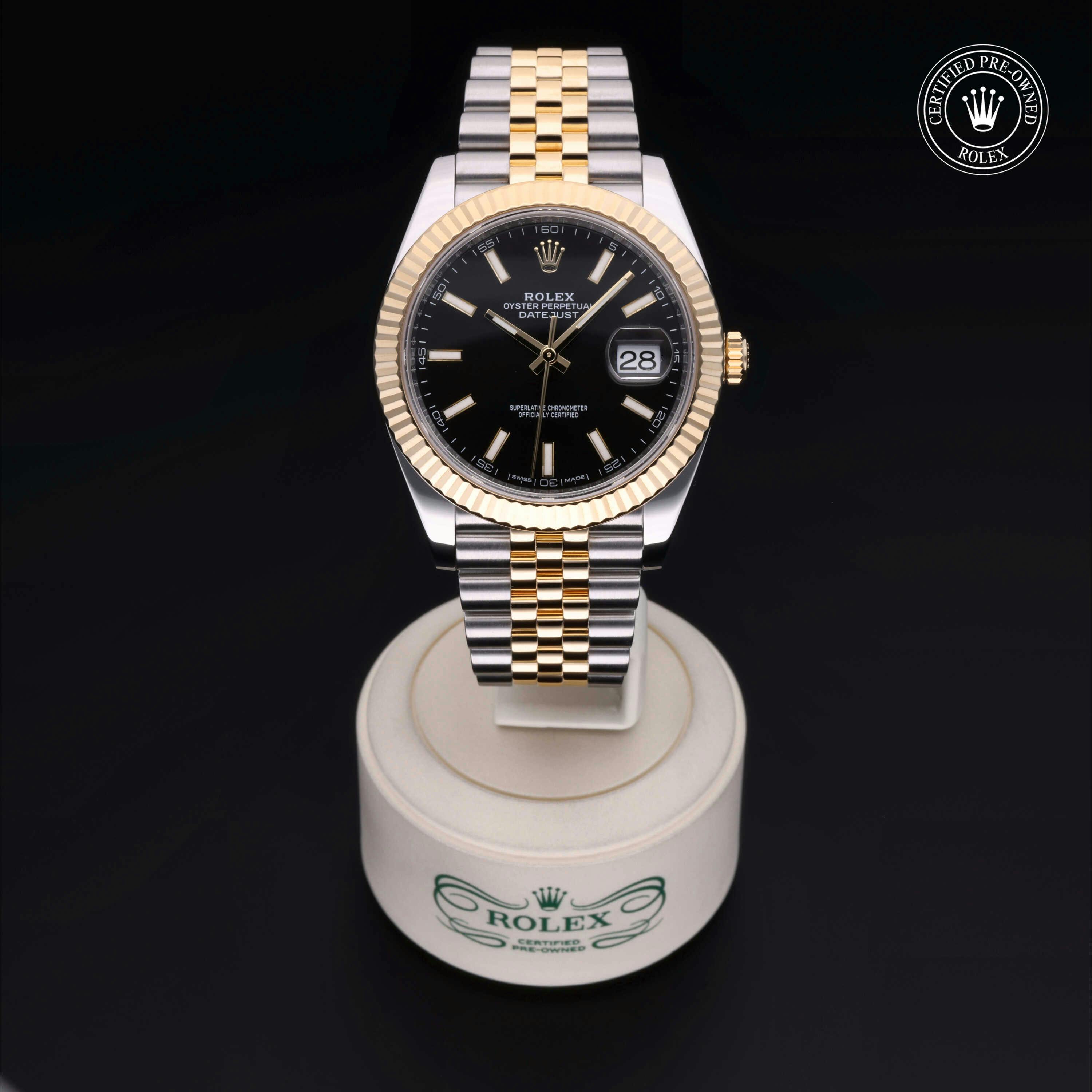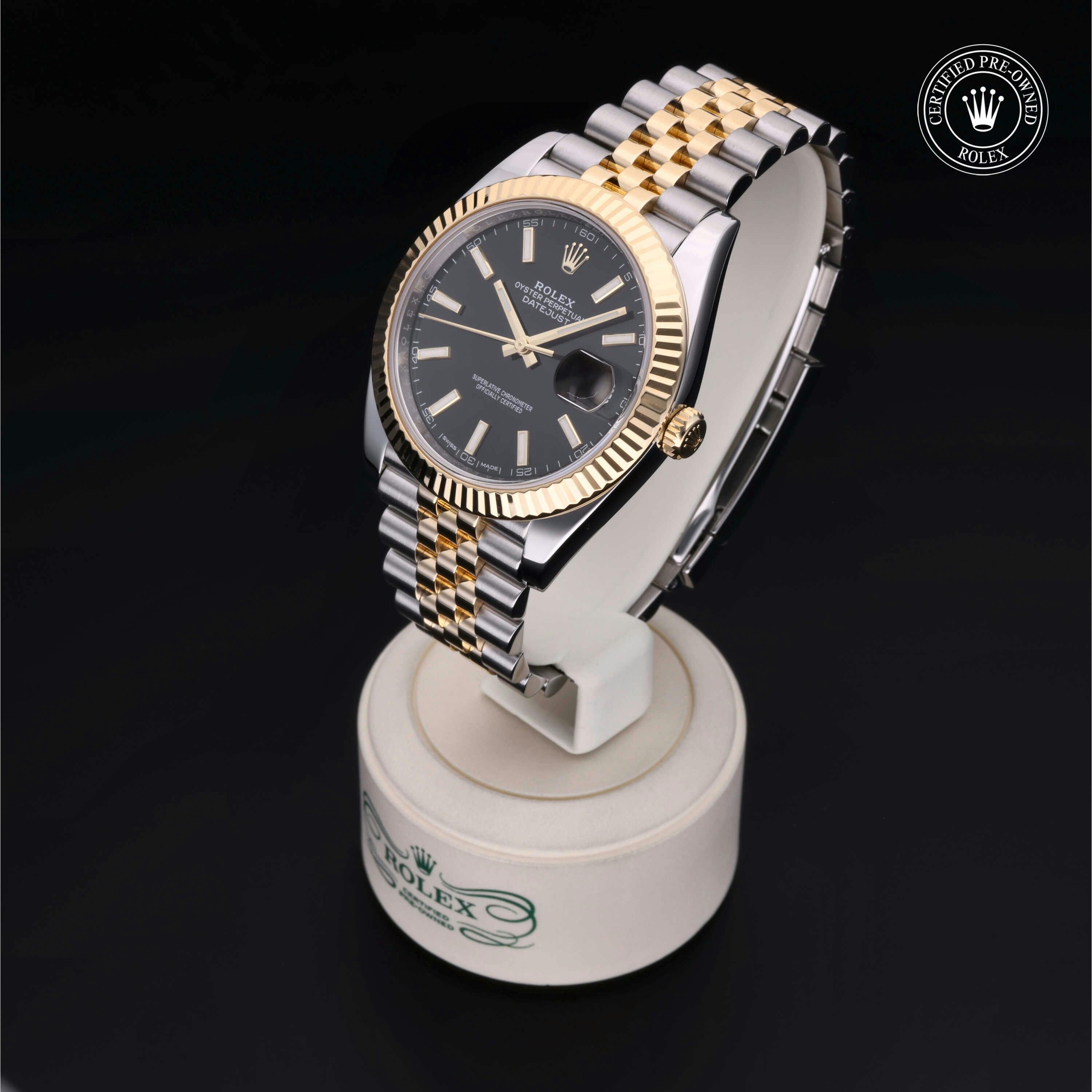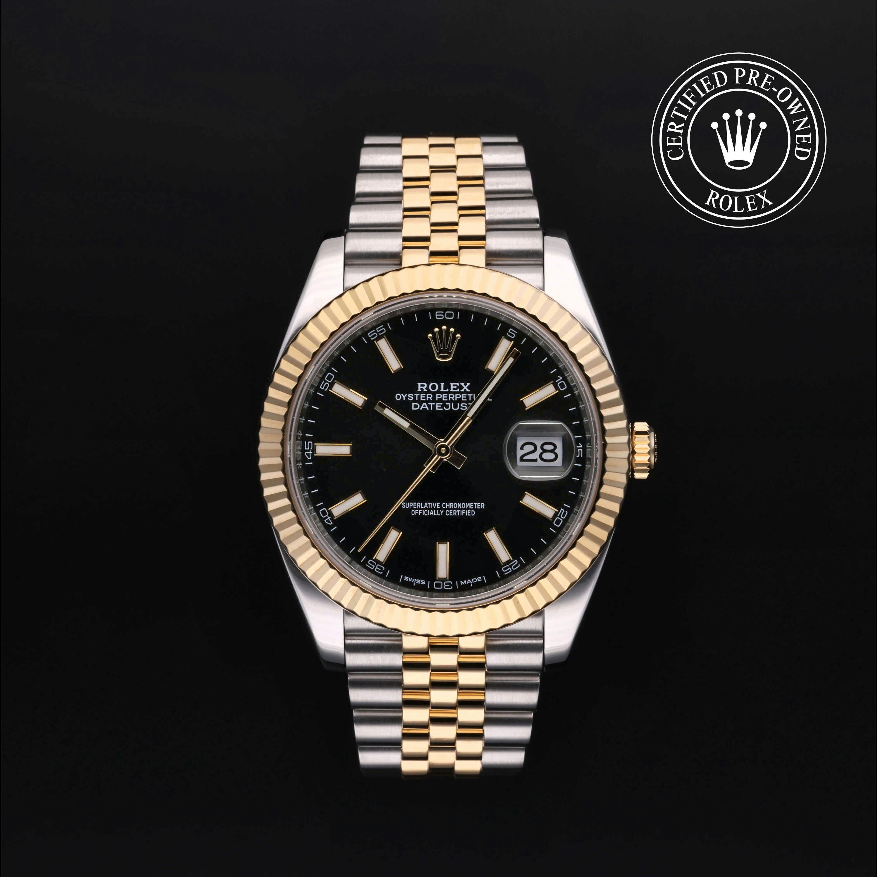 Rolex Certified Pre-Owned Datejust (126333) self - winding automatic watch, features a 41mm stainless steel case with an 18k yellow gold fluted bezel surrounding a black index dial. The watch is secured on a stainless steel and 18k yellow gold Jubilee bracelet complete with a folding buckle. Functions include hours, minutes, seconds and date. This watch has been serviced by an authorized service center and certified by Rolex. It does not come with the original box or papers, but includes a custom Rolex Certified Pre-Owned hang tag, travel pouch and international warranty card.