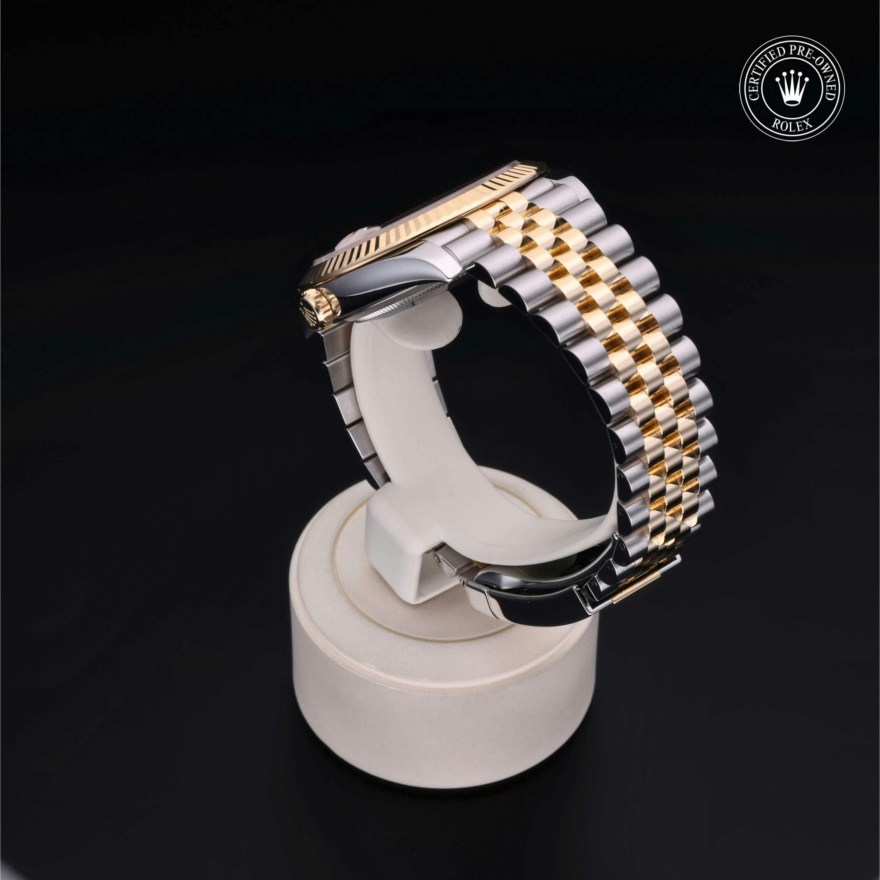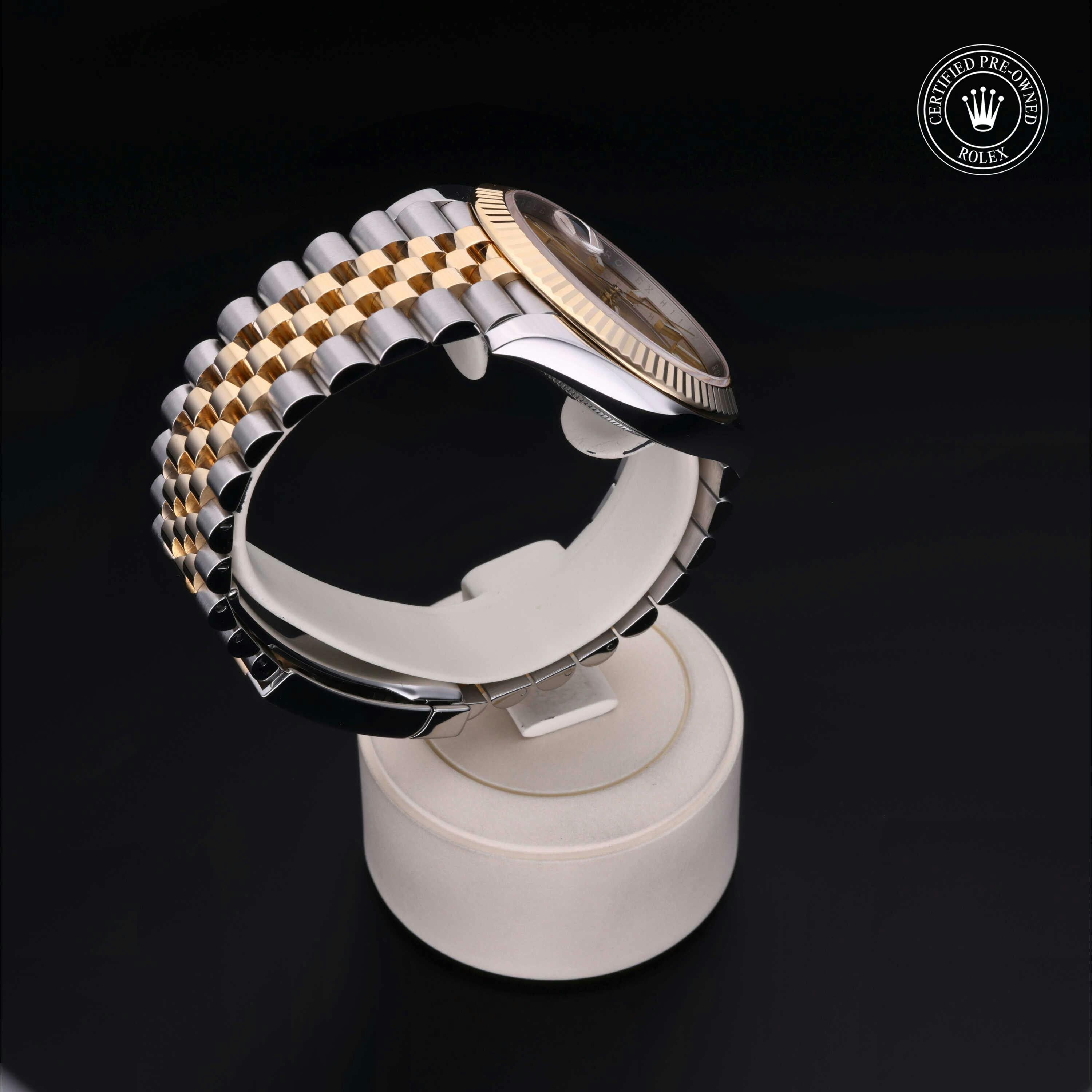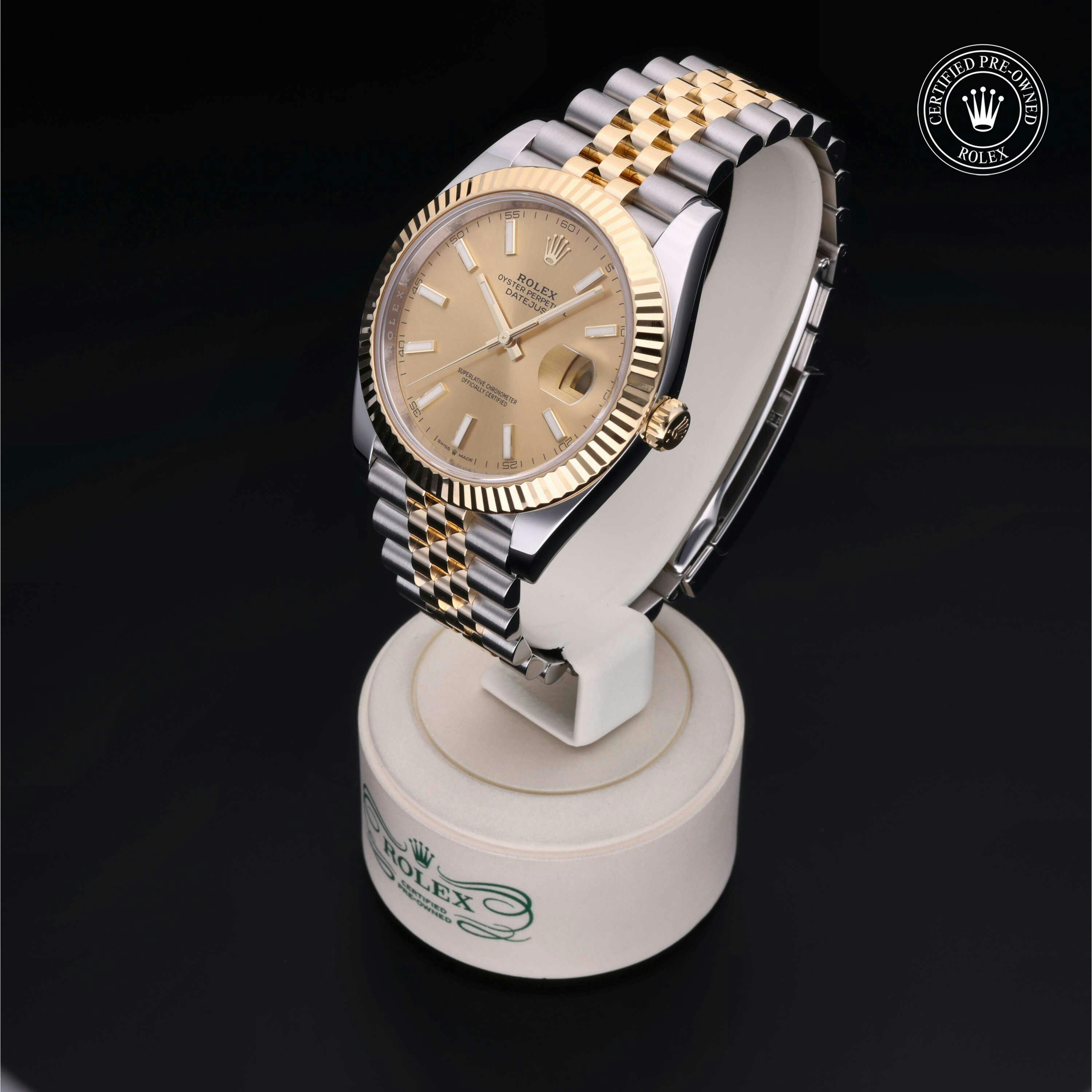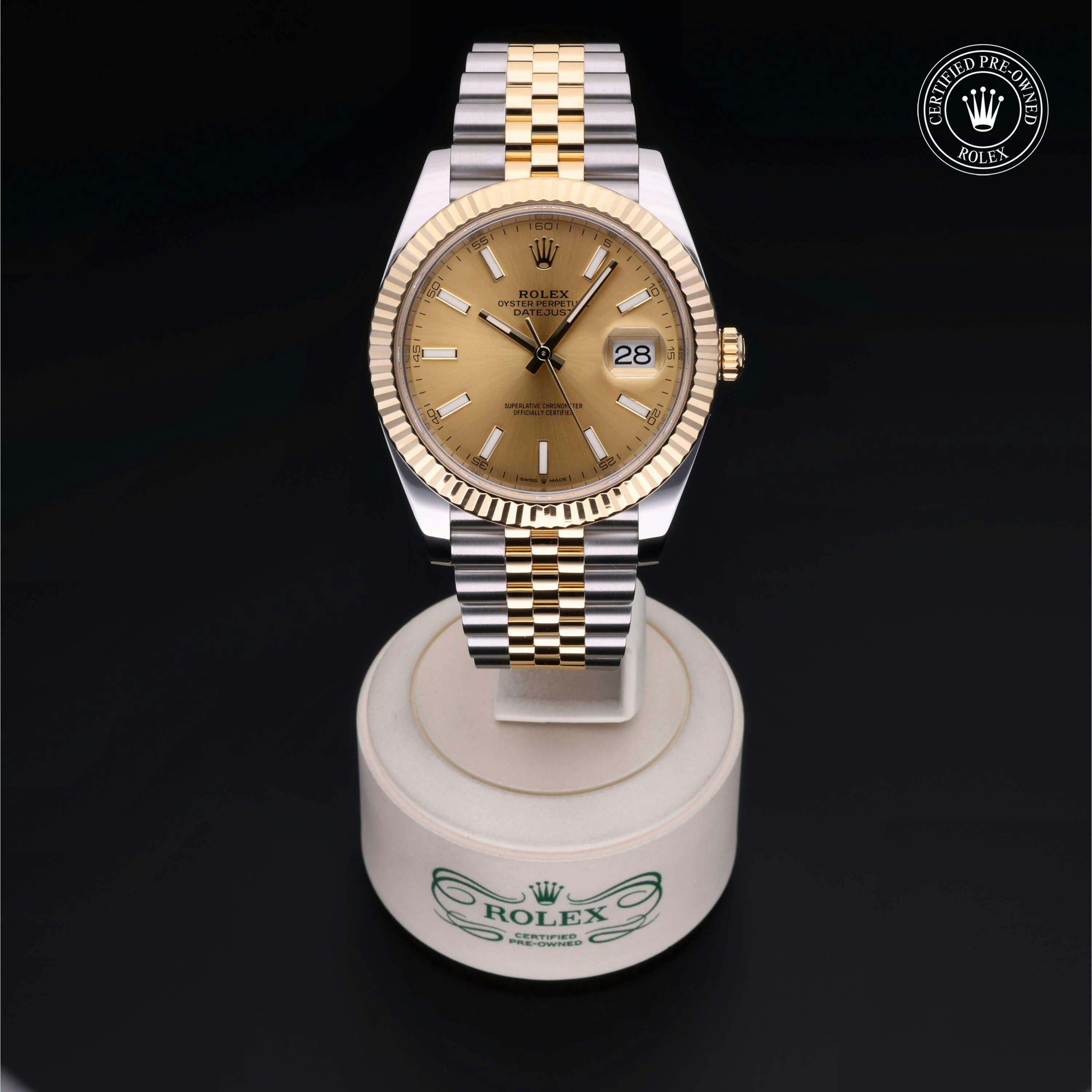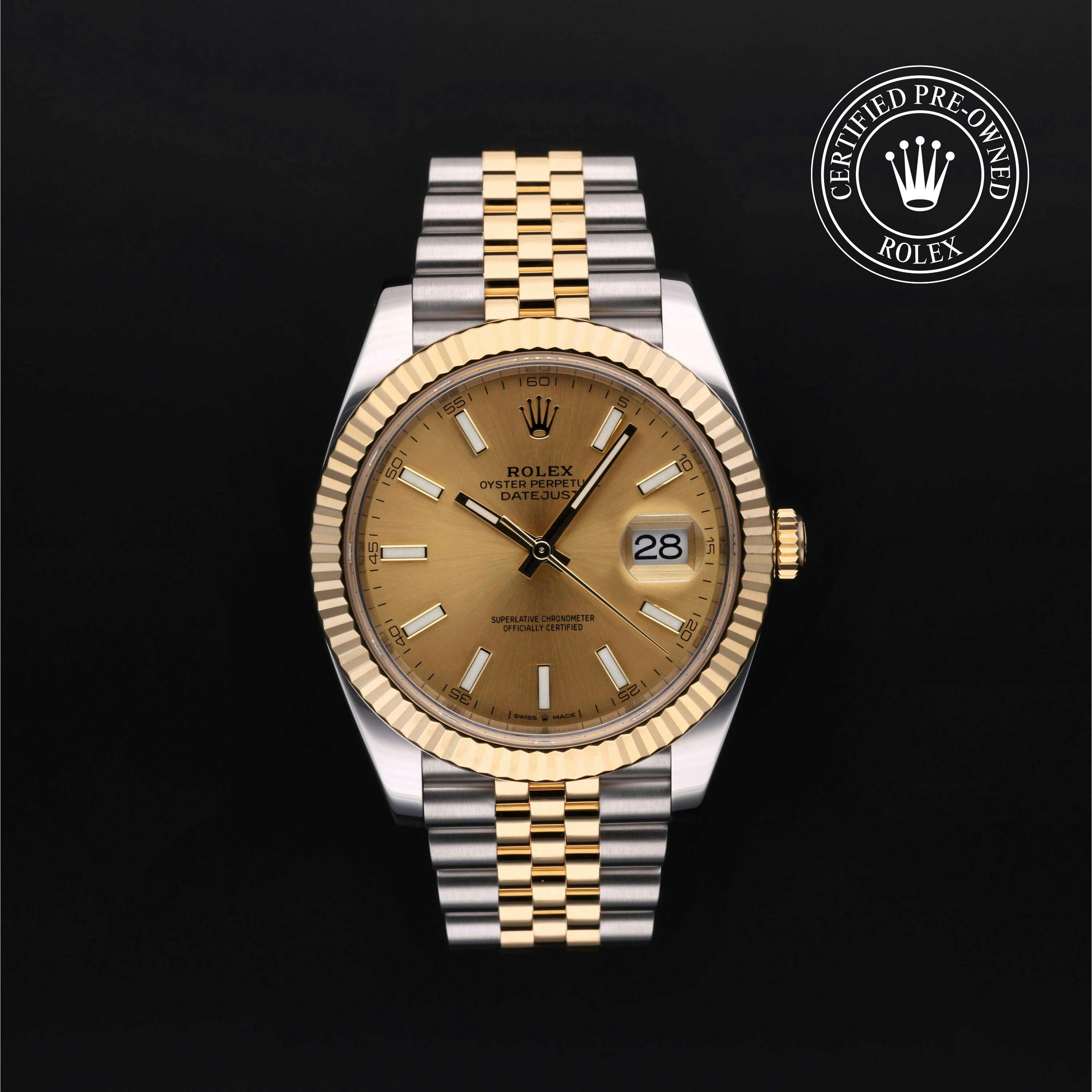 Rolex Certified Pre-Owned Datejust (126333) self - winding automatic watch, features a 41mm stainless steel case with an 18k yellow gold fluted bezel surrounding a champagne dial on a stainless steel and 18k yellow gold jubilee bracelet. Functions include hours, minutes, seconds and date. This watch has received Rolex-authorized service and certification. It does not come with the original box or papers, but includes a custom Rolex Certified Pre-Owned hang tag, travel pouch and RCPO international warranty card.