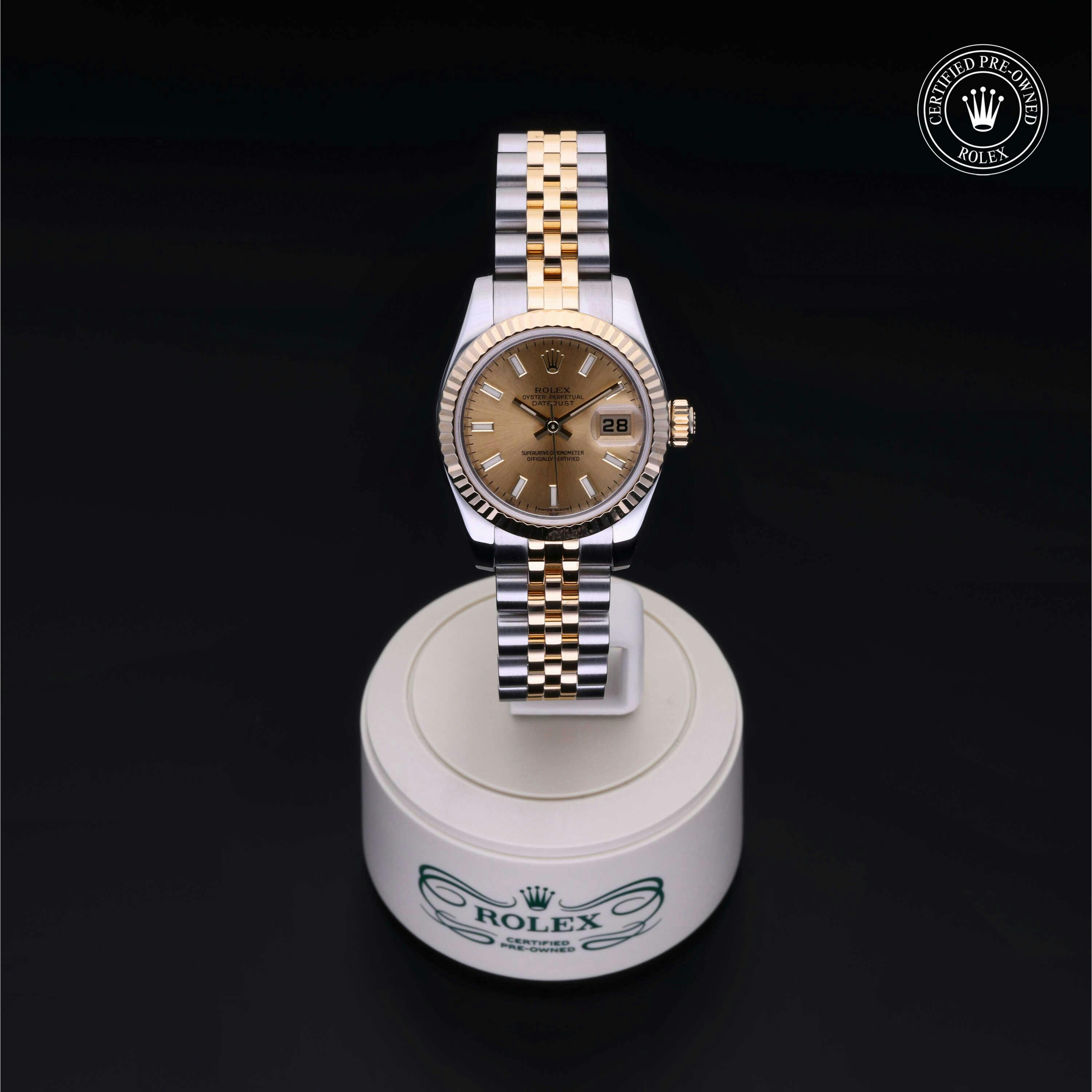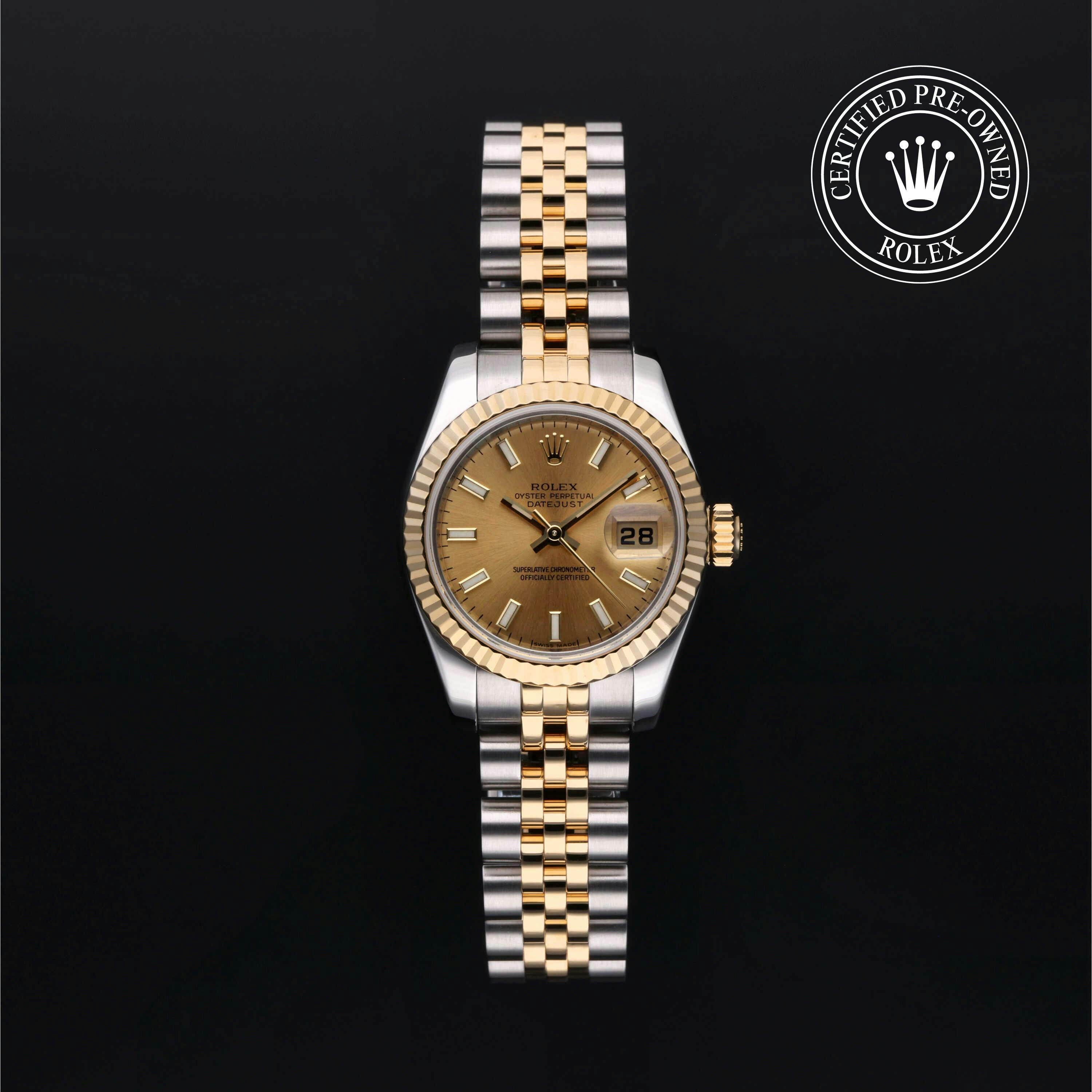 Rolex Certified Pre-Owned Datejust (179173) self - winding automatic watch, features a 26mm stainless case with an 18k yellow gold fluted bezel surrounding a champagne dial on a stainless steel and 18k yellow gold jubilee bracelet. Functions include hours, minutes, seconds and date. This watch has received Rolex-authorized service and certification. It does not come with the original box or papers, but includes a custom Rolex Certified Pre-Owned hang tag, travel pouch and RCPO international warranty card.