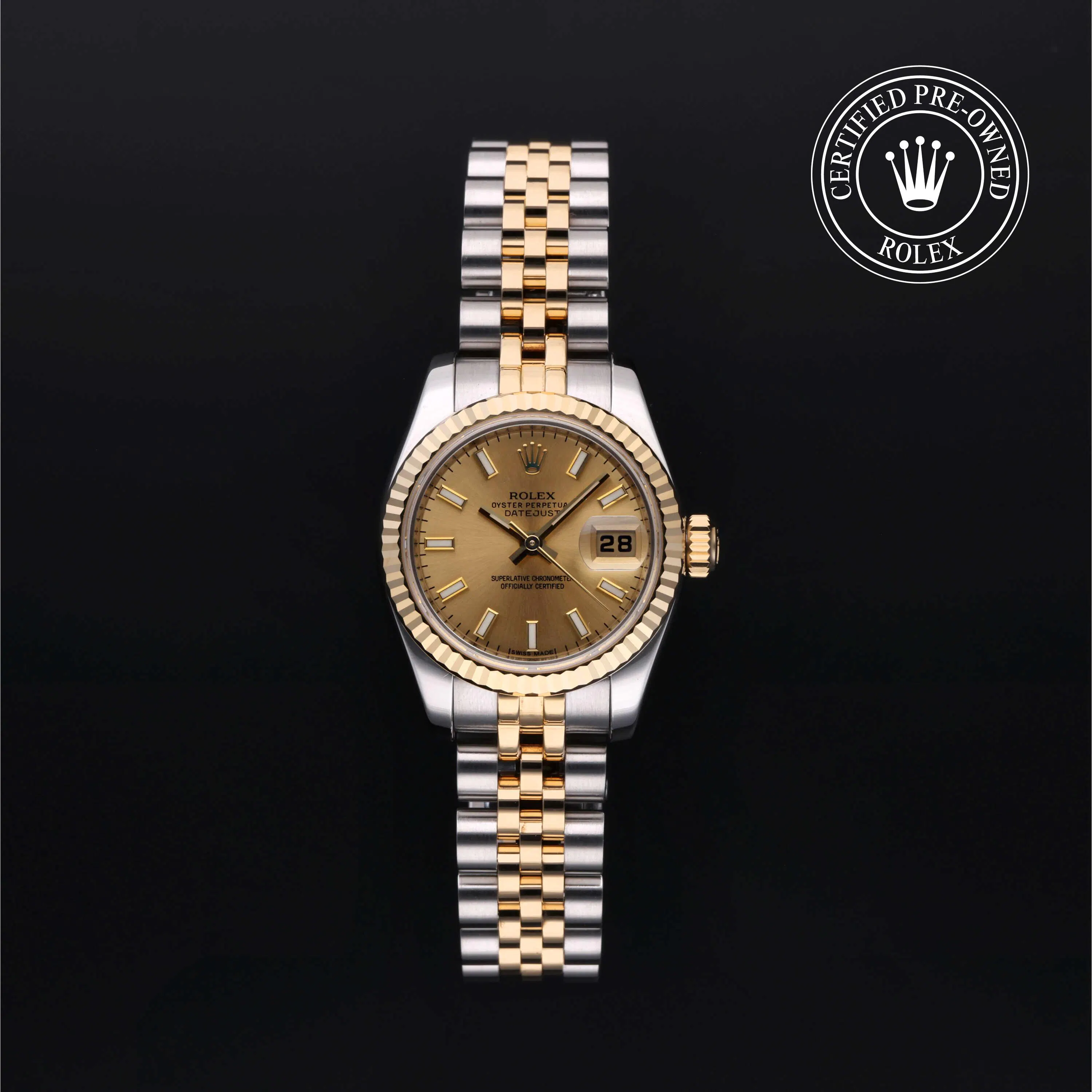 Rolex Certified Pre-Owned Datejust (179173) self - winding automatic watch, features a 26mm stainless case with an 18k yellow gold fluted bezel surrounding a champagne dial on a stainless steel and 18k yellow gold jubilee bracelet. Functions include hours, minutes, seconds and date. This watch has Rolex-authorized service and certification. It does not come with the original box or papers, but includes a custom Rolex Certified Pre-Owned hang tag, travel pouch and RCPO international warranty card.