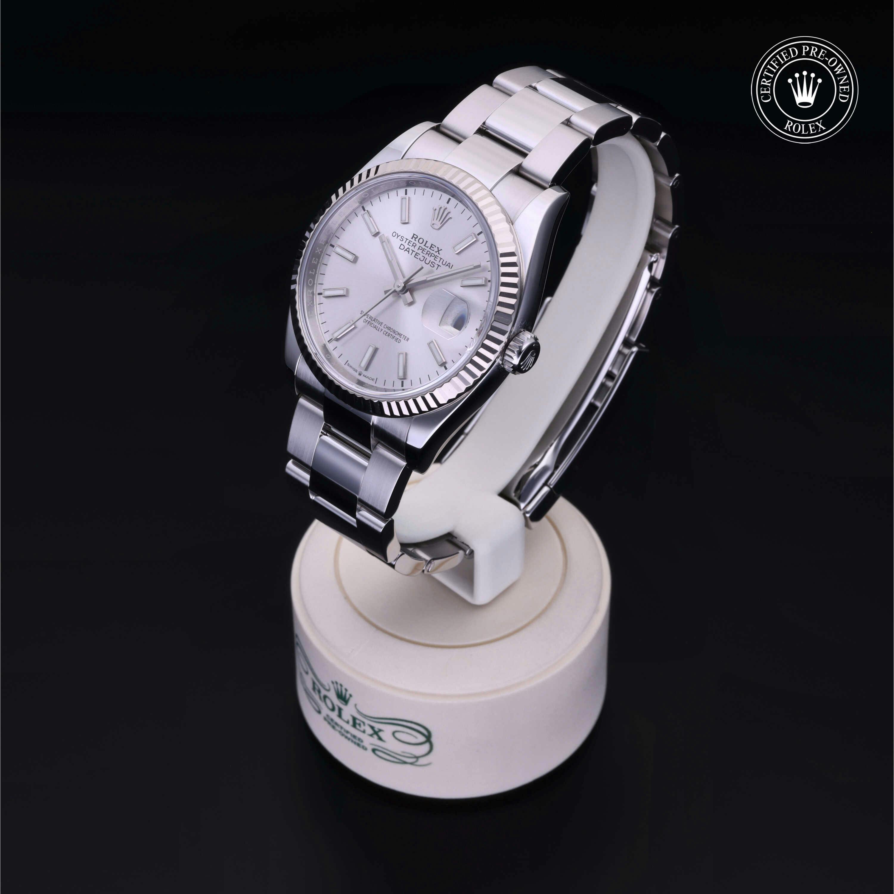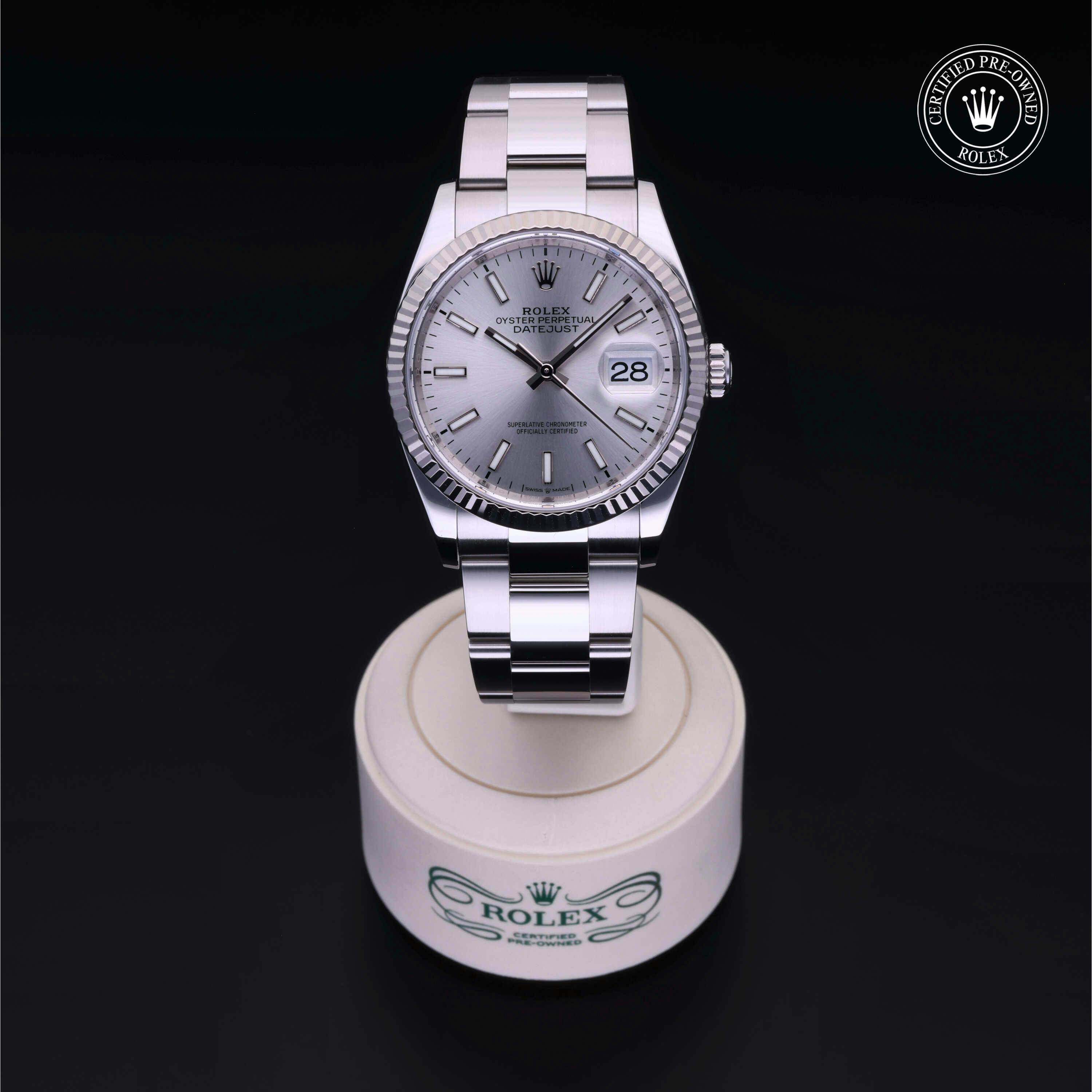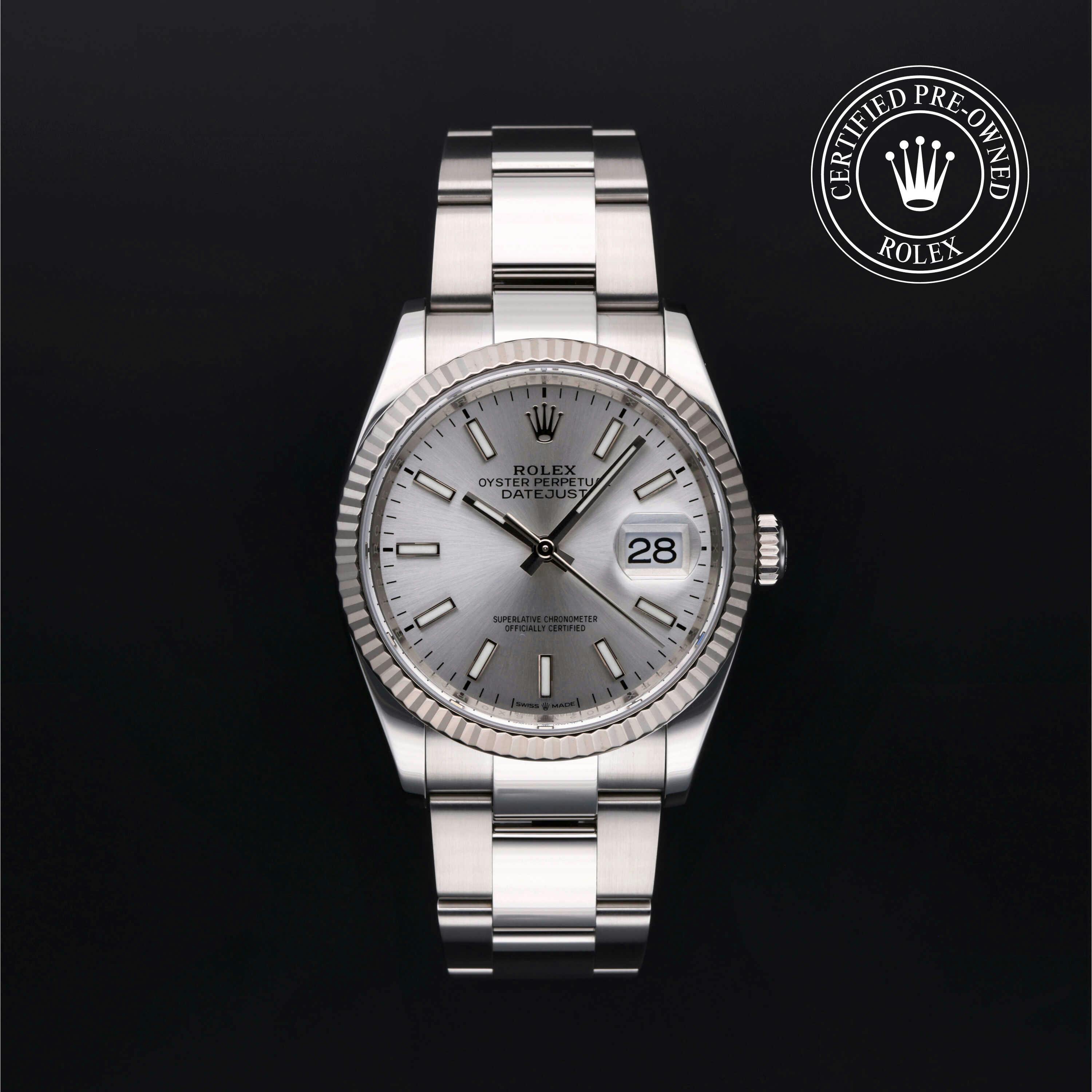 Rolex Certified Pre-Owned Datejust (126234) self - winding automatic watch, features a 36mm stainless steel case with an 18k white gold fluted bezel surrounding a silver dial on a stainless steel oyster bracelet. Functions include hours, minutes, seconds and date. This watch has received Rolex-authorized service and certification. It comes with the original box and papers, and includes a custom Rolex Certified Pre-Owned hang tag, travel pouch and RCPO international warranty card.