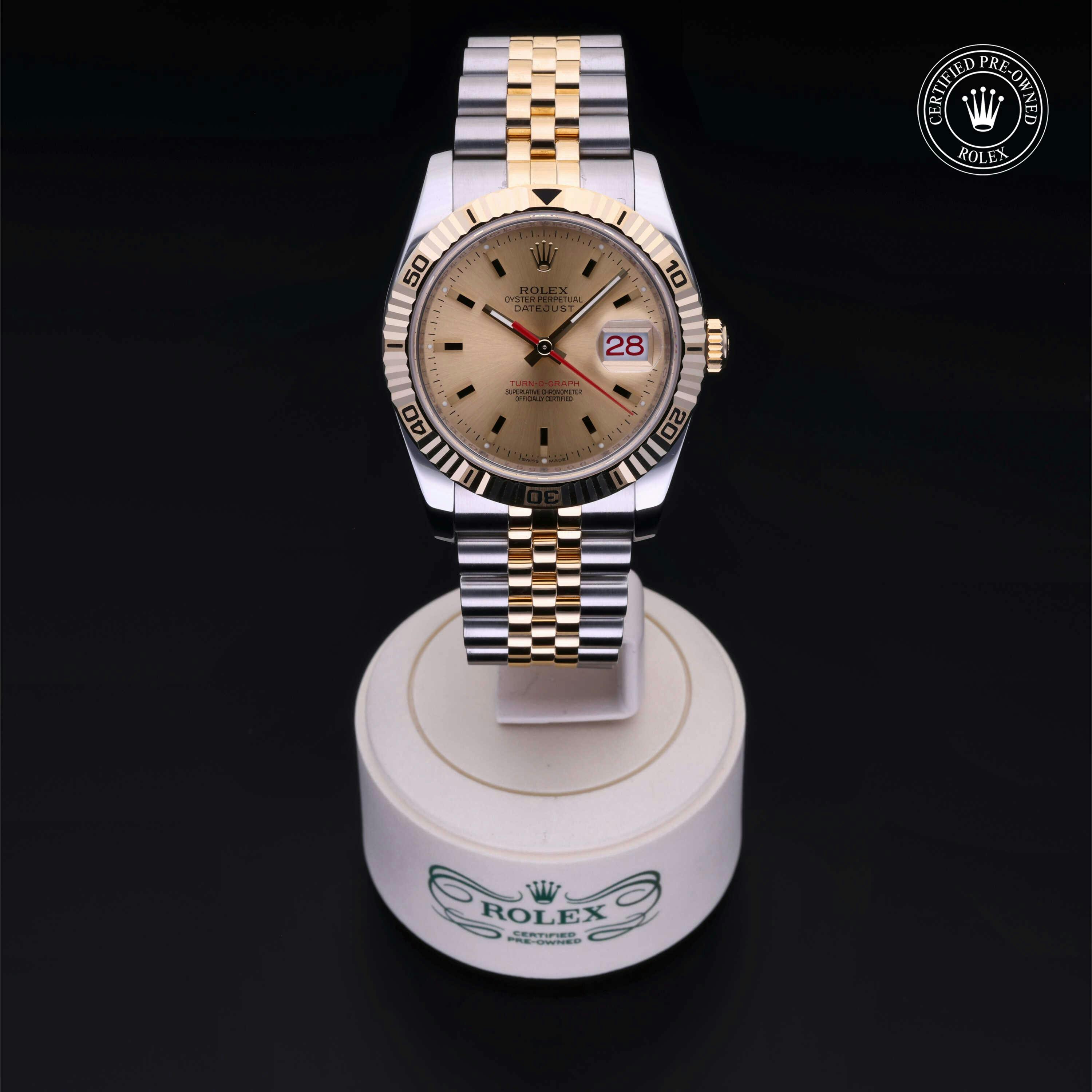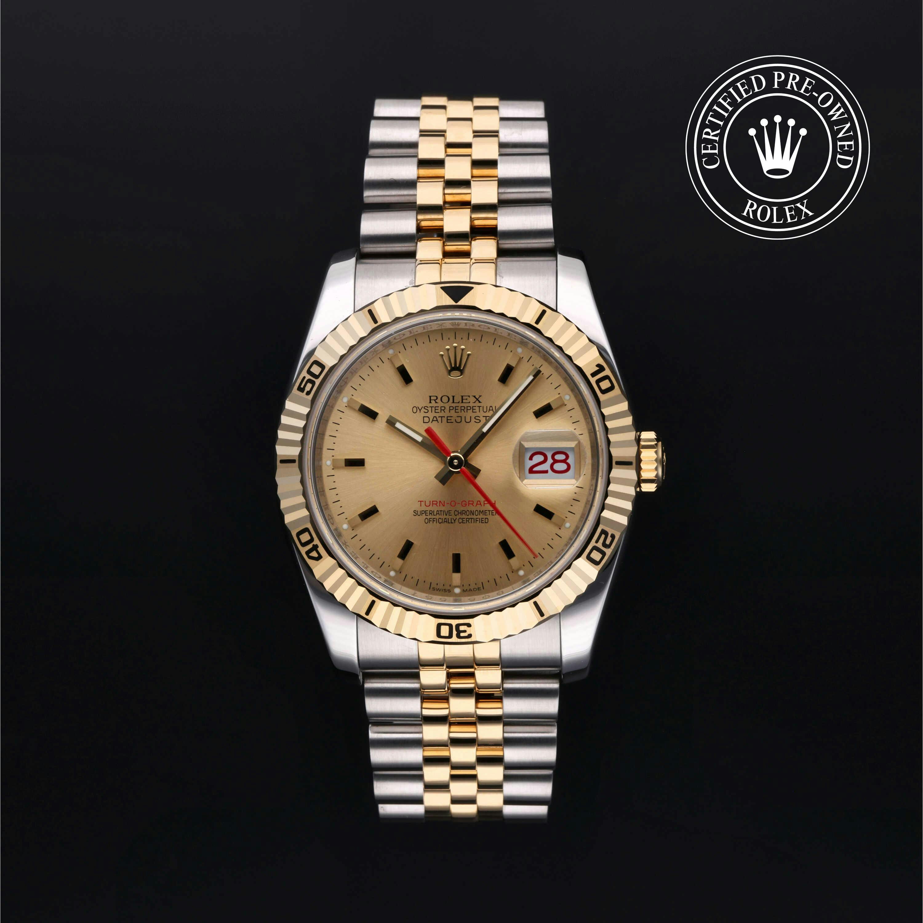Rolex Certified Pre-Owned Datejust Turn-O-Graph (116263) self - winding automatic watch, features a 36mm stainless steel case with an 18k yellow gold Turn-O-Graph fluted bezel surrounding a champagne dial on a stainless steel and 18k yellow gold jubilee bracelet. Functions include hours, minutes, seconds and date. This watch has received Rolex-authorized service and certification. It comes with the original papers, and includes a custom Rolex Certified Pre-Owned hang tag, travel pouch and RCPO international warranty card.