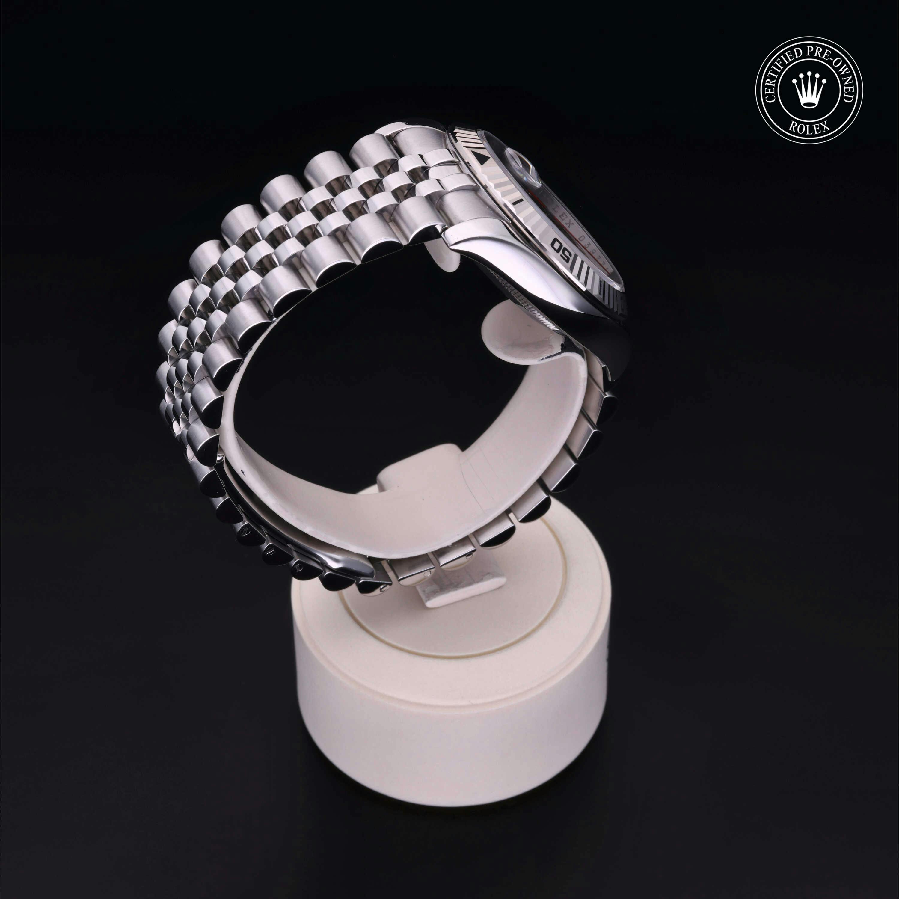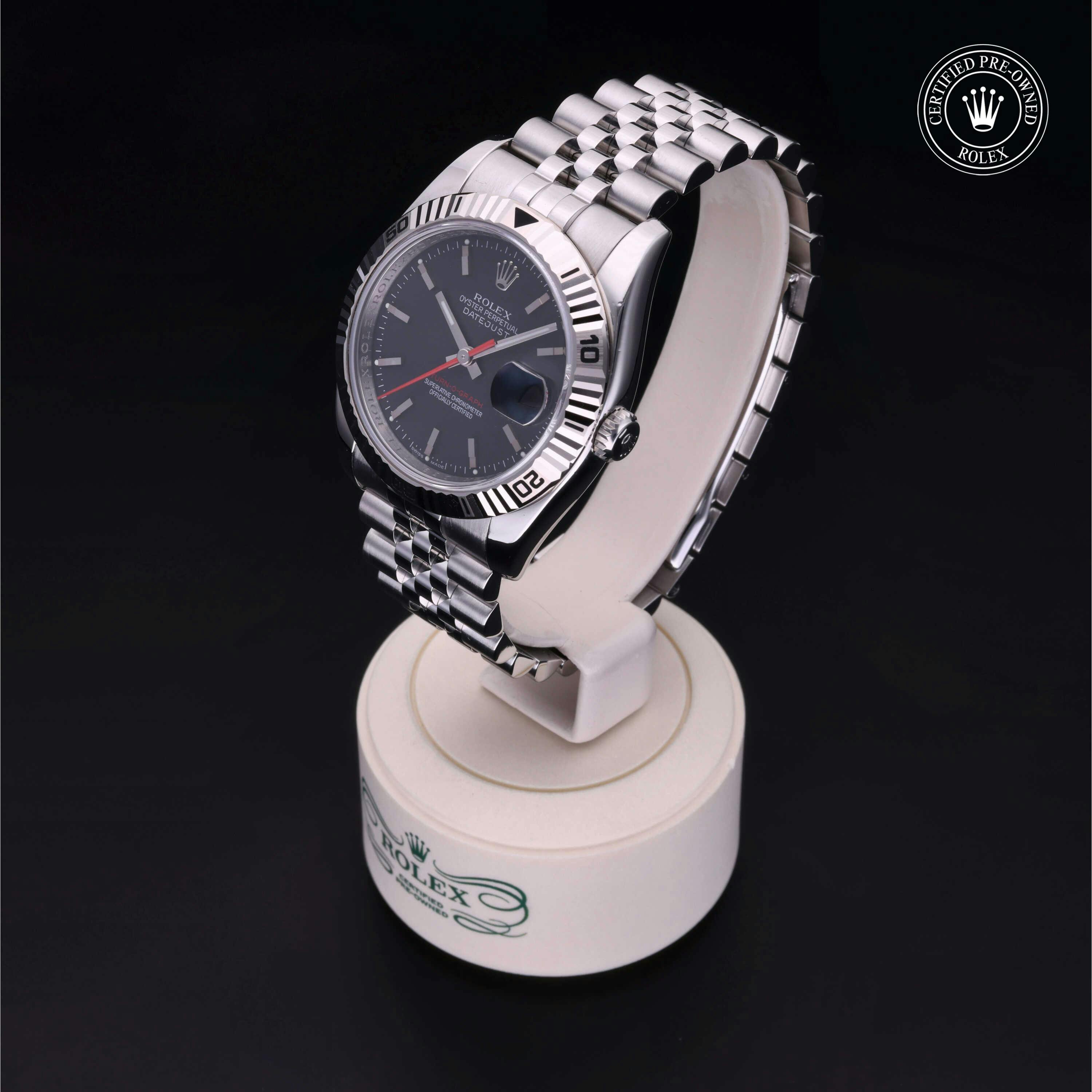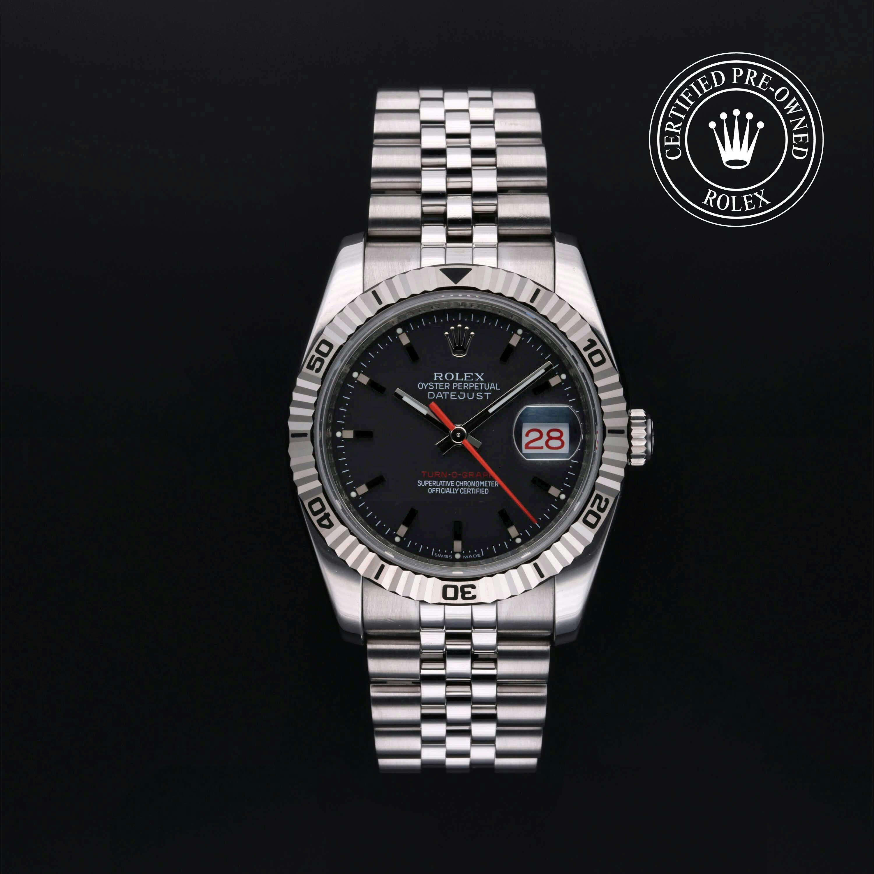 Rolex Certified Pre-Owned Datejust Turn-O-Graph (116264) self - winding automatic watch, features a 36mm stainless steel case with an 18k white gold fluted Turn-O-Graph bezel surrounding a black dial on a stainless steel jubilee bracelet. Functions include hours, minutes, seconds and date. This watch has received Rolex-authorized service and certification. It comes with the original box, and includes a custom Rolex Certified Pre-Owned hang tag, travel pouch and RCPO international warranty card.