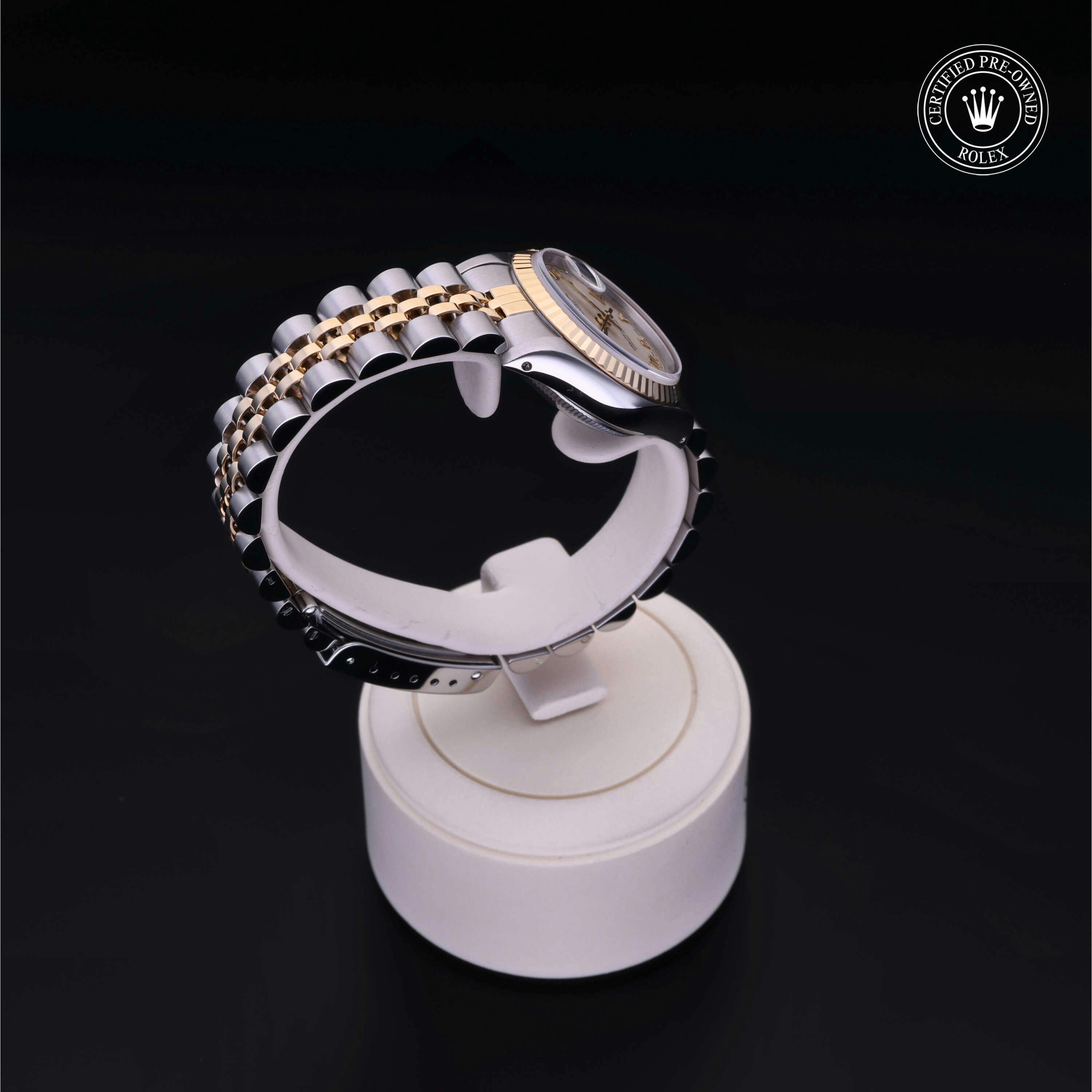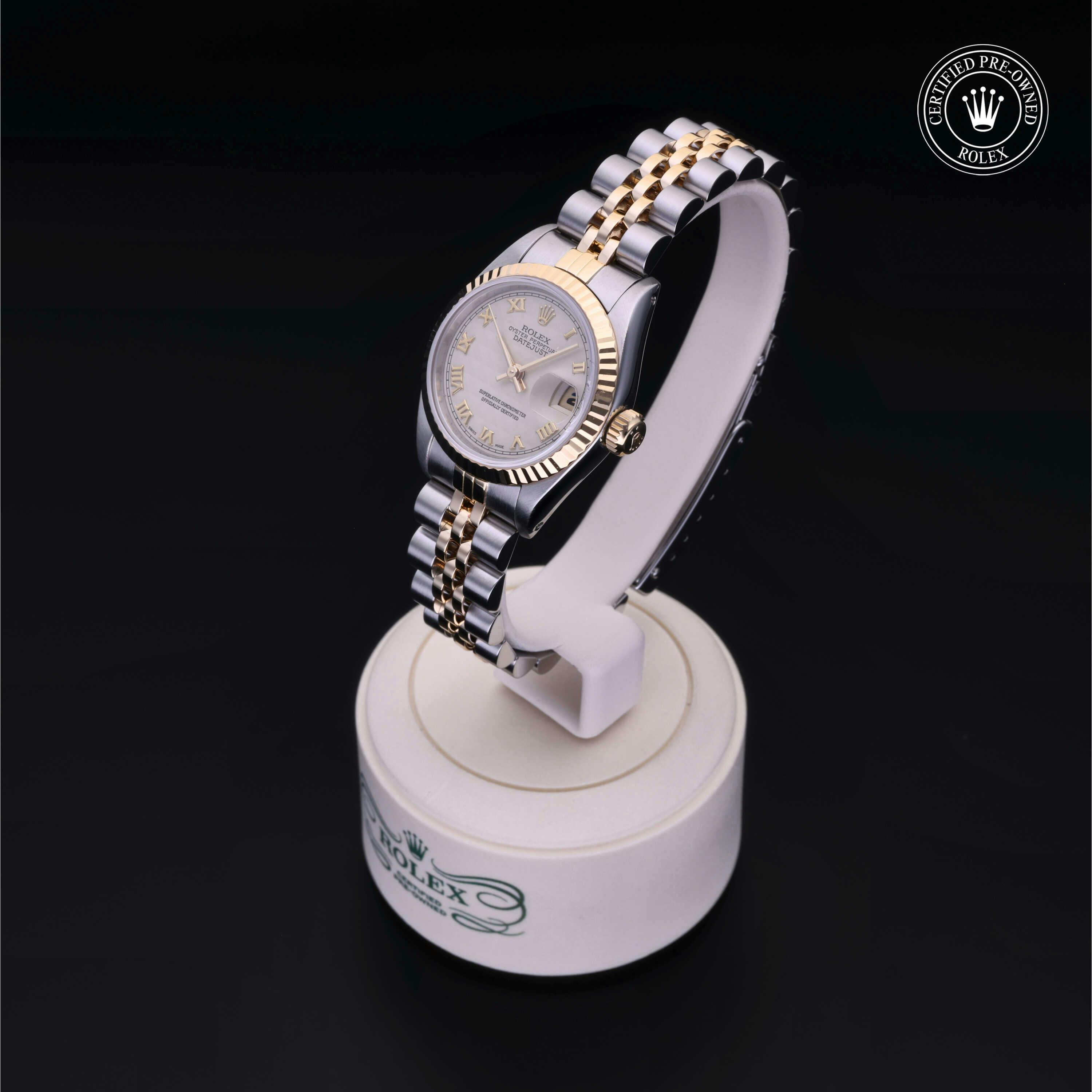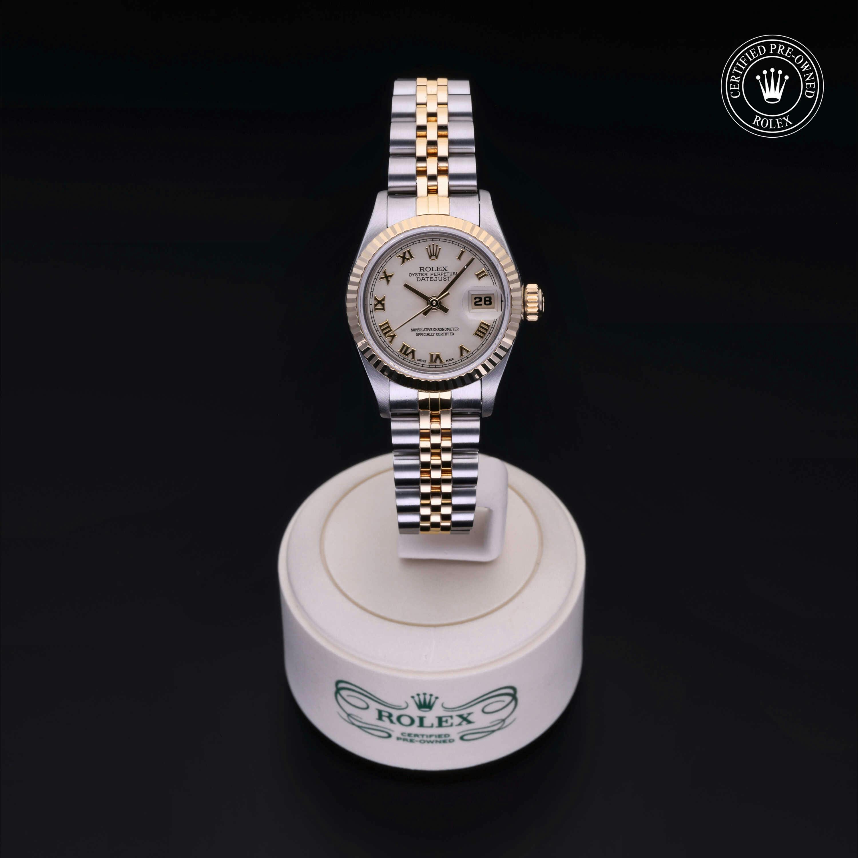 Rolex Certified Pre-Owned Datejust (69173) self - winding automatic watch, features a 26mm stainless steel case with an 18k yellow gold fluted bezel surrounding an ivory pyramid dial on a stainless steel and 18k yellow gold jubilee bracelet. Functions include hours, minutes, seconds and date. This watch has received Rolex-authorized service and certification. It does not come with the original box or papers, but includes a custom Rolex Certified Pre-Owned hang tag, travel pouch and RCPO international warranty card.