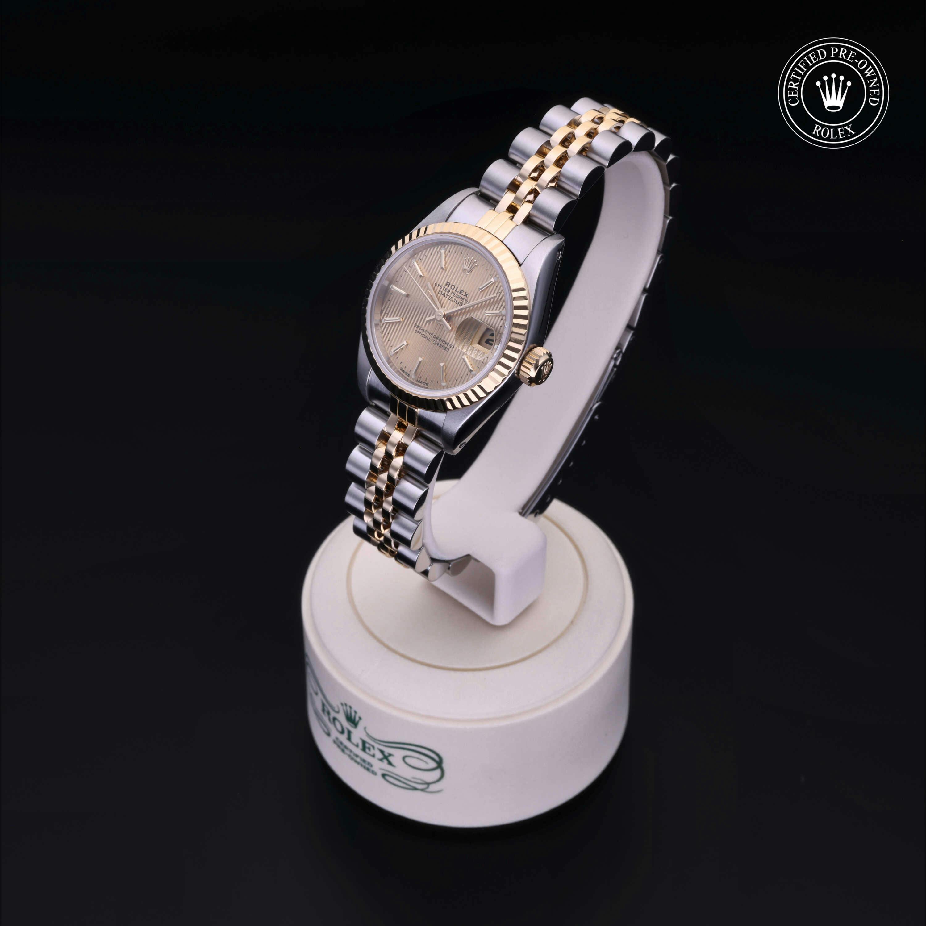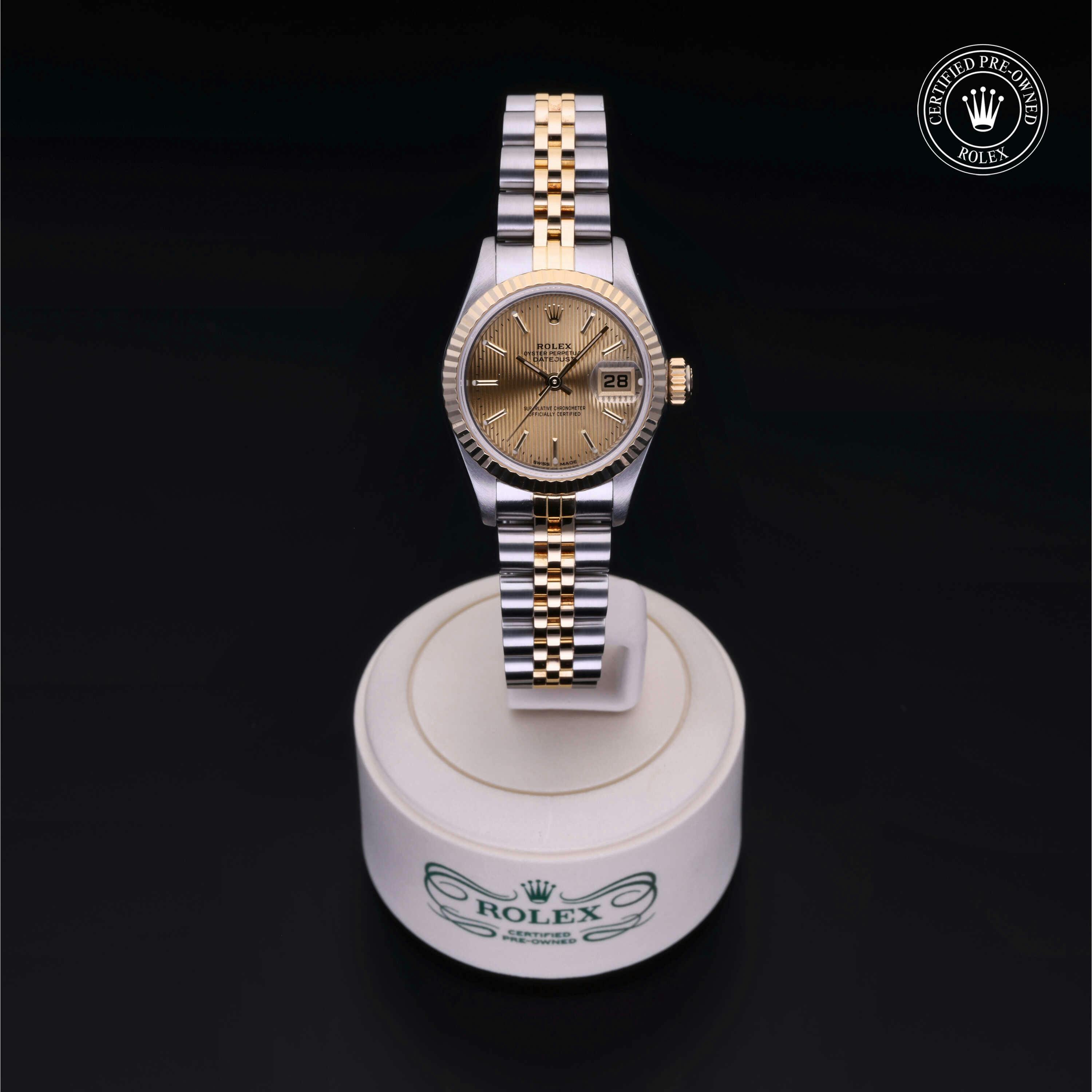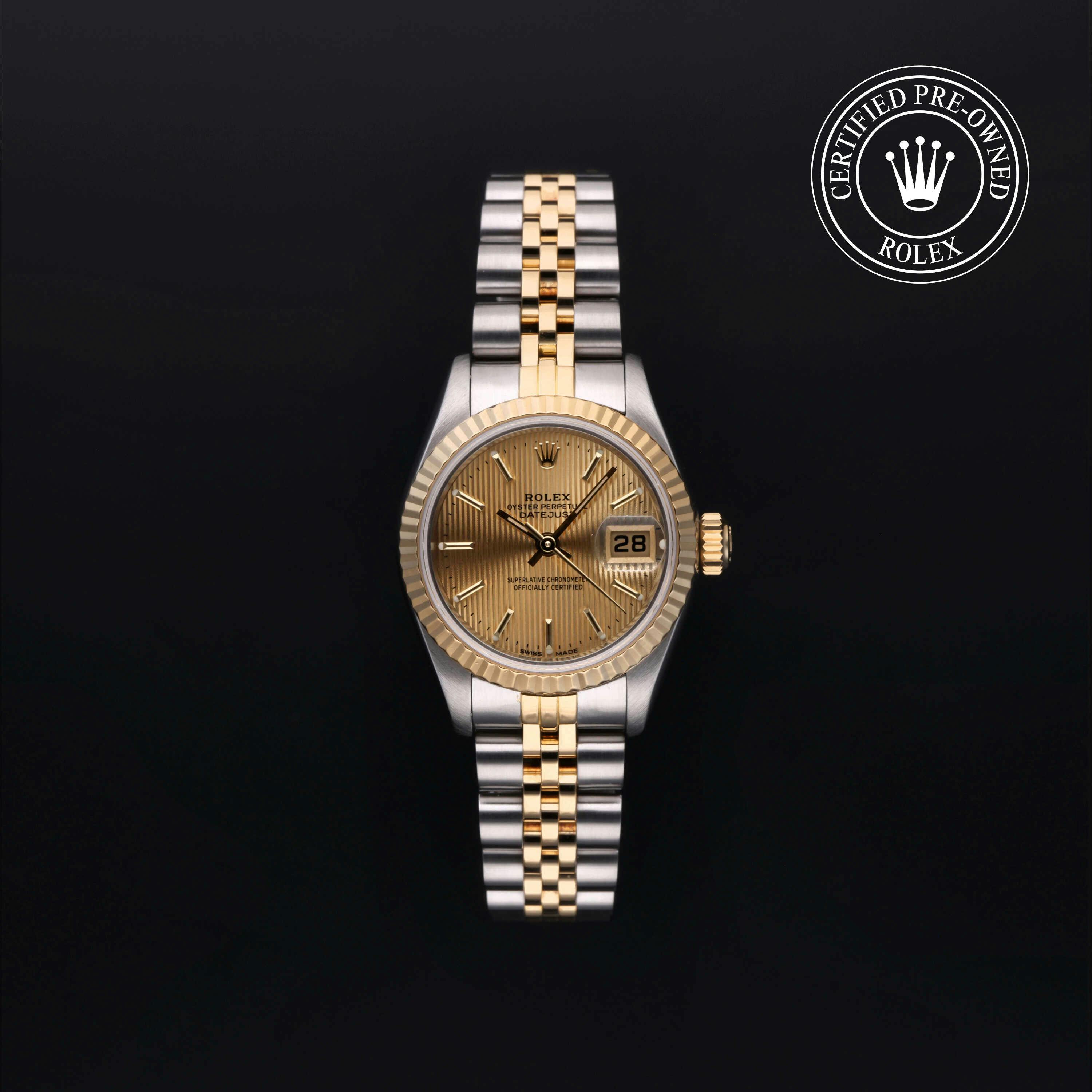 Rolex Certified Pre-Owned Datejust (69173) self - winding automatic watch, features a 26mm stainless steel case with an 18k yellow gold fluted bezel surrounding a champagne tapestry pattern index dial. The watch is secured on a stainless steel and 18k yellow gold Jubilee bracelet complete with a folding buckle. Functions include hours, minutes, seconds and date. This watch has been serviced by an authorized service center and certified by Rolex. It does not come with the original box or papers, but includes a custom Rolex Certified Pre-Owned hang tag, travel pouch and international warranty card.