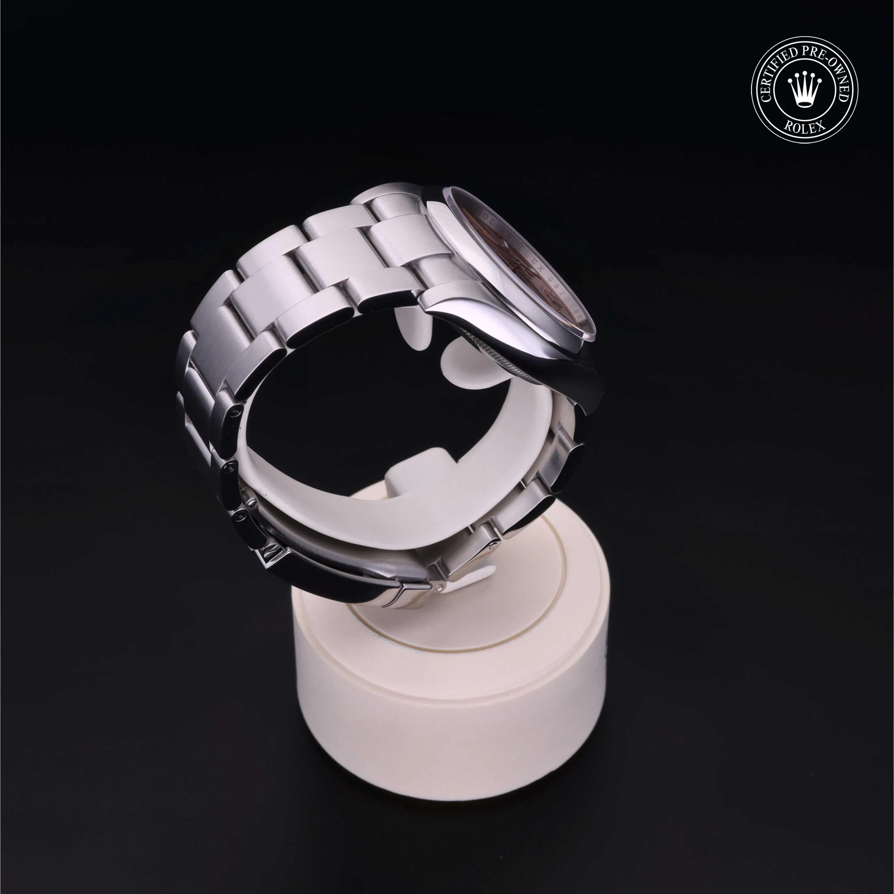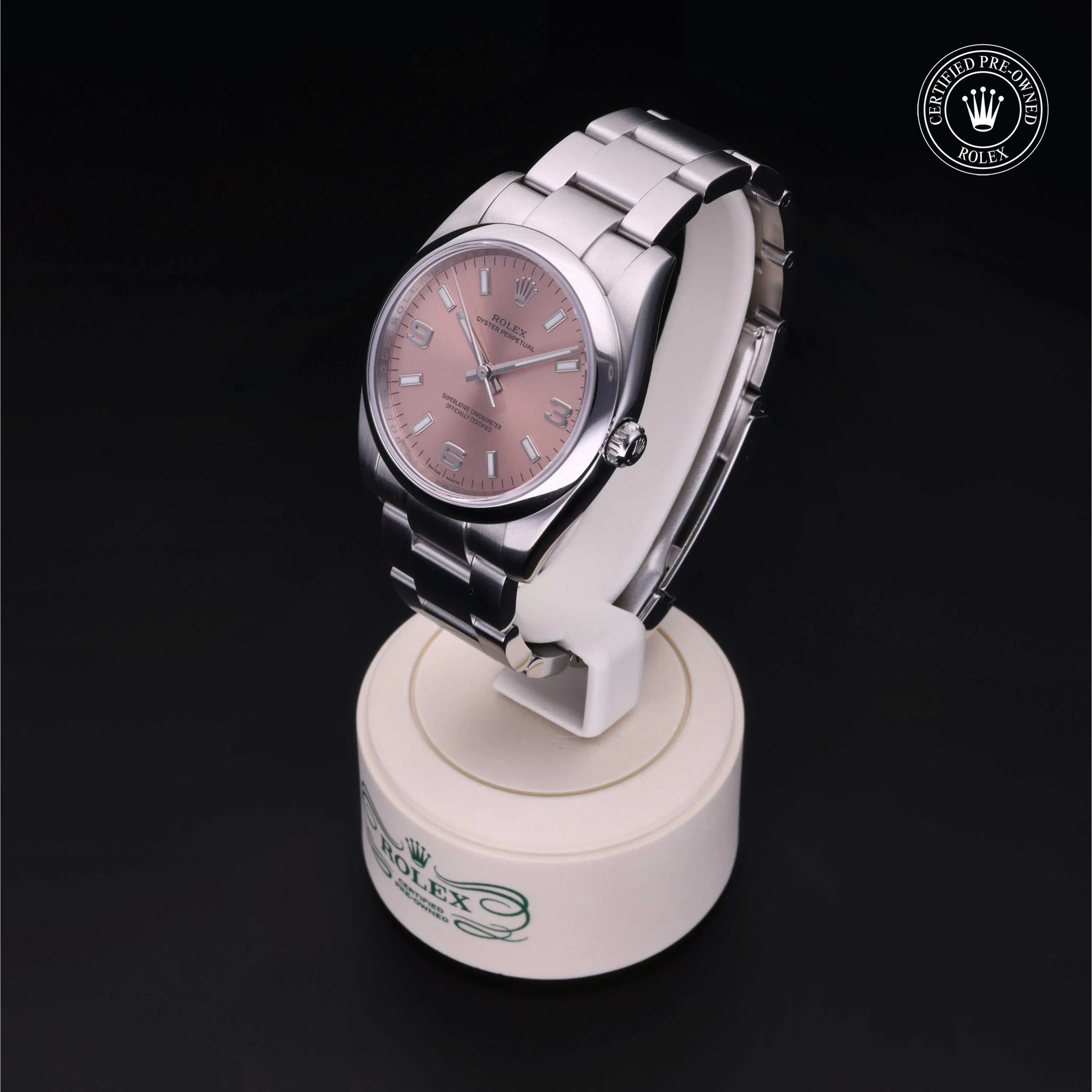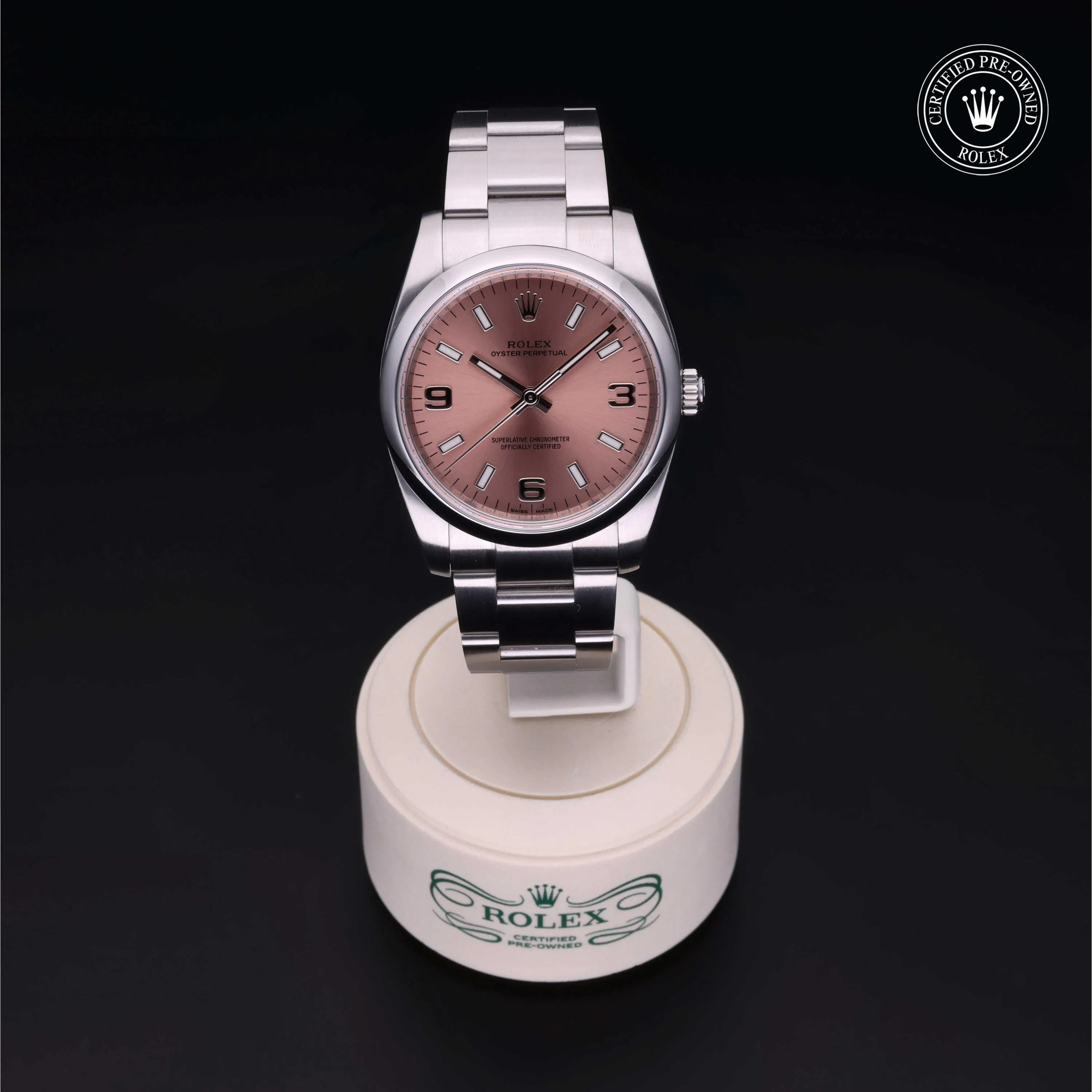 Rolex Certified Pre-Owned Oyster Perpetual (114200) self - winding automatic watch, features a 34mm stainless steel case and domed bezel surrounding a pink dial on a stainless steel oyster bracelet. Functions include hours, minutes and seconds. This watch has received Rolex-authorized service and certification. It does not come with the original box or papers, but includes a custom Rolex Certified Pre-Owned hang tag, travel pouch and RCPO international warranty card.