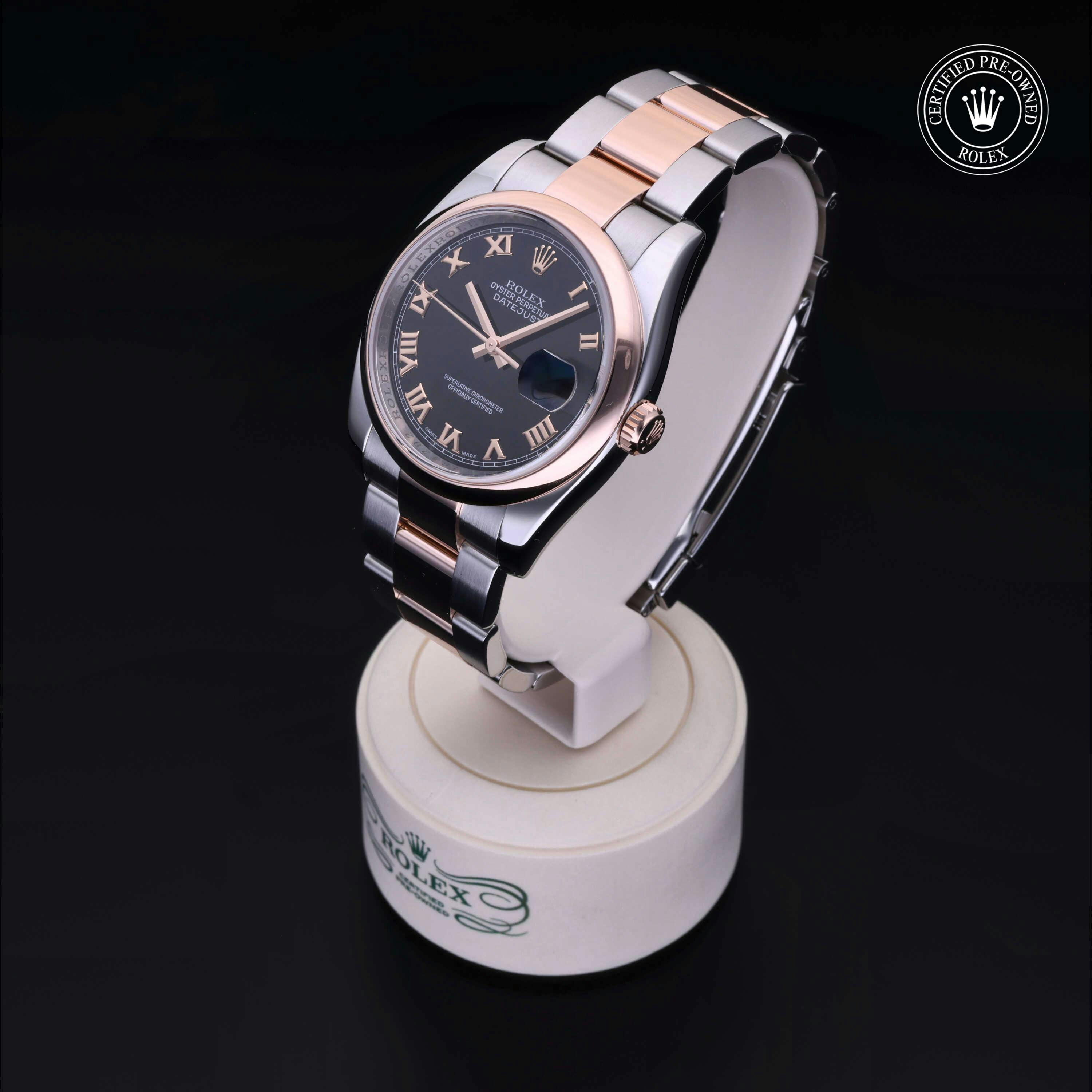 Rolex Certified Pre-Owned Datejust (116201) self - winding automatic watch, features a 36mm stainless steel case with an 18k rose gold domed bezel surrounding a black dial on a stainless steel and 18k rose gold oyster bracelet. Functions include hours, minutes, seconds and date. This watch has received Rolex-authorized service and certification. It does not come with the original box or papers, but includes a custom Rolex Certified Pre-Owned hang tag, travel pouch and RCPO international warranty card.