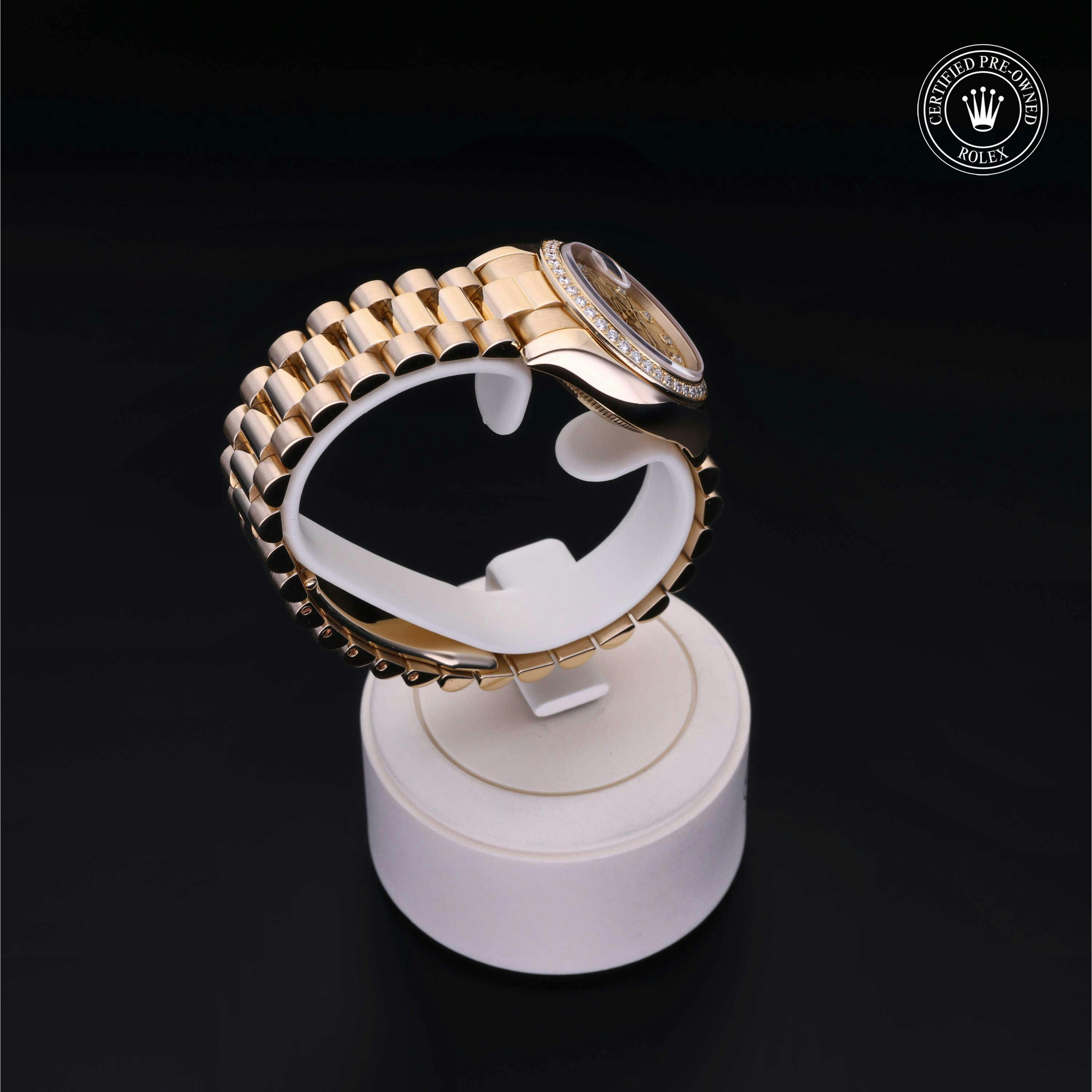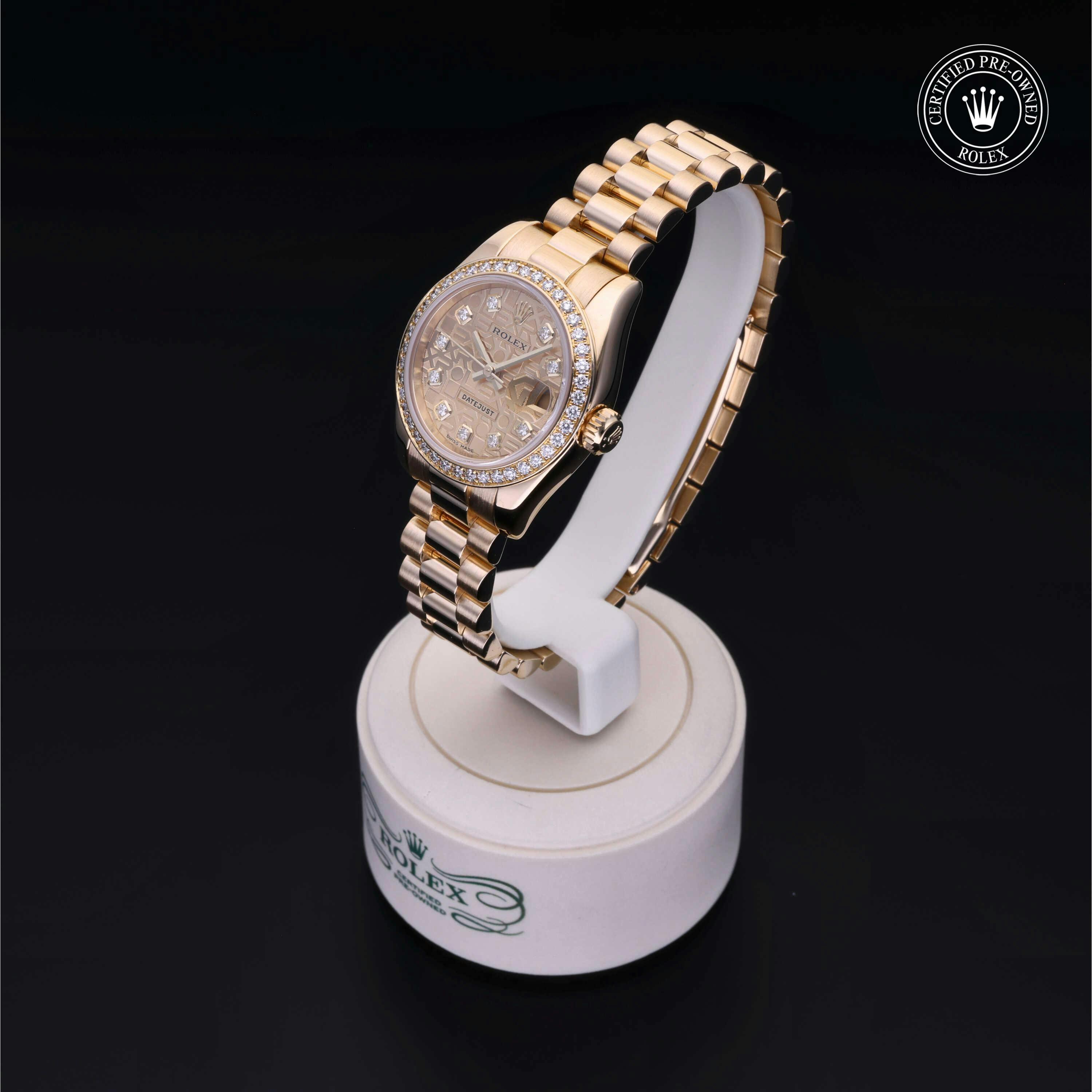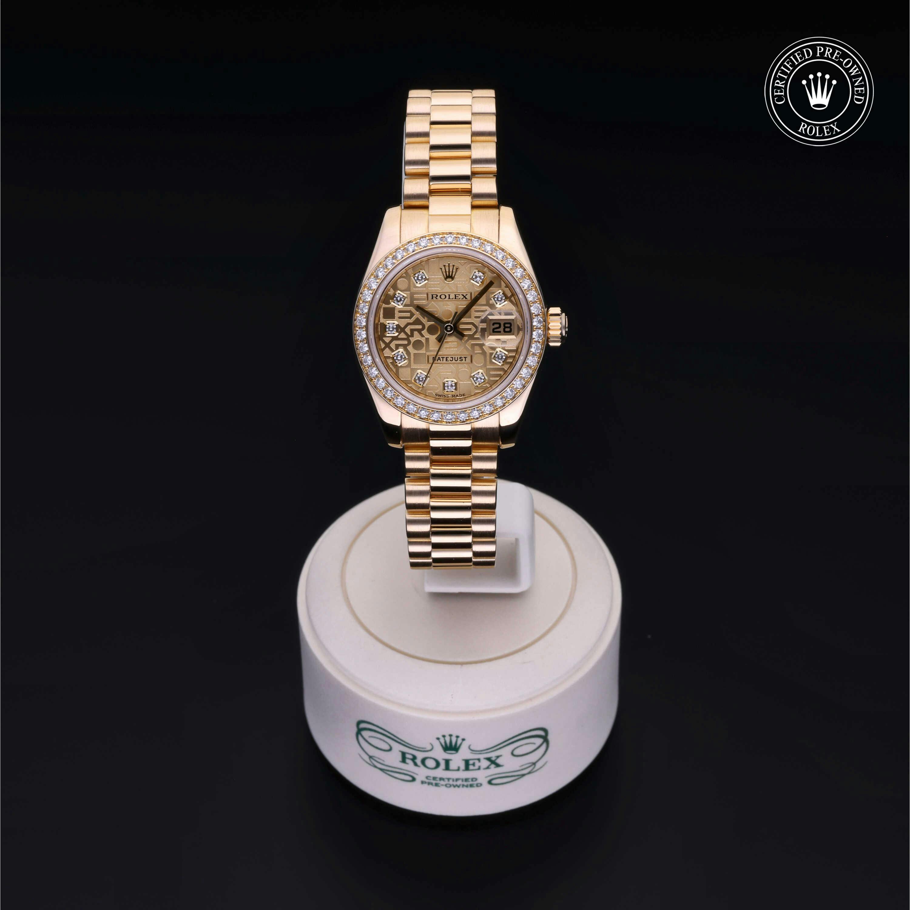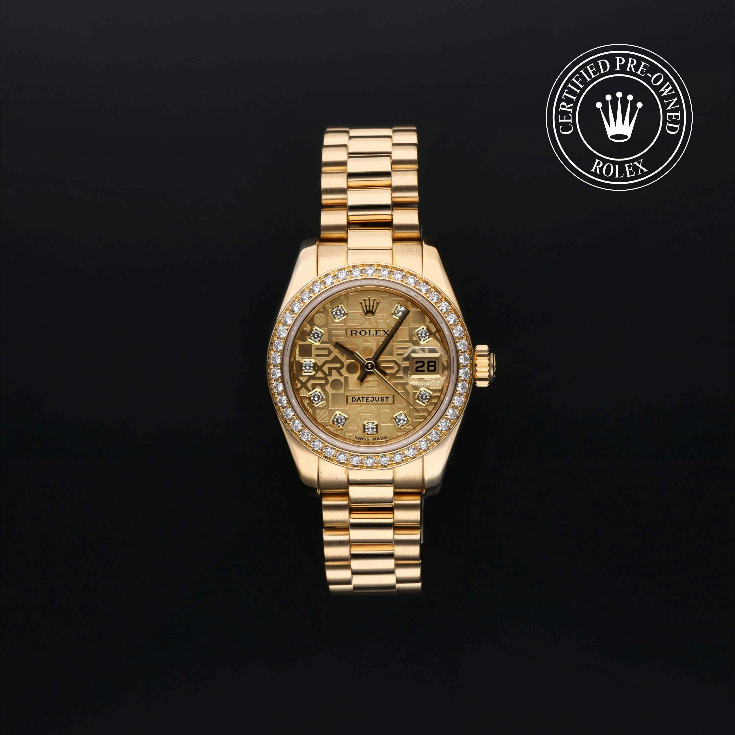 Rolex Certified Pre-Owned Datejust (179138) self - winding automatic watch, features a 26mm 18k yellow gold case with a diamond set bezel surrounding a champagne Jubilee diamond set dial on an 18k yellow gold president bracelet. Functions include hours, minutes, seconds and date. This watch has received Rolex-authorized service and certification. It does not come with the original box or papers, but includes a custom Rolex Certified Pre-Owned hang tag, travel pouch and RCPO international warranty card.