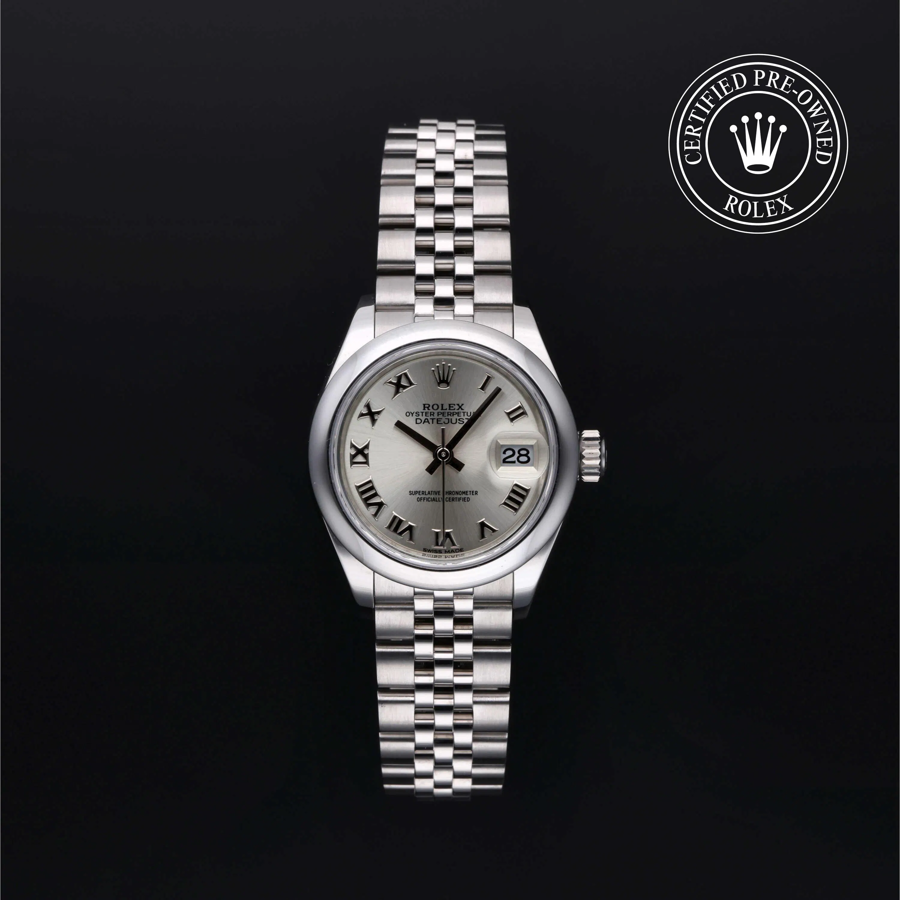 Rolex Certified Pre-Owned Datejust (279160) self - winding automatic watch, features a 28mm stainless steel case and domed bezel surrounding a silver dial on a stainless steel oyster bracelet. Functions include hours, minutes, seconds and date. This watch has received Rolex-authorized service and certification. It comes with the original box, and includes a custom Rolex Certified Pre-Owned hang tag, travel pouch and RCPO international warranty card.