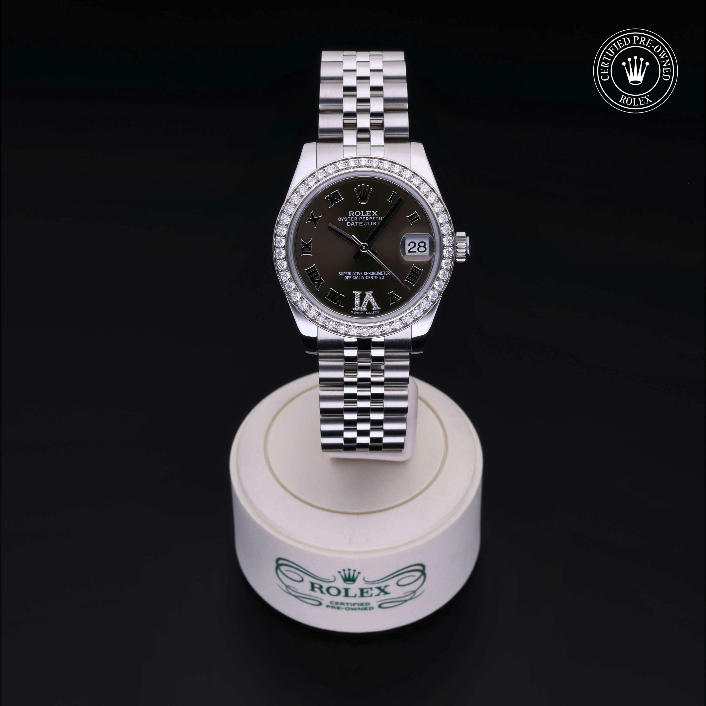 Rolex Certified Pre-Owned Datejust (178384) self - winding automatic watch, features a 31mm stainless steel case with an 18k white gold diamond set bezel surrounding a bronze diamond set dial on a stainless steel jubilee bracelet. Functions include hours, minutes, seconds and date. This watch has received Rolex-authorized service and certification. It comes with the original box and papers, and includes a custom Rolex Certified Pre-Owned hang tag, travel pouch and RCPO international warranty card.