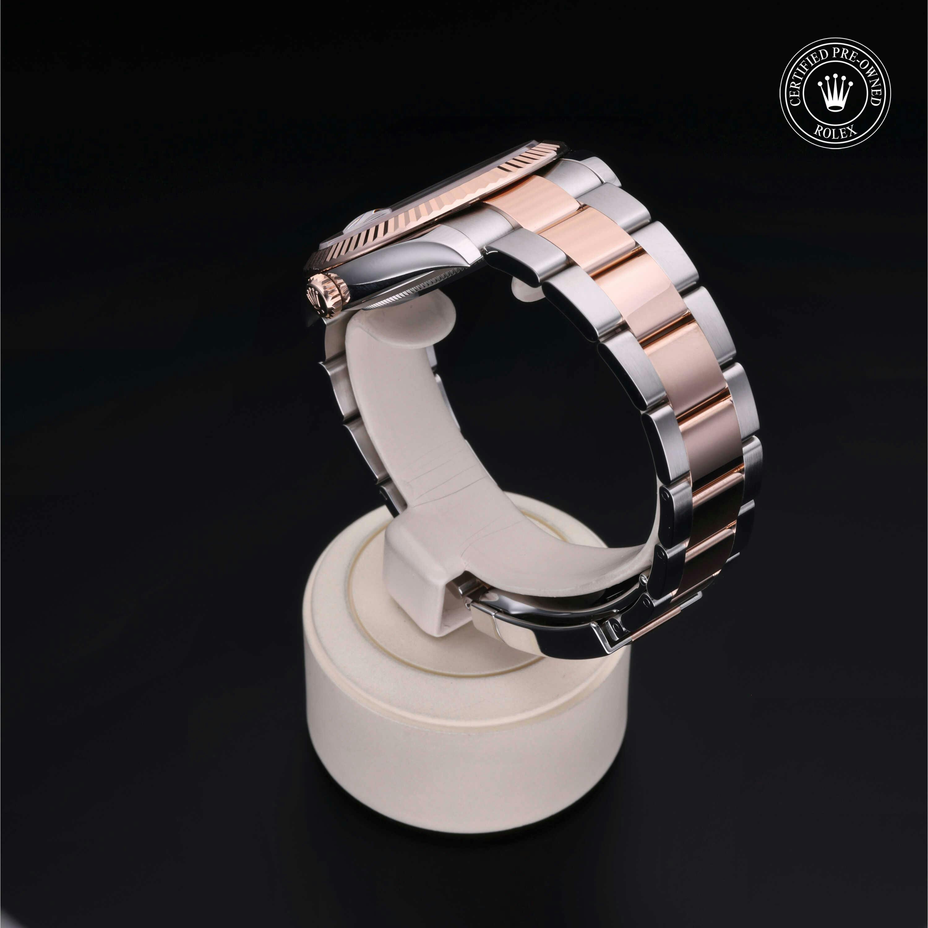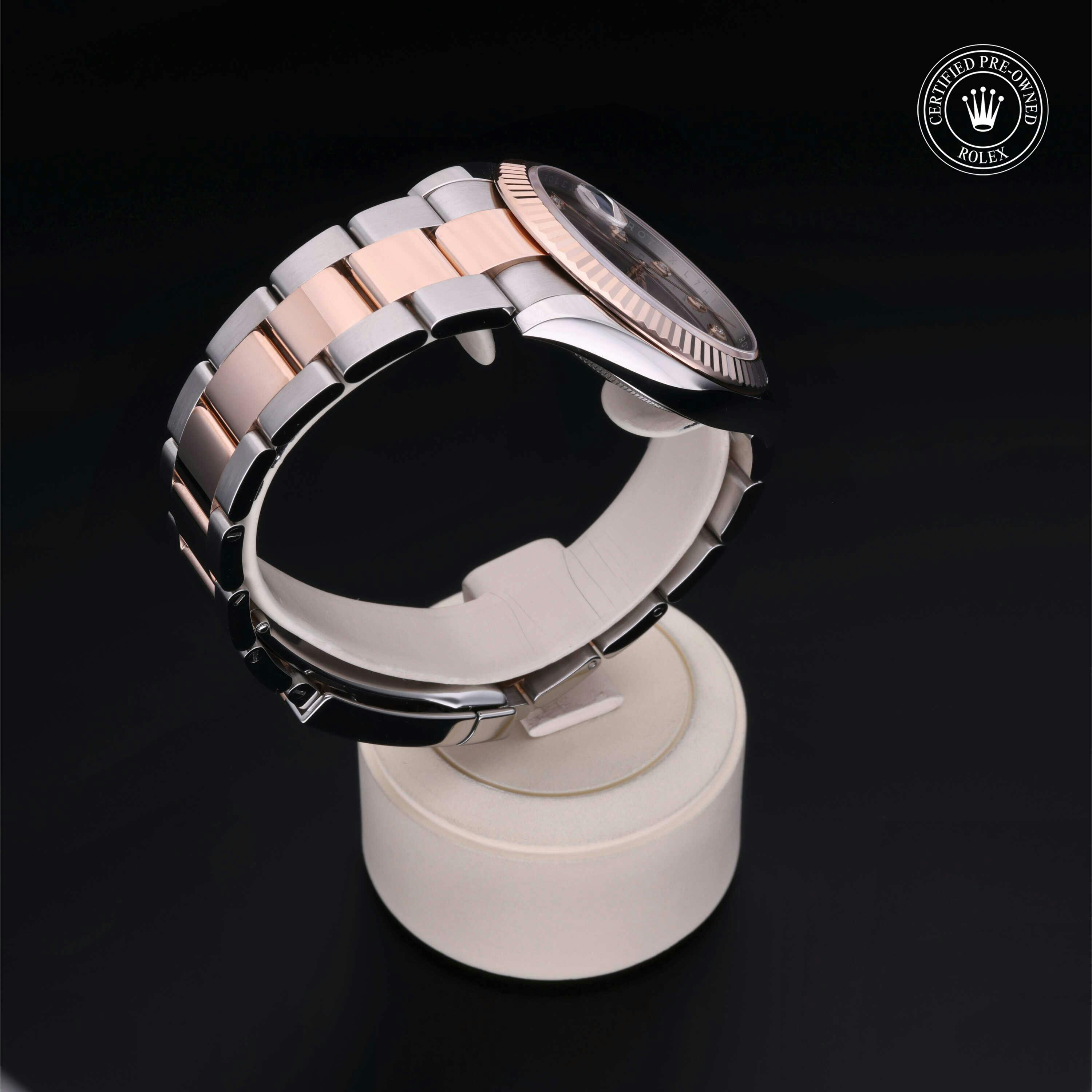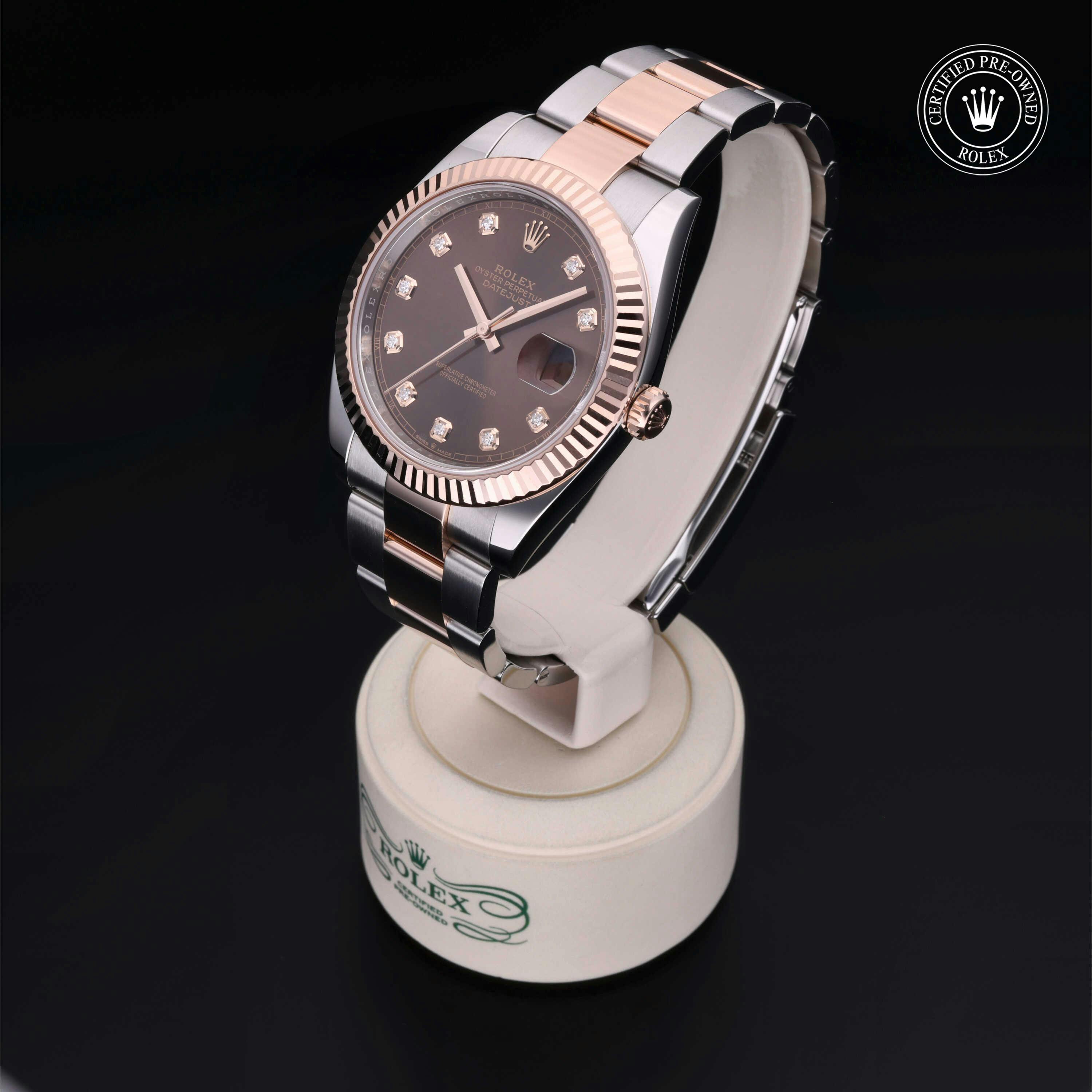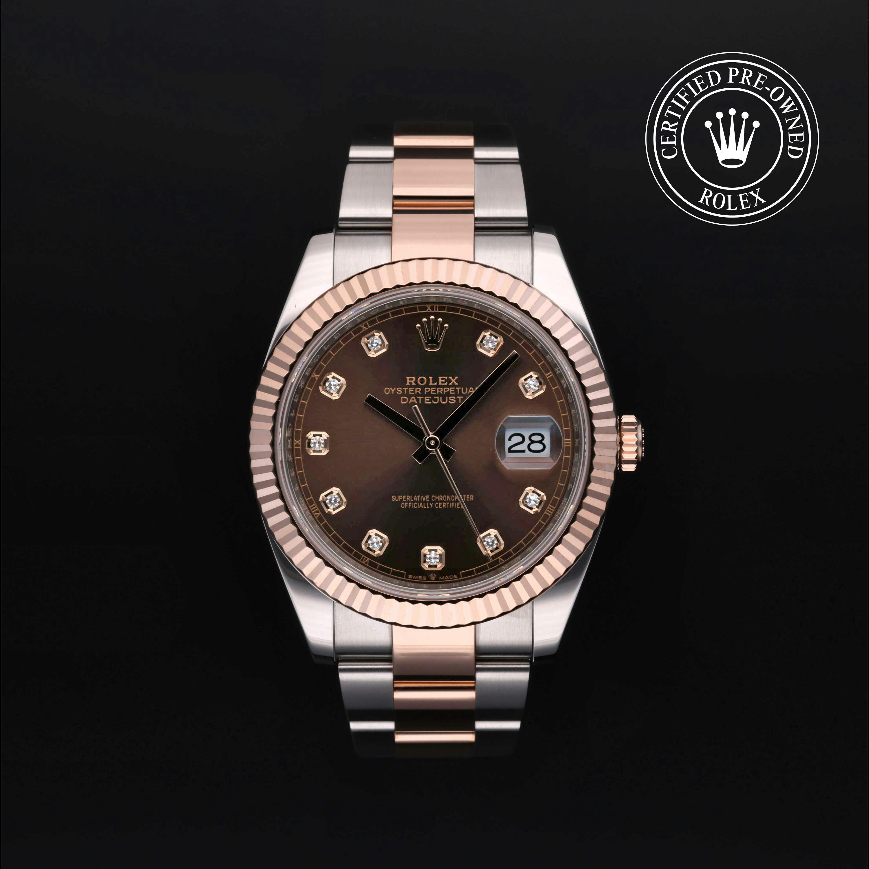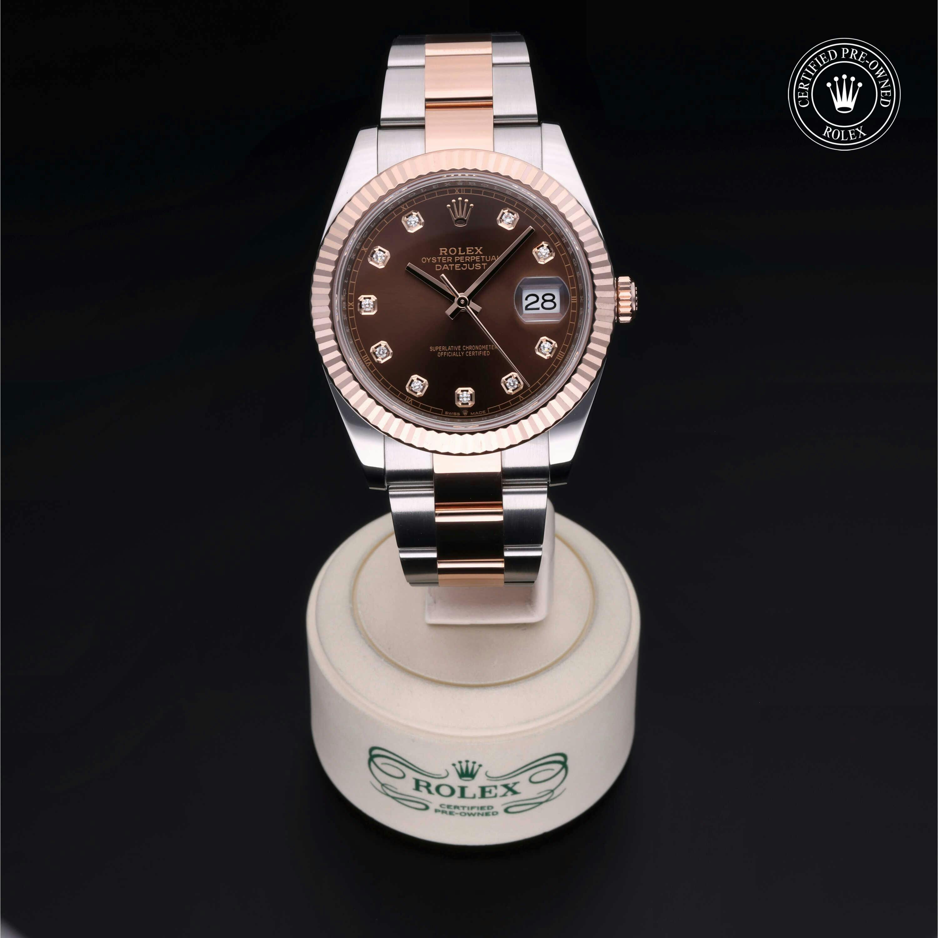 Rolex Certified Pre-Owned Datejust (126331) self - winding automatic watch, features a 41mm stainless steel case with an 18k rose gold fluted bezel surrounding a chocolate diamond set dial on a stainless steel and 18k rose gold oyster bracelet. Functions include hours, minutes, seconds and date. This watch has received Rolex-authorized service and certification. It comes with the original box and papers, and includes a custom Rolex Certified Pre-Owned hang tag, travel pouch and RCPO international warranty card.