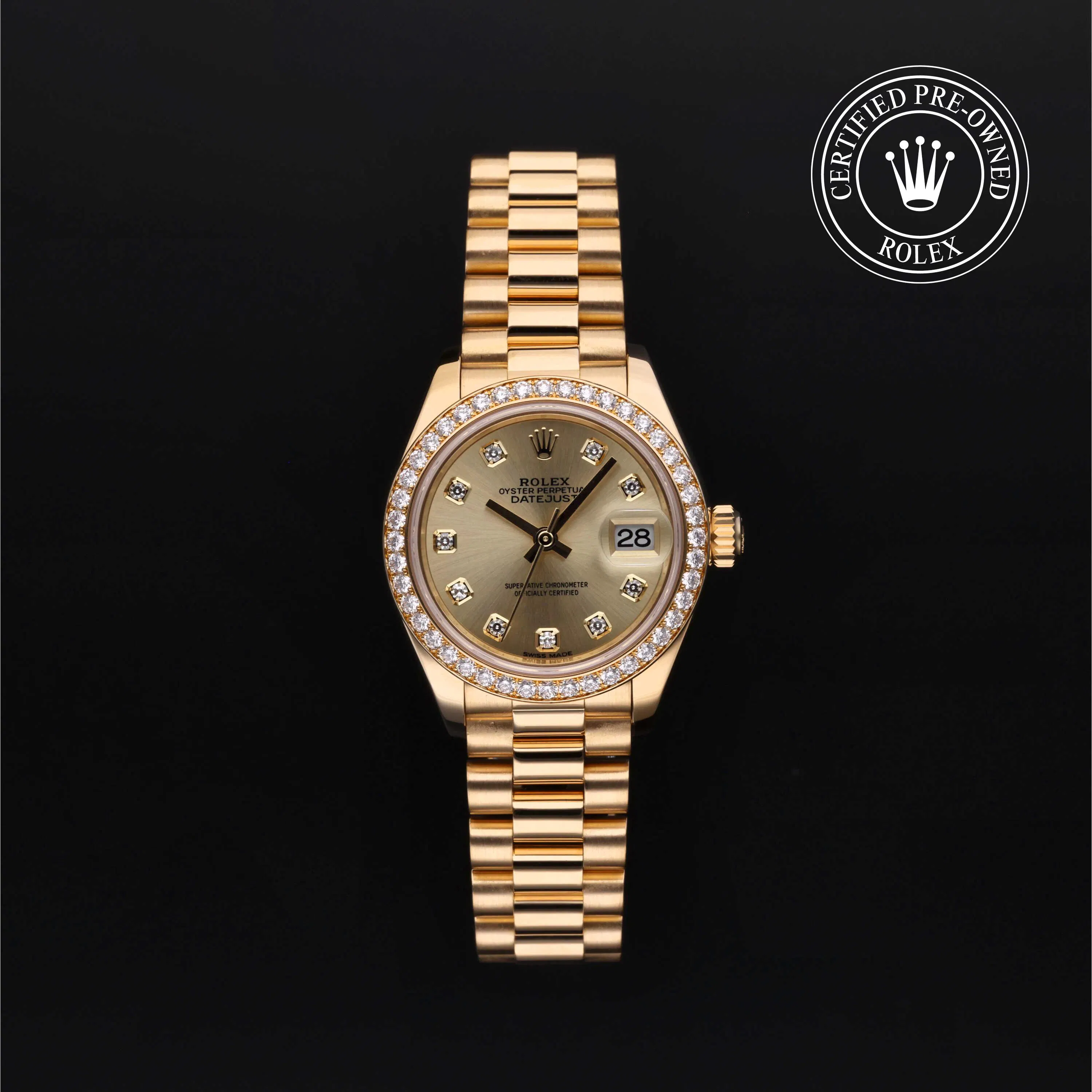 Rolex Certified Pre-Owned Datejust (279138RBR) self - winding automatic watch, features a 28mm 18k yellow gold case and diamond set bezel surrounding a champagne diamond set dial on an 18k yellow gold president bracelet. Functions include hours, minutes, seconds and date. This watch has received Rolex-authorized service and certification. It comes with the original papers, and includes a custom Rolex Certified Pre-Owned hang tag, travel pouch and RCPO international warranty card.