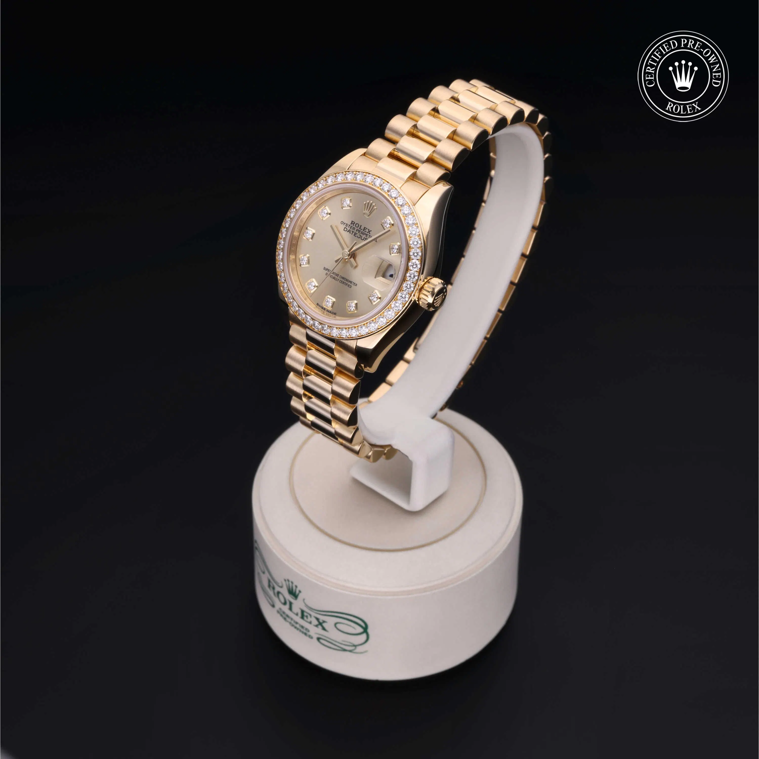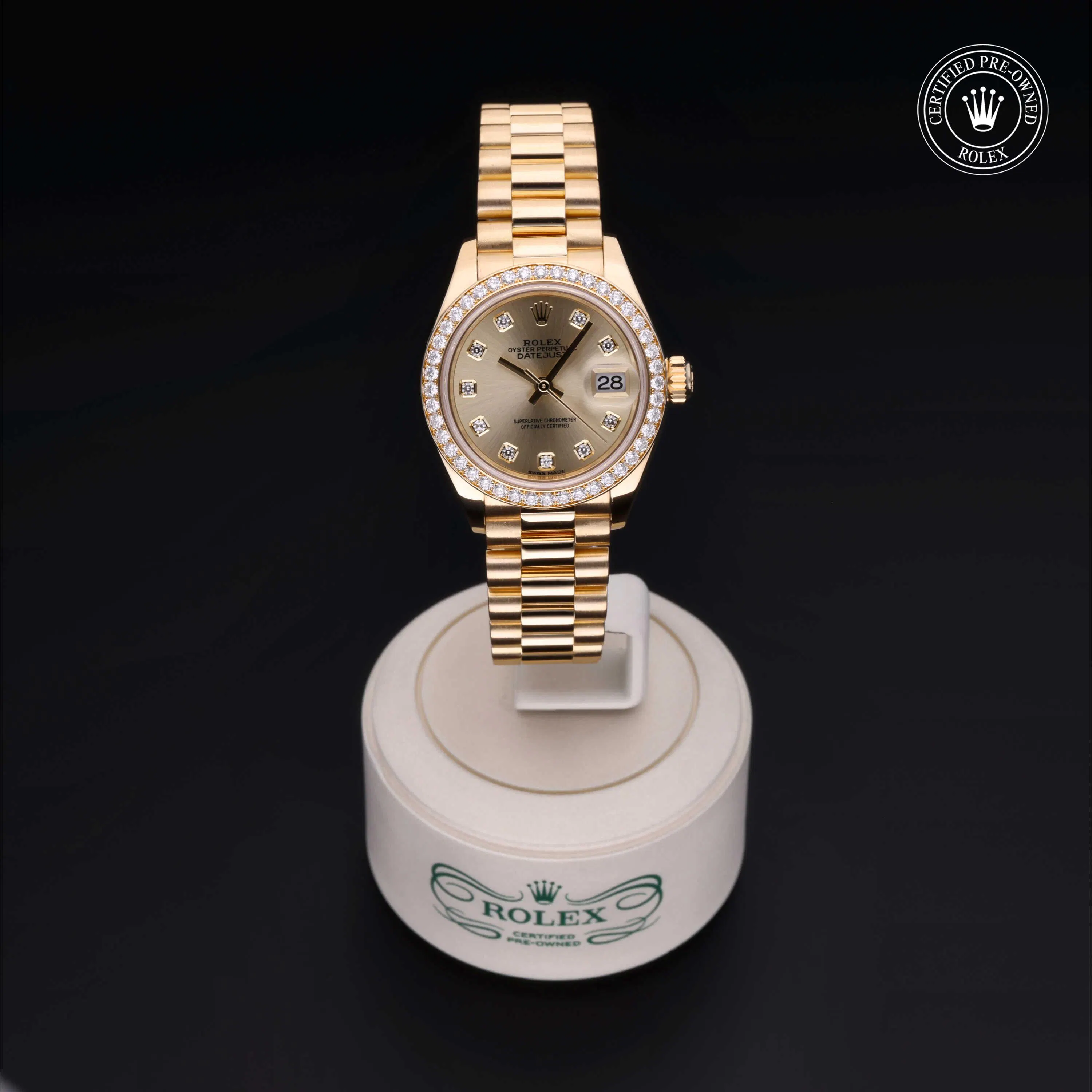 Rolex Certified Pre-Owned Datejust (279138RBR) self - winding automatic watch, features a 28mm 18k yellow gold case and diamond set bezel surrounding a champagne diamond set dial on an 18k yellow gold president bracelet. Functions include hours, minutes, seconds and date. This watch has received Rolex-authorized service and certification. It comes with the original papers, and includes a custom Rolex Certified Pre-Owned hang tag, travel pouch and RCPO international warranty card.