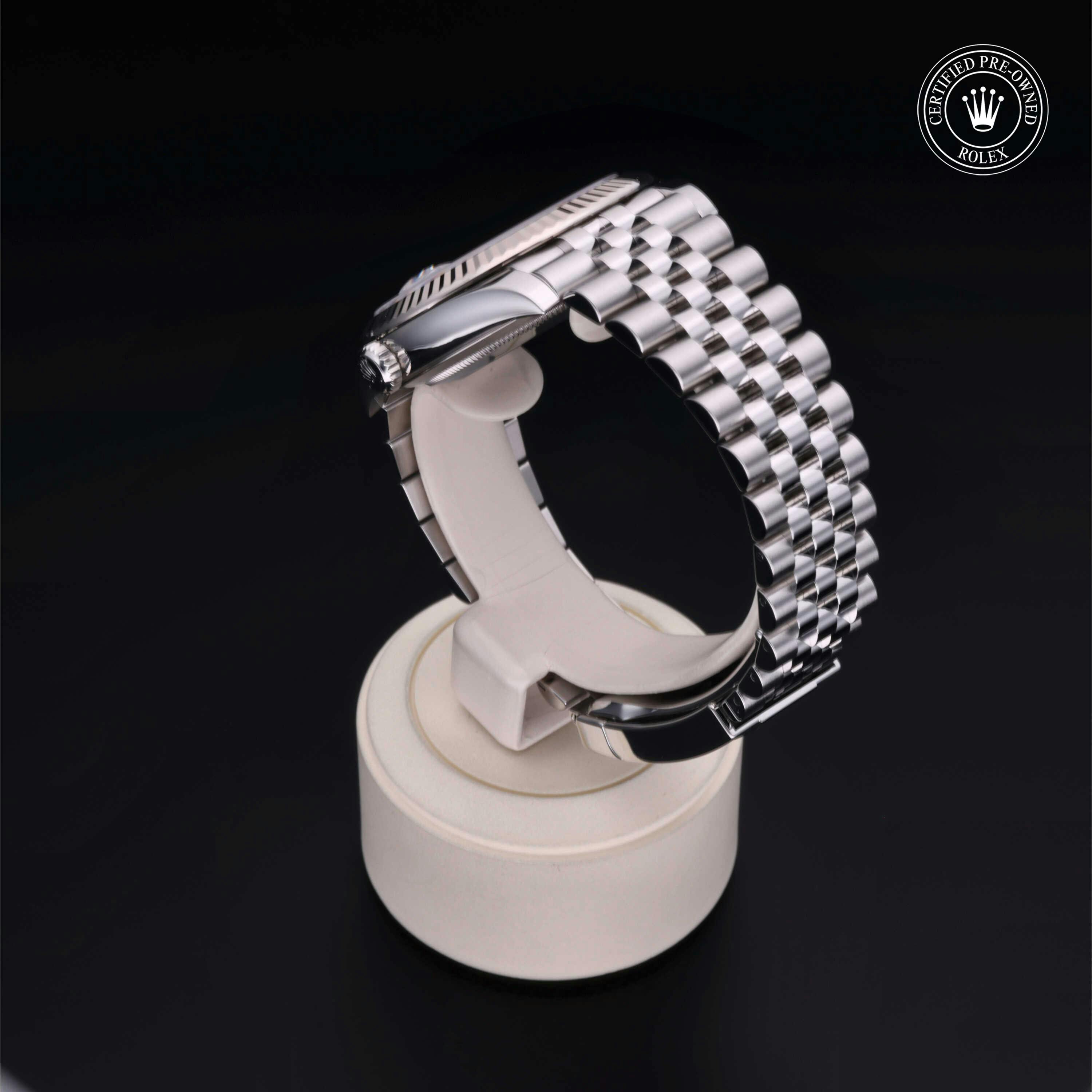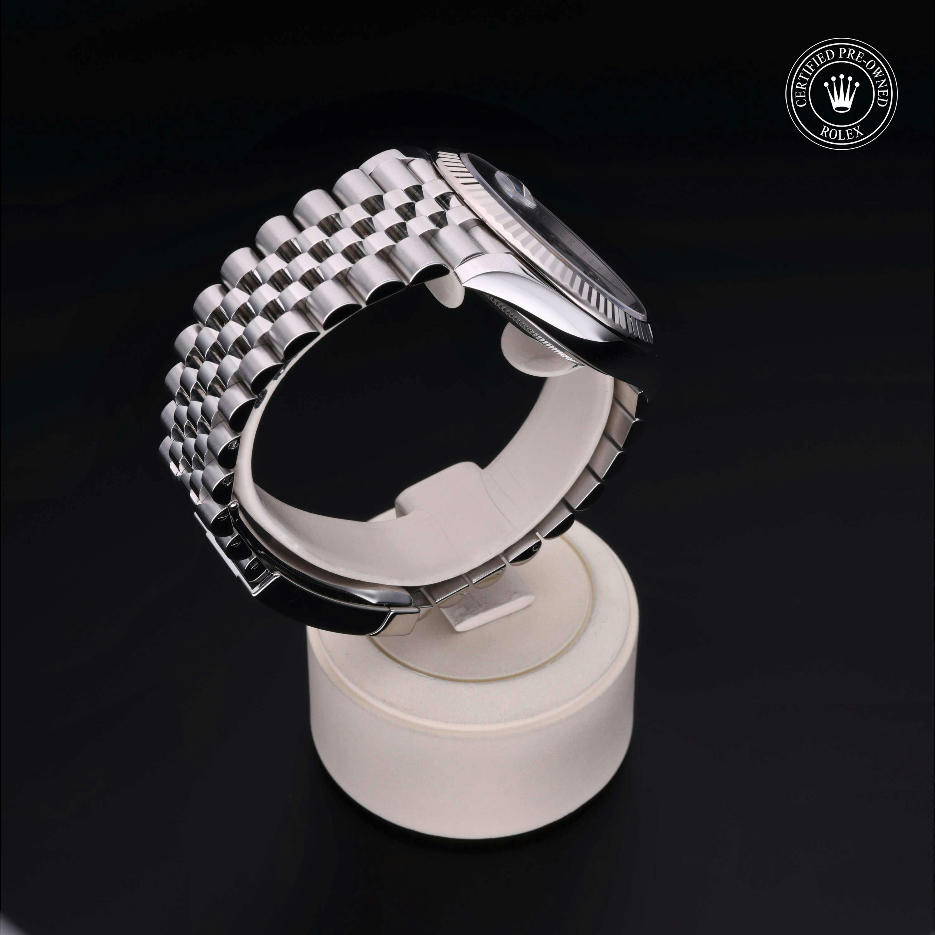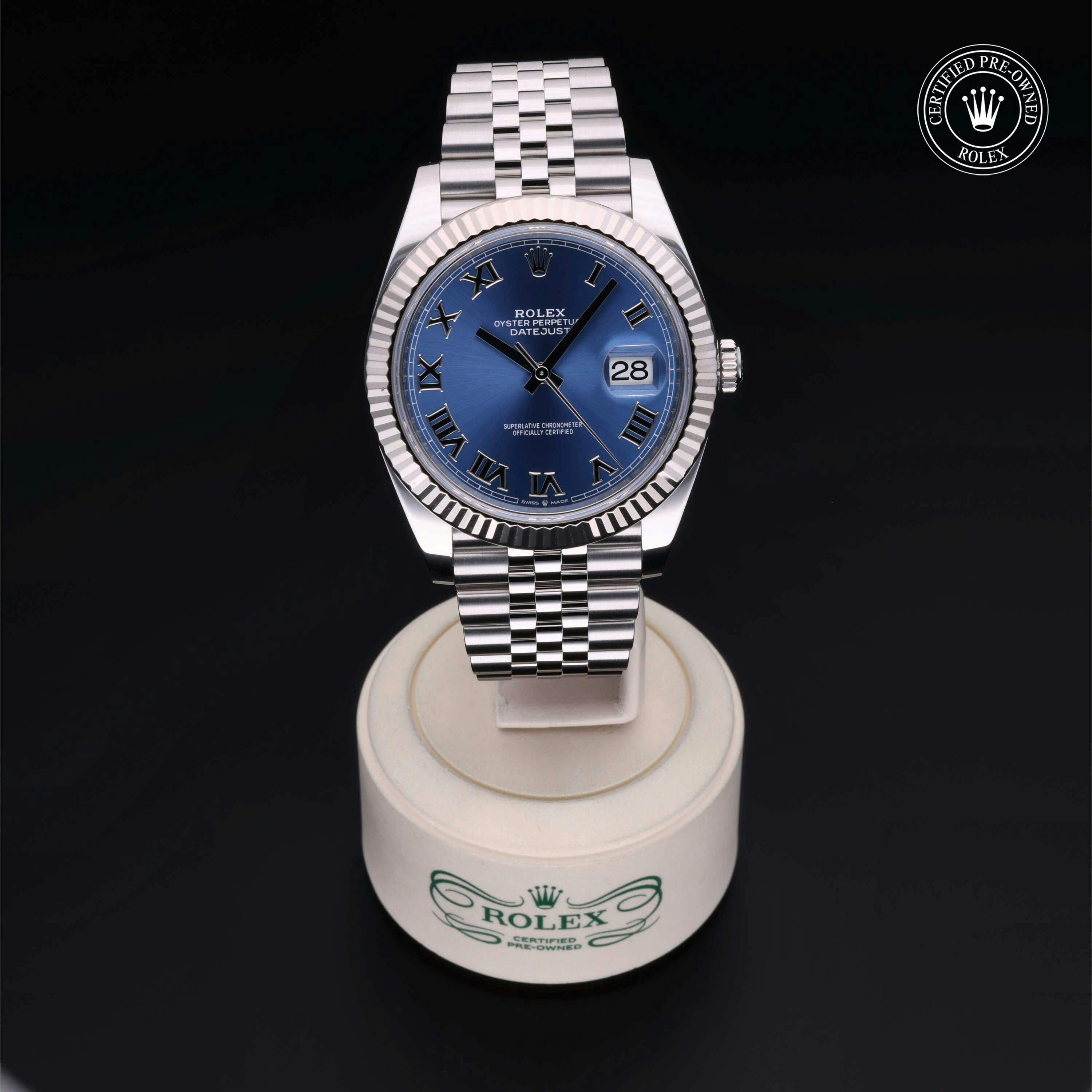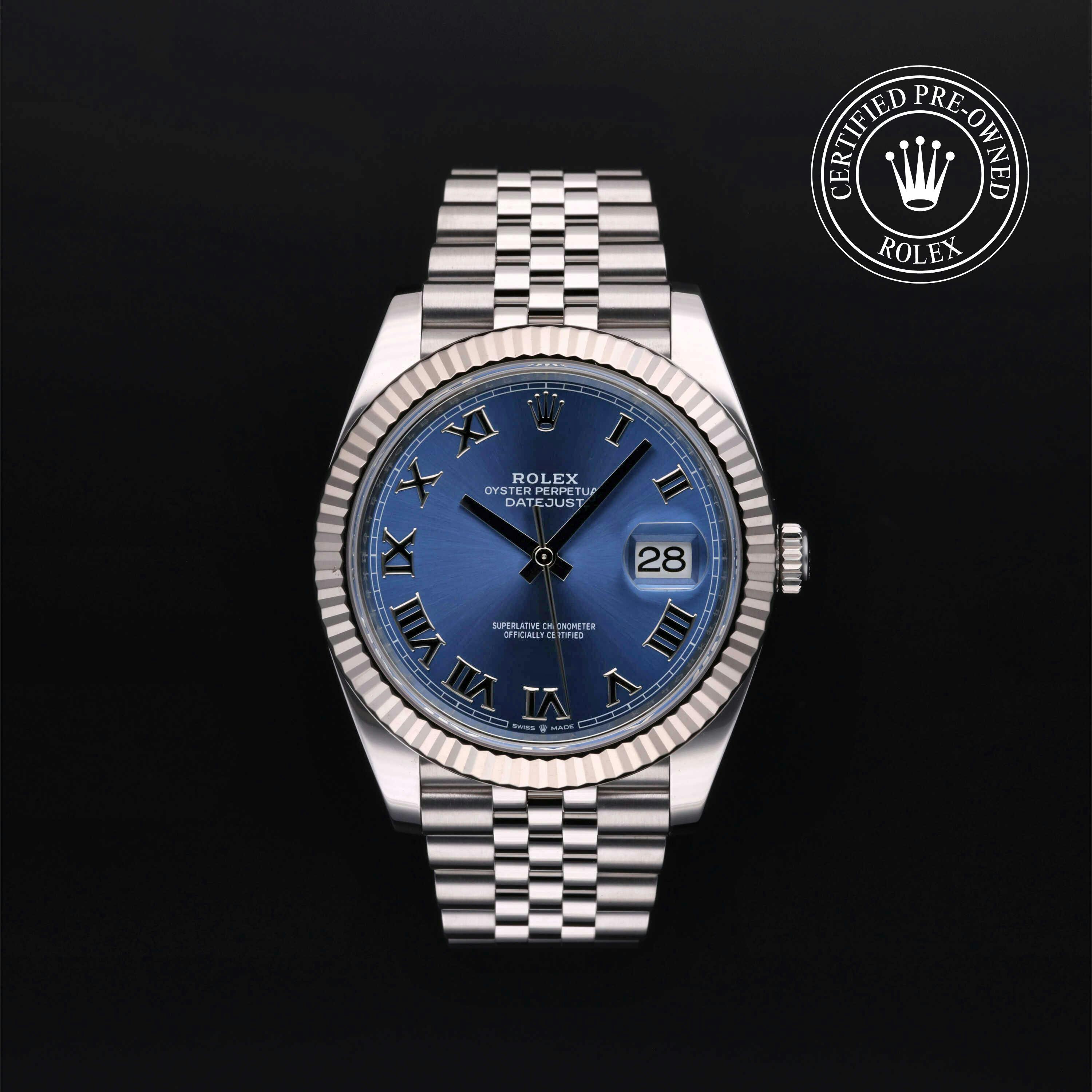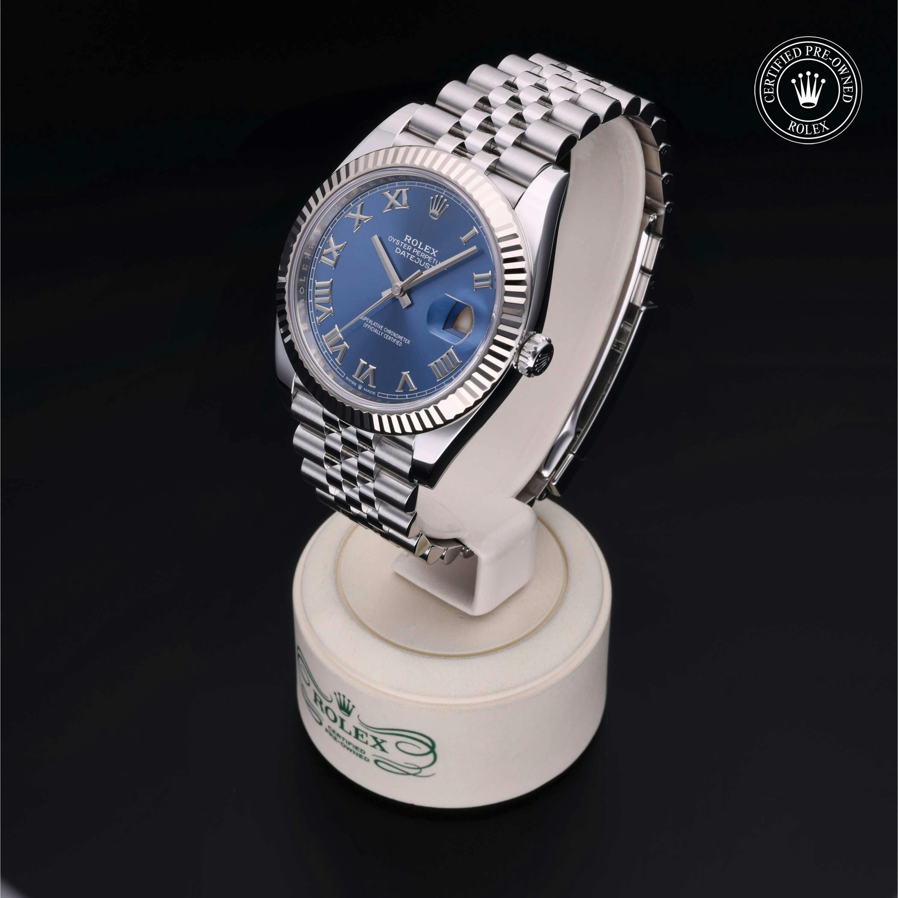 Rolex Certified Pre-Owned Datejust (126334) self - winding automatic watch, features a 41mm stainless steel case with an 18k white gold fluted bezel surrounding an Azzurro blue dial on a stainless steel jubilee bracelet. Functions include hours, minutes, seconds and date. This watch has received Rolex-authorized service and certification. It comes with the original box and papers, and includes a custom Rolex Certified Pre-Owned hang tag, travel pouch and RCPO international warranty card.