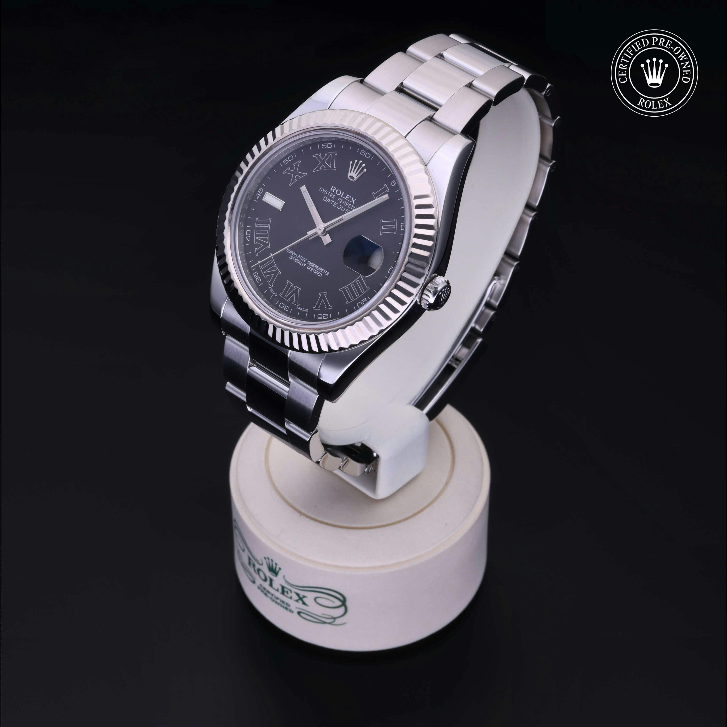 Rolex Certified Pre-Owned Datejust II (116334) self - winding automatic watch, features a 41mm stainless steel case with an 18k white gold fluted bezel surrounding a matte black dial on a stainless steel oyster bracelet. Functions include hours, minutes, seconds and date. This watch has received Rolex-authorized service and certification. It does not come with the original box or papers, but includes a custom Rolex Certified Pre-Owned hang tag, travel pouch and RCPO international warranty card.