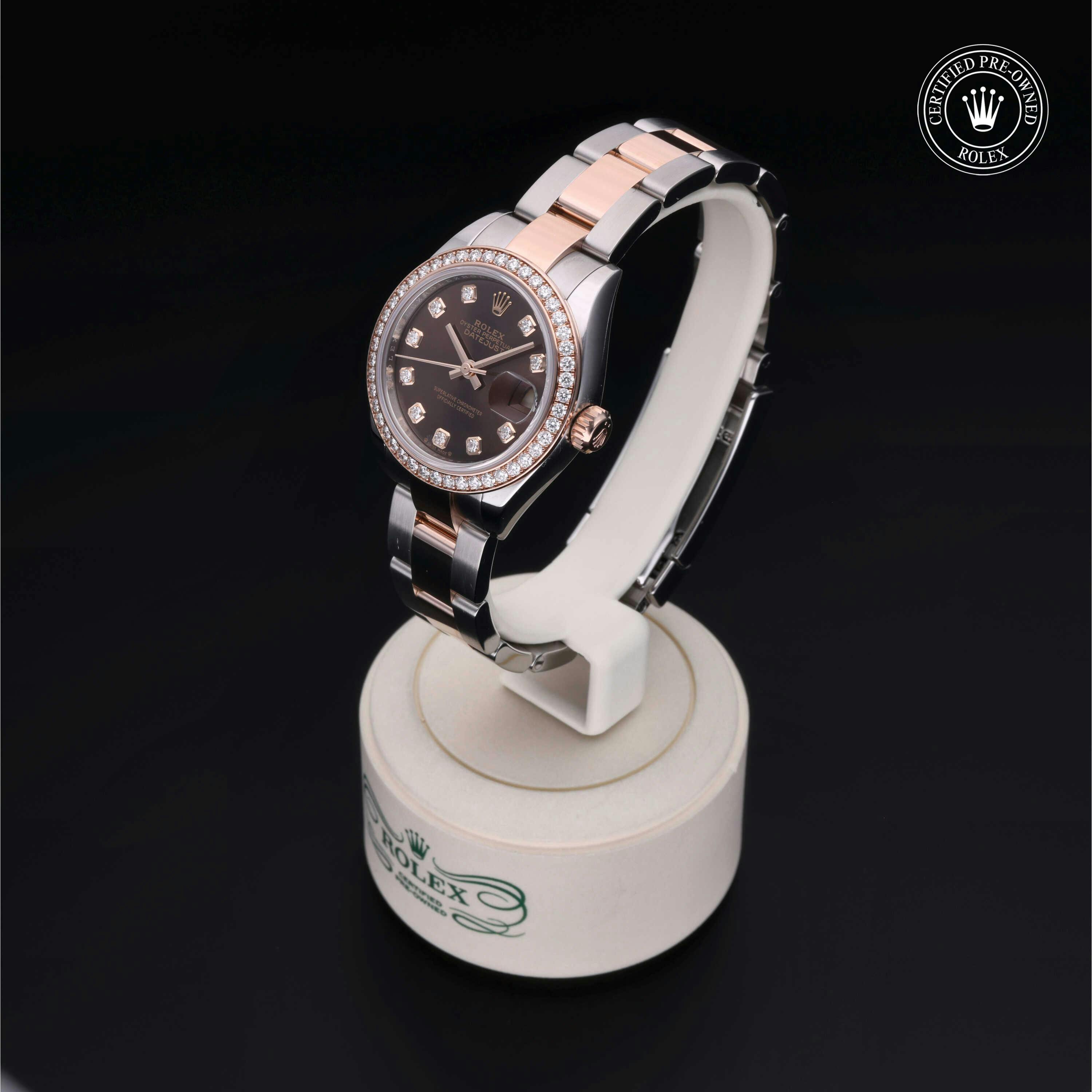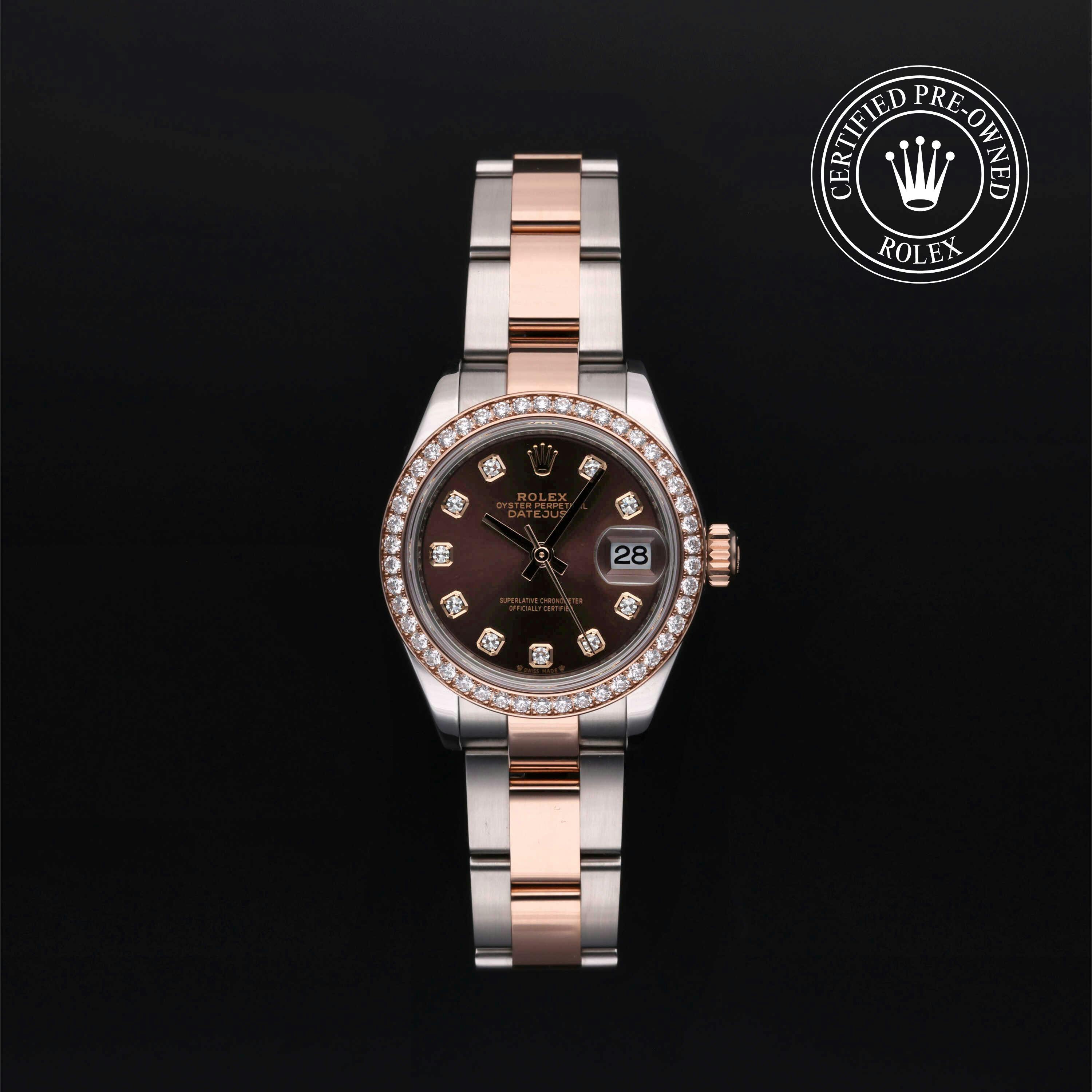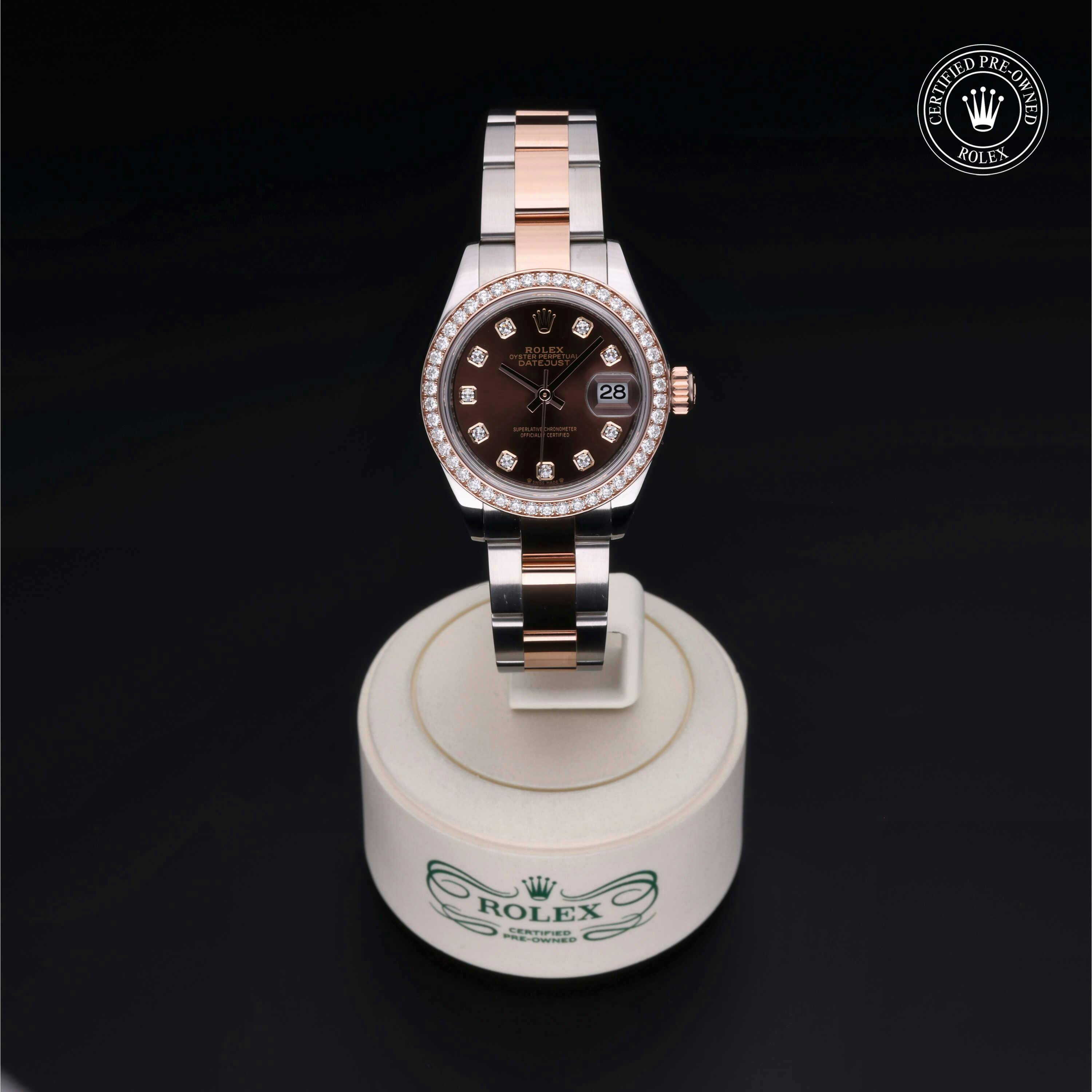 Rolex Certified Pre-Owned Datejust (279381RBR) self - winding automatic watch, features a 28mm stainless case with an 18k rose gold diamond set bezel surrounding a chocolate diamond set dial on a stainless steel and 18k rose gold oyster bracelet. Functions include hours, minutes, seconds and date. This watch has received Rolex-authorized service and certification. It does not come with the original box or papers, but includes a custom Rolex Certified Pre-Owned hang tag, travel pouch and RCPO international warranty card.