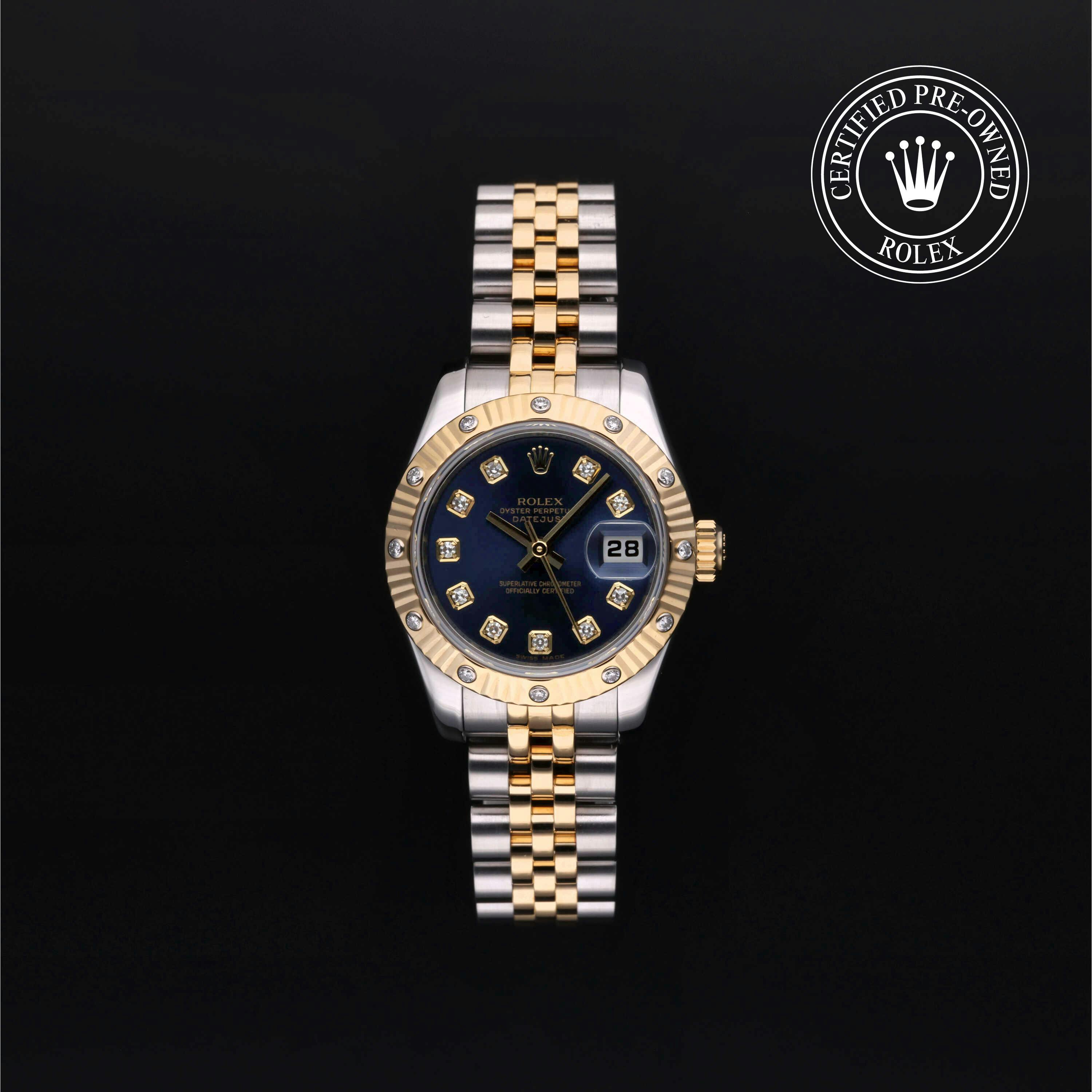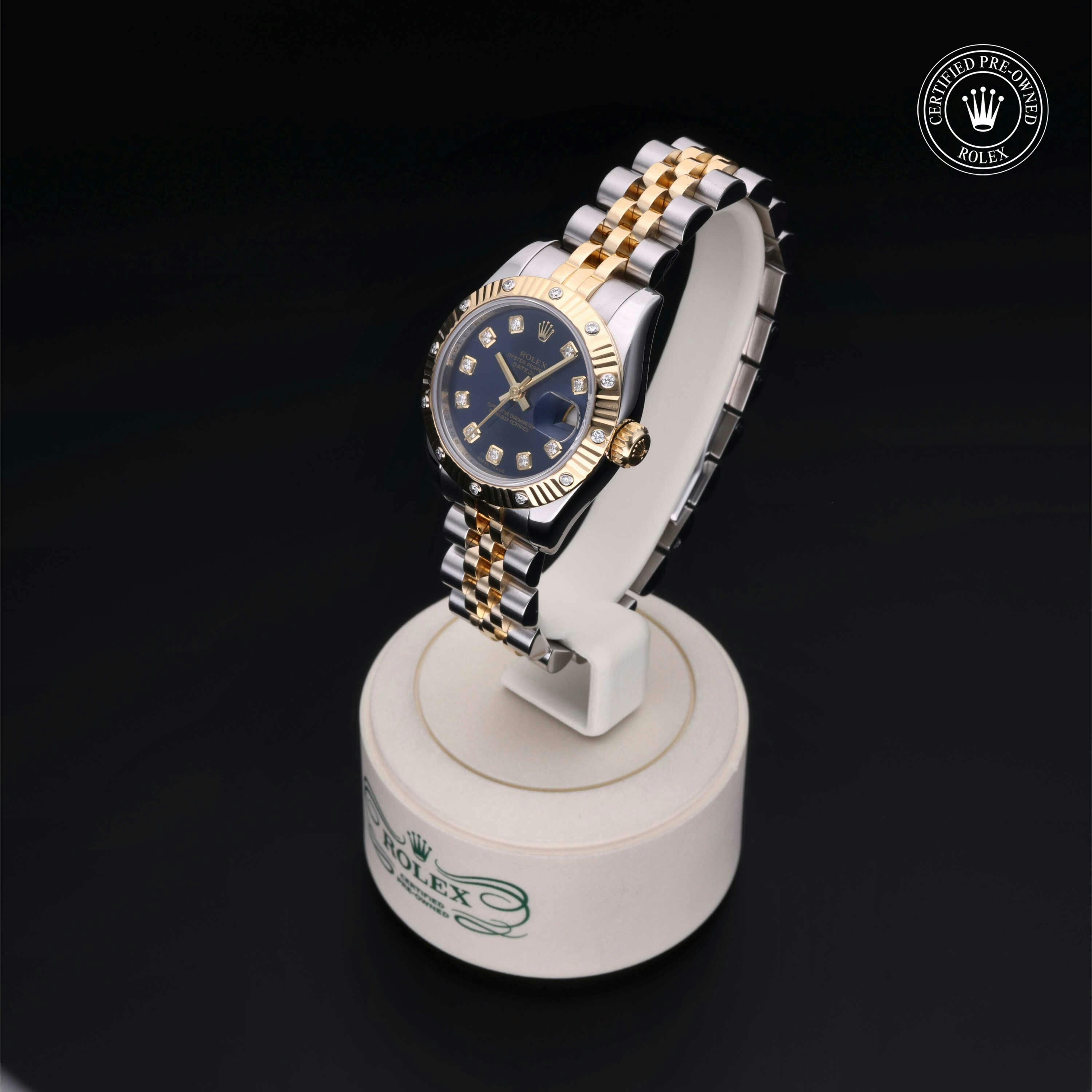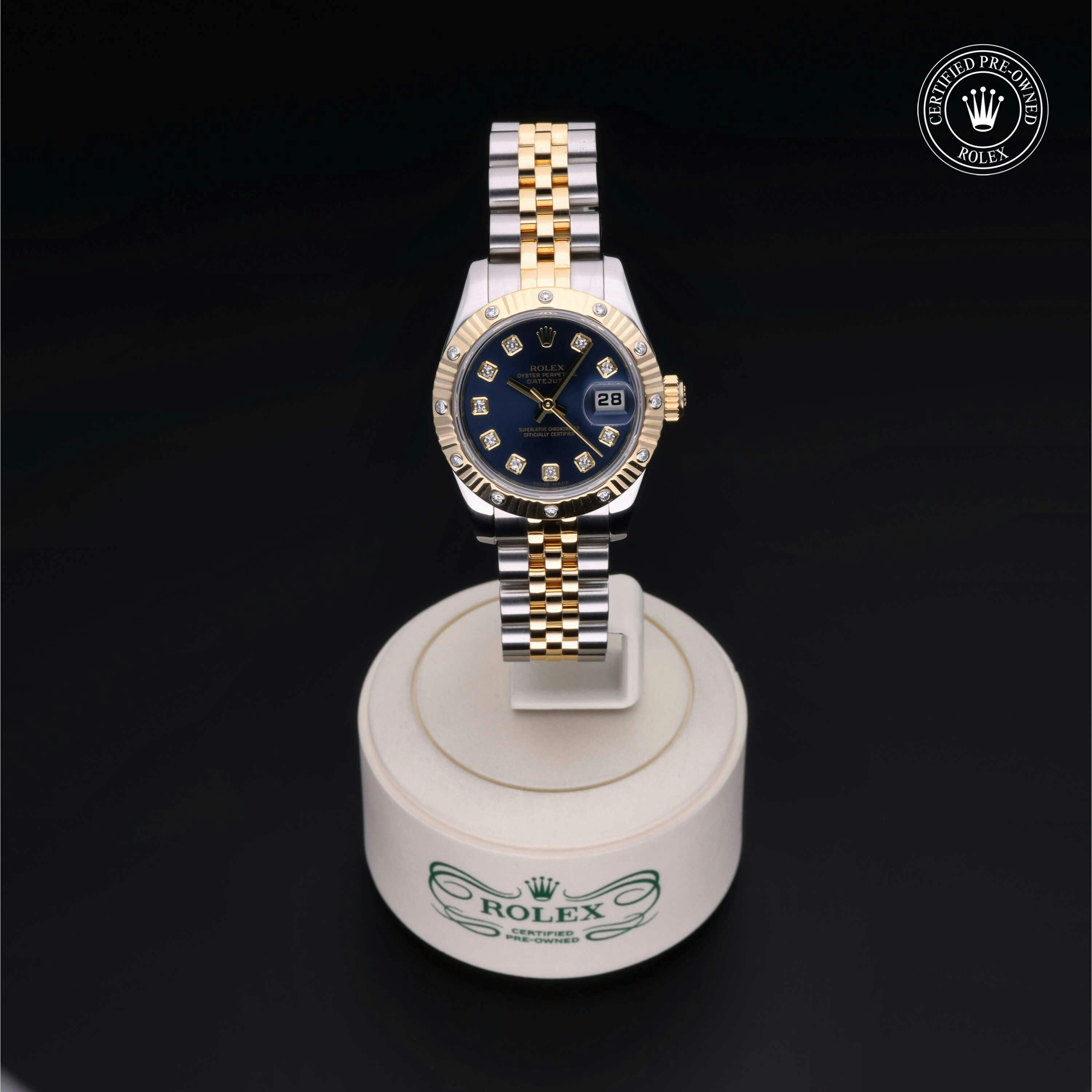 Rolex Certified Pre-Owned Datejust (179313) self - winding automatic watch, features a 26mm stainless case with an 18k yellow gold fluted and diamond set bezel surrounding a blue diamond set dial on a stainless steel and 18k yellow gold jubilee bracelet. Functions include hours, minutes, seconds and date. This watch has received Rolex-authorized service and certification. It does not come with the original box or papers, but includes a custom Rolex Certified Pre-Owned hang tag, travel pouch and RCPO international warranty card.