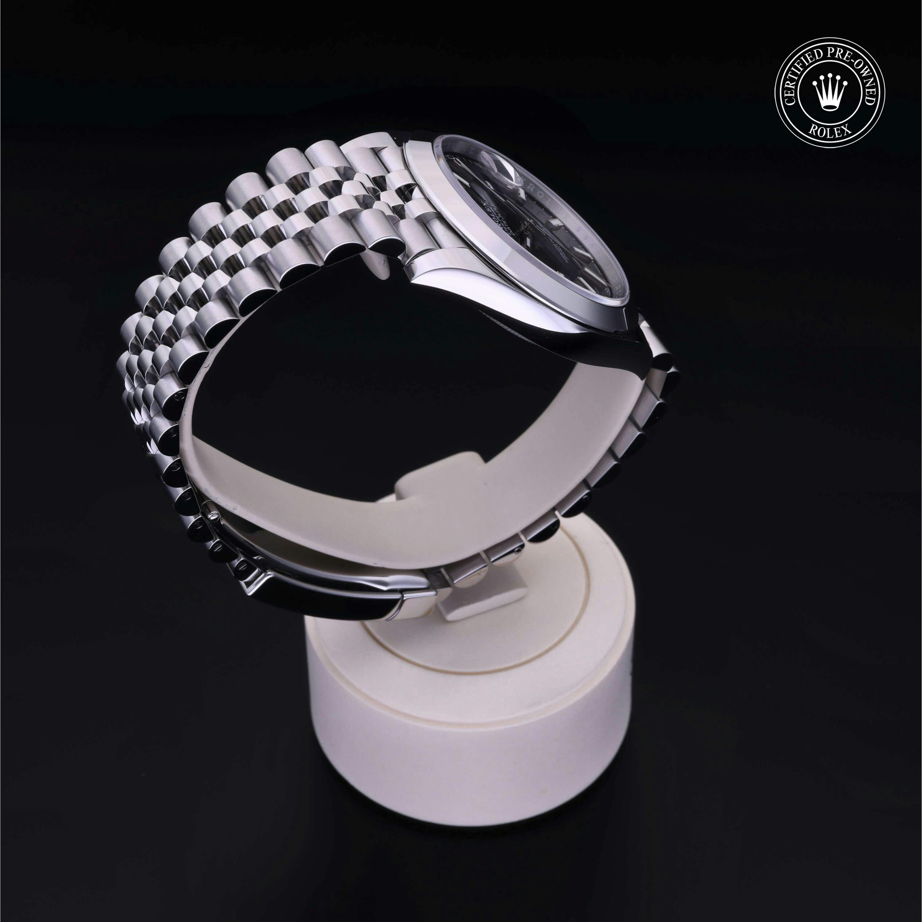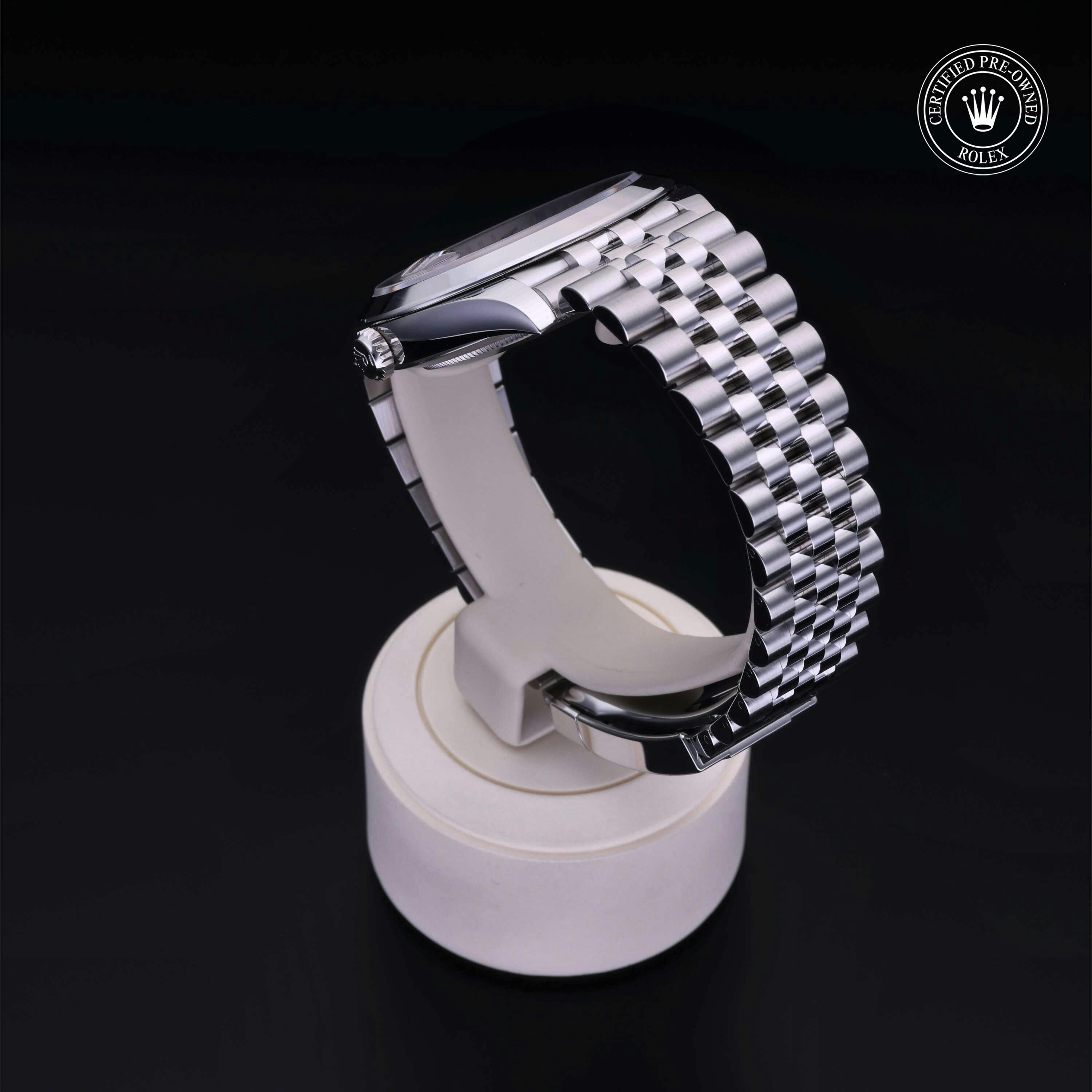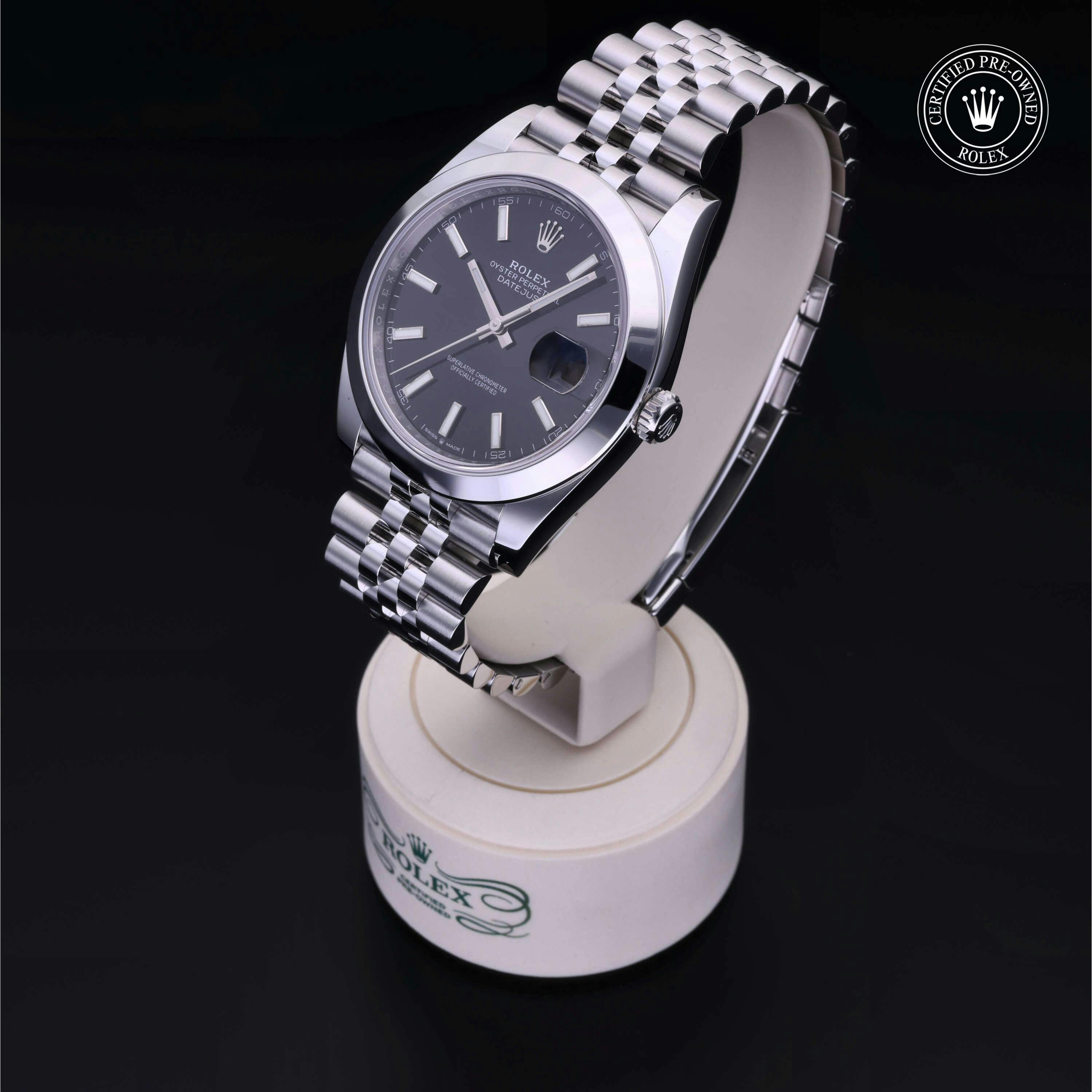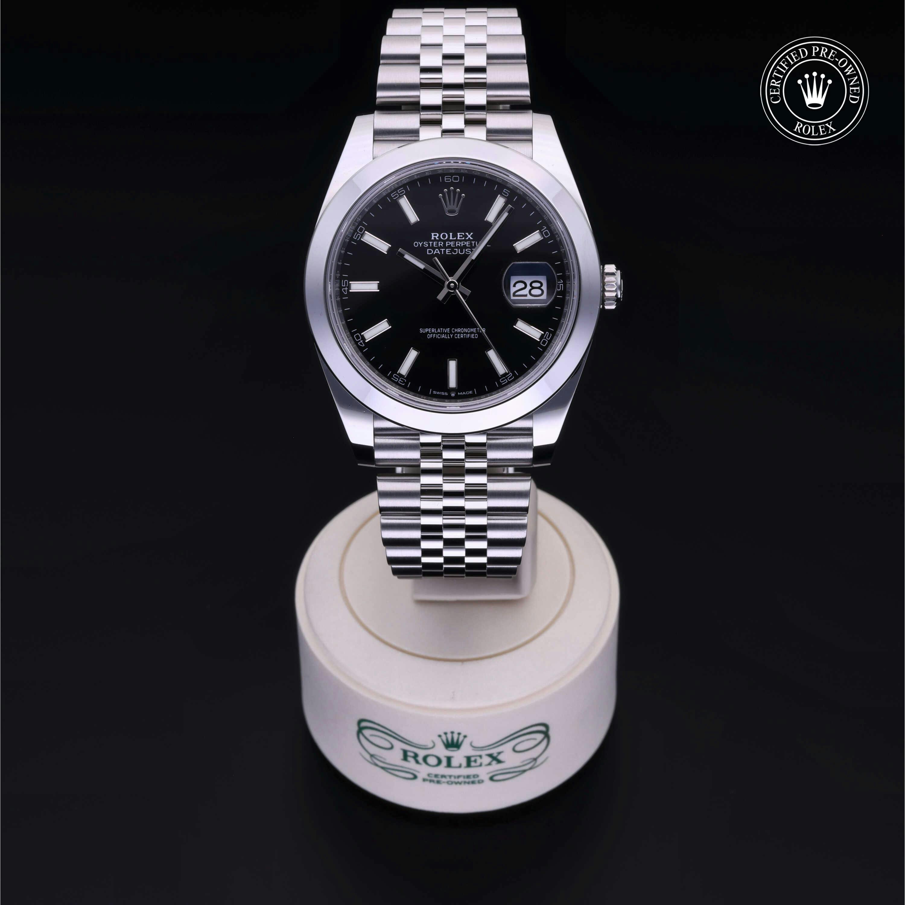 Rolex Certified Pre-Owned Datejust (126300) self - winding automatic watch, features a 41mm stainless steel case and smooth bezel surrounding a black dial on a stainless steel jubilee bracelet. Functions include hours, minutes, seconds and date. This watch has received Rolex-authorized service and certification. It comes with the original box and papers, and includes a custom Rolex Certified Pre-Owned hang tag, travel pouch and RCPO international warranty card.