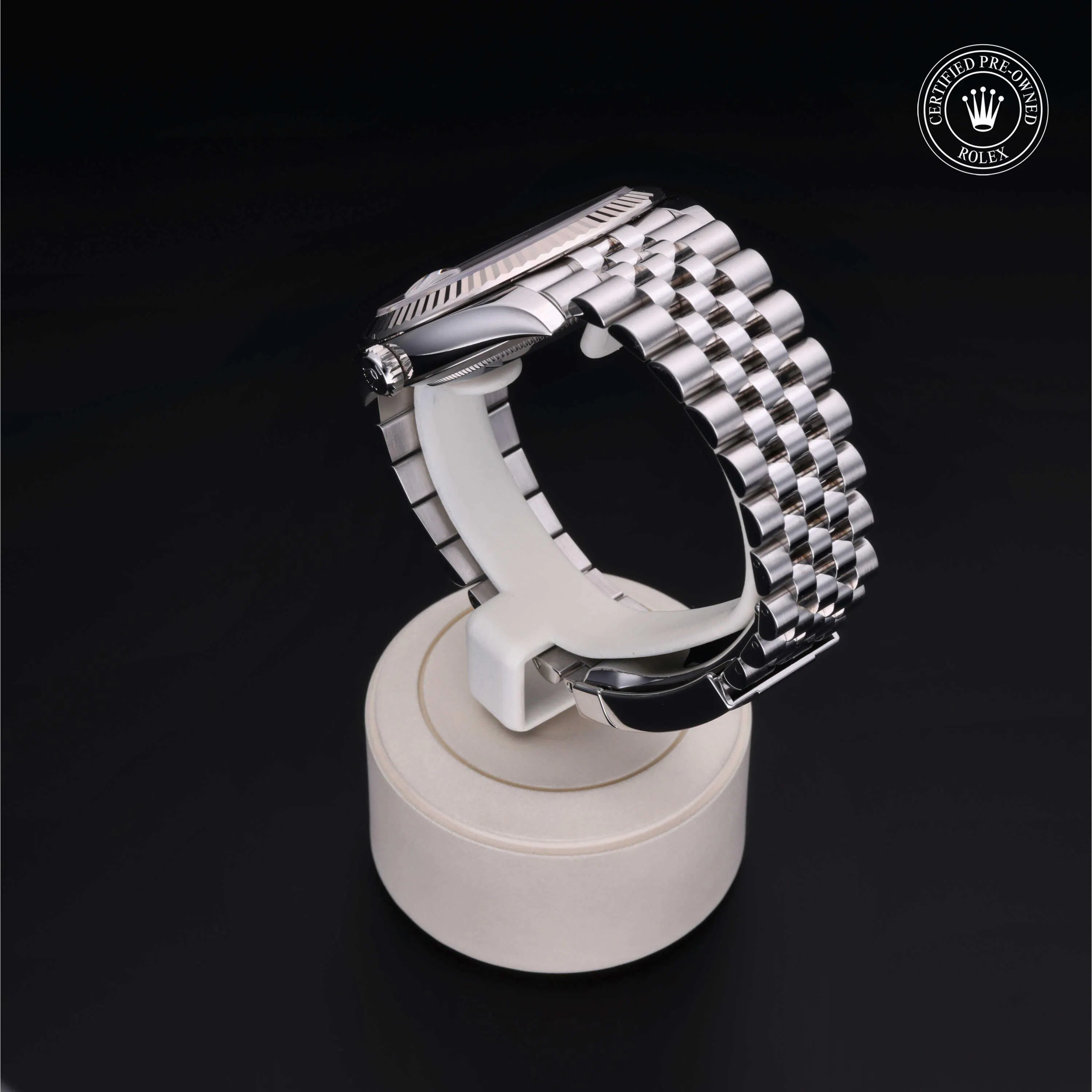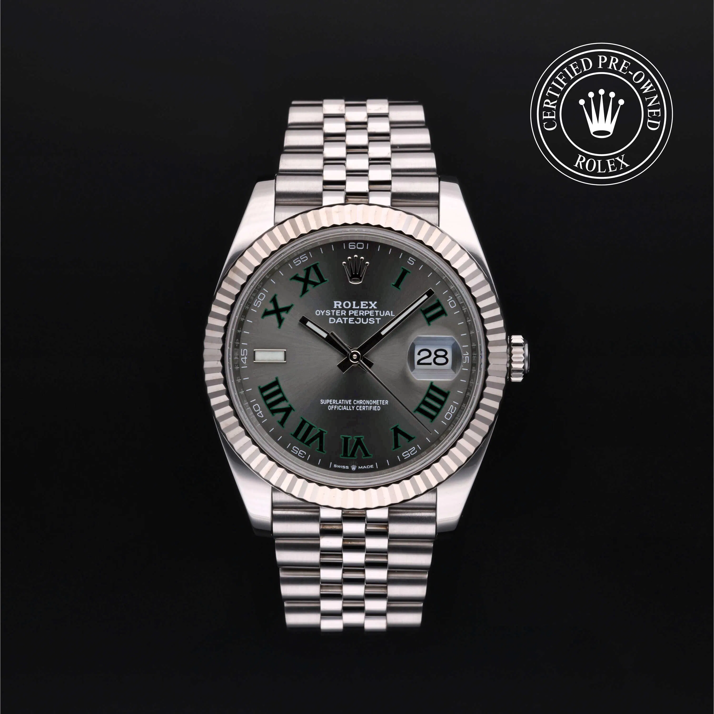 Rolex Certified Pre-Owned Datejust (126334) self - winding automatic watch, features a 41mm stainless steel case with an 18k white gold fluted bezel surrounding a slate dial on a stainless steel jubilee bracelet. Functions include hours, minutes, seconds and date. This watch has received Rolex-authorized service and certification. It comes with the original box and papers, and includes a custom Rolex Certified Pre-Owned hang tag, travel pouch and RCPO international warranty card.