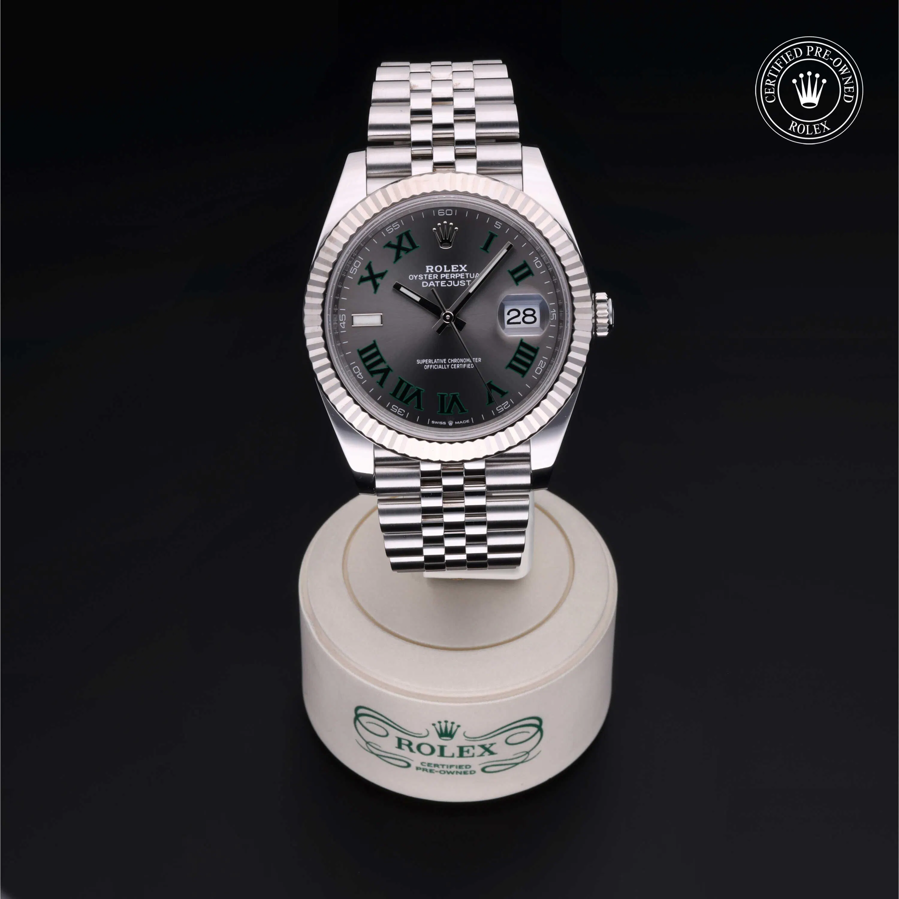 Rolex Certified Pre-Owned Datejust (126334) self - winding automatic watch, features a 41mm stainless steel case with an 18k white gold fluted bezel surrounding a slate dial on a stainless steel jubilee bracelet. Functions include hours, minutes, seconds and date. This watch has received Rolex-authorized service and certification. It comes with the original box and papers, and includes a custom Rolex Certified Pre-Owned hang tag, travel pouch and RCPO international warranty card.