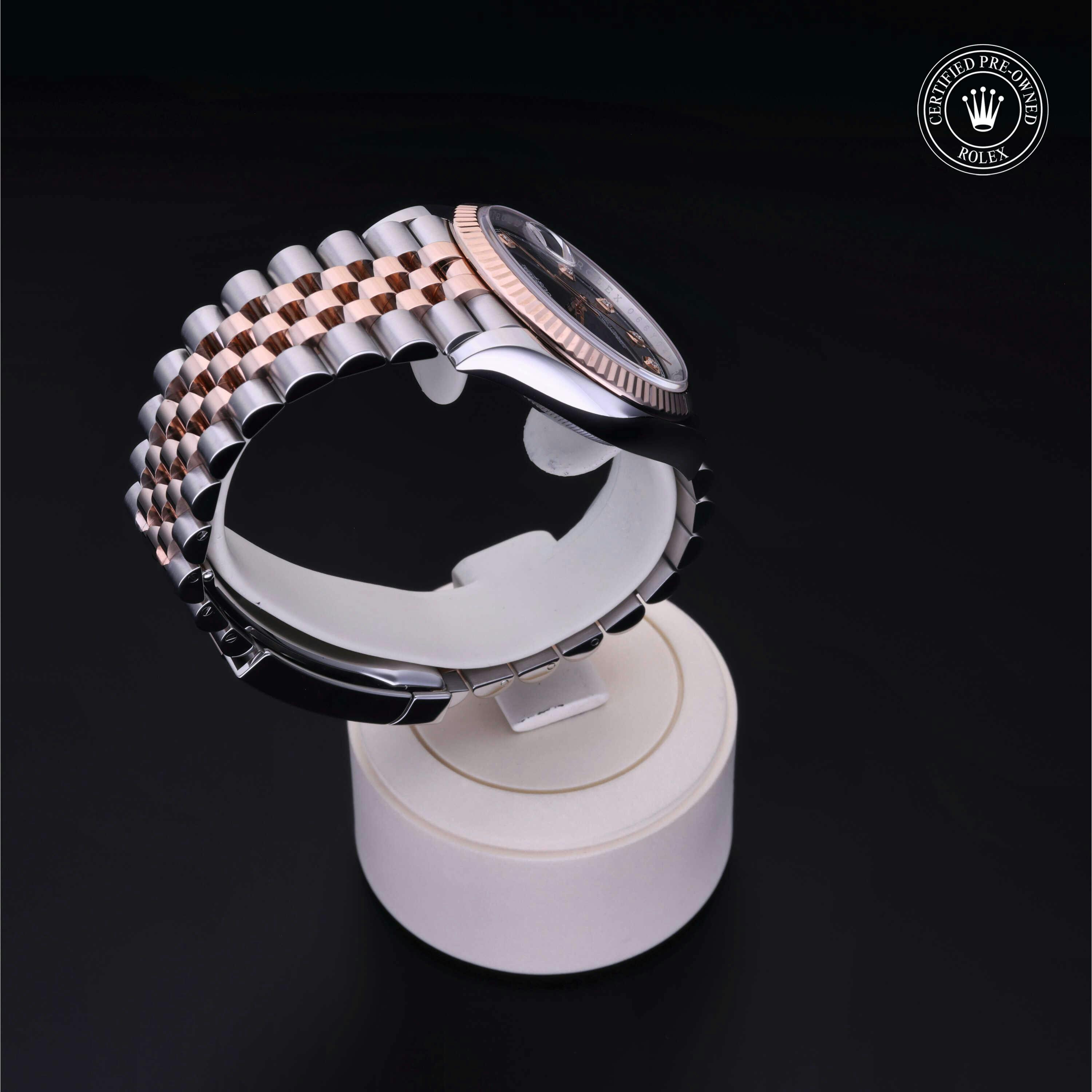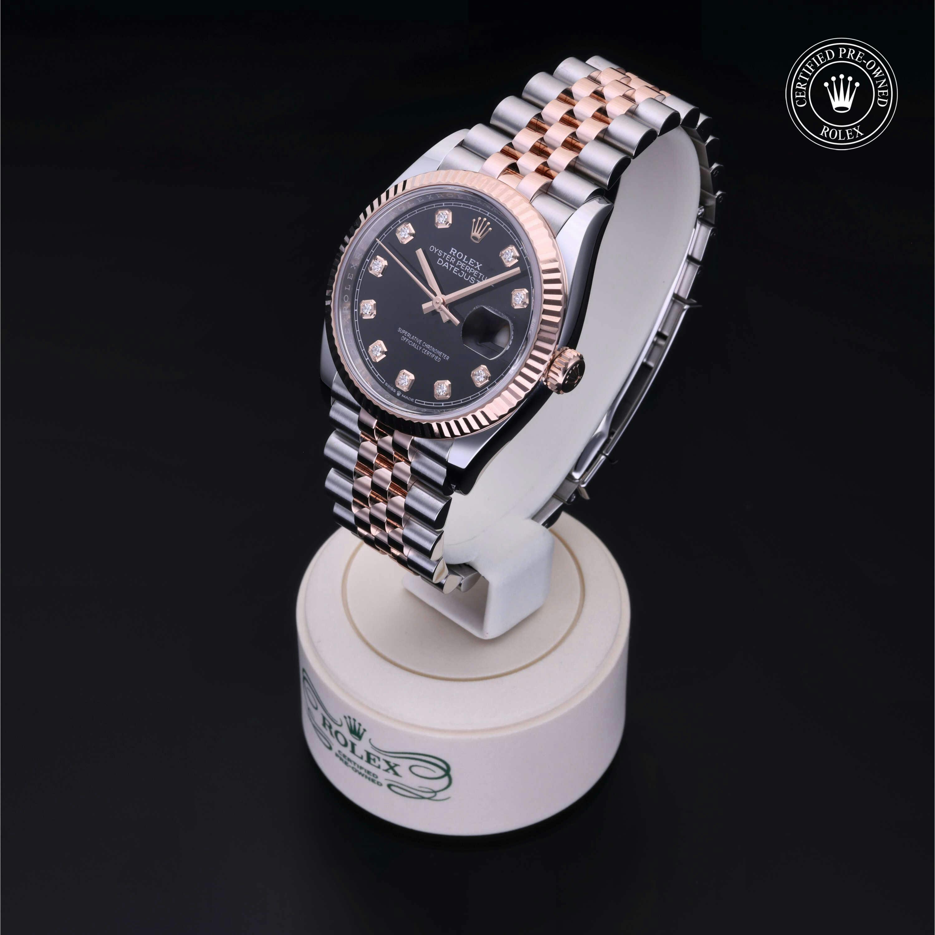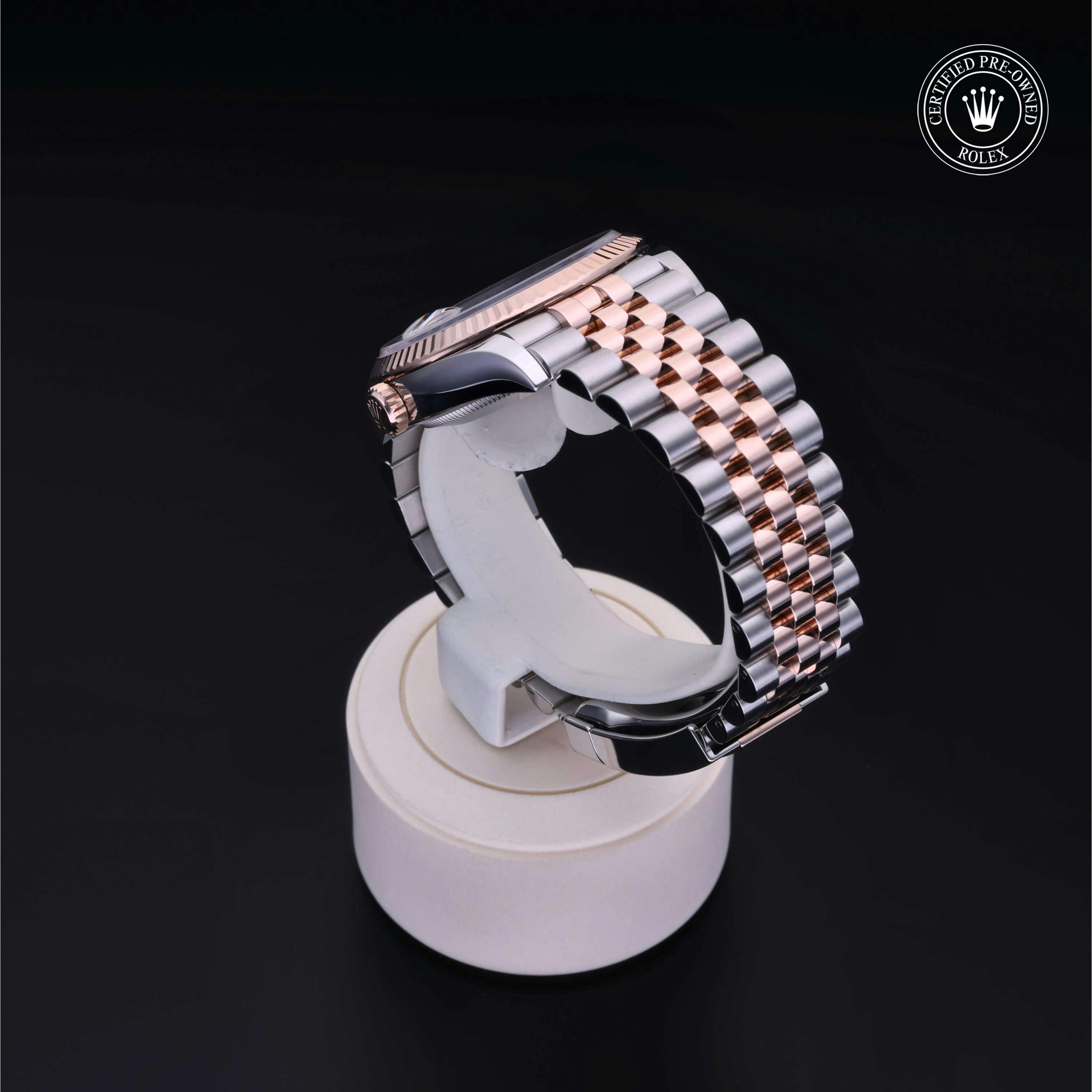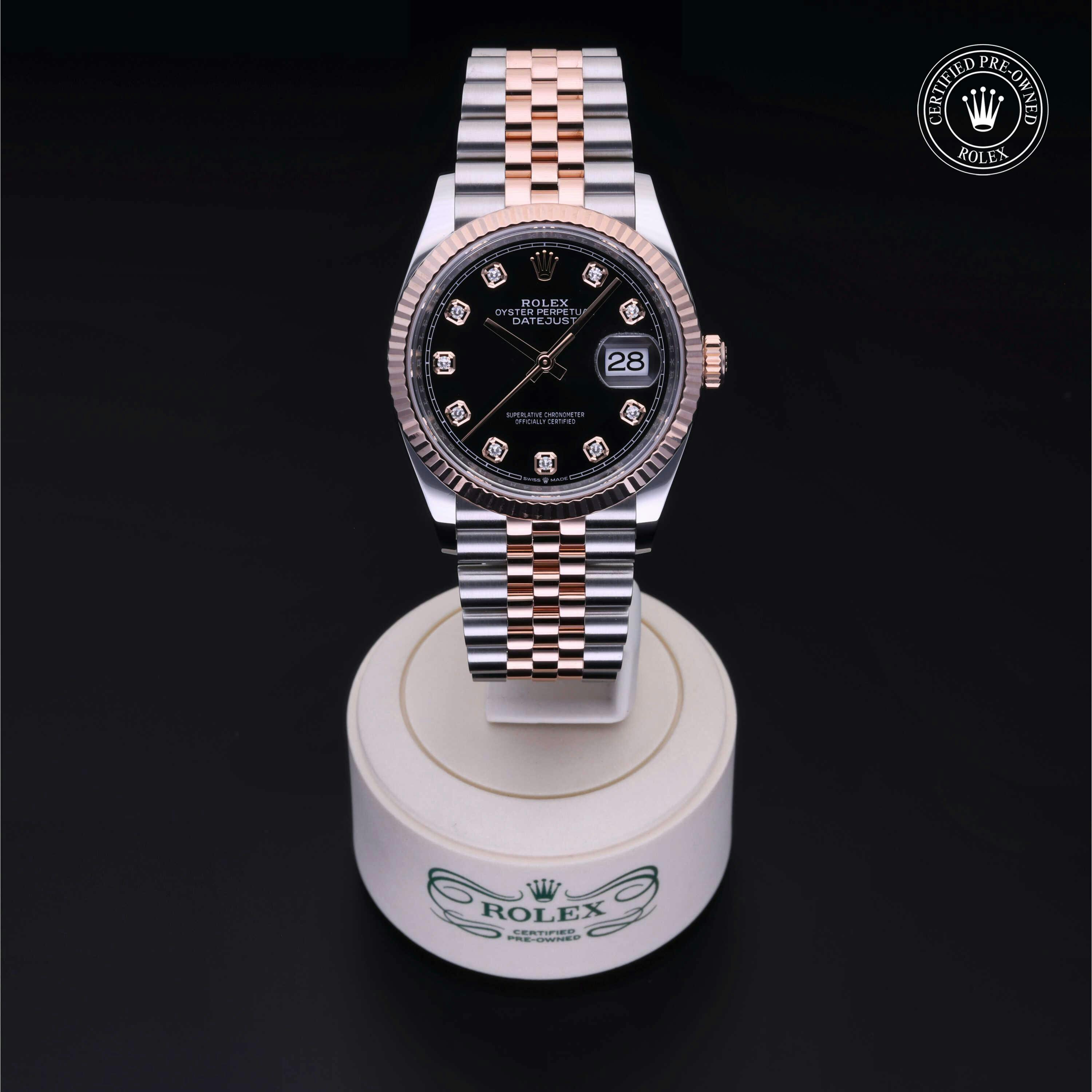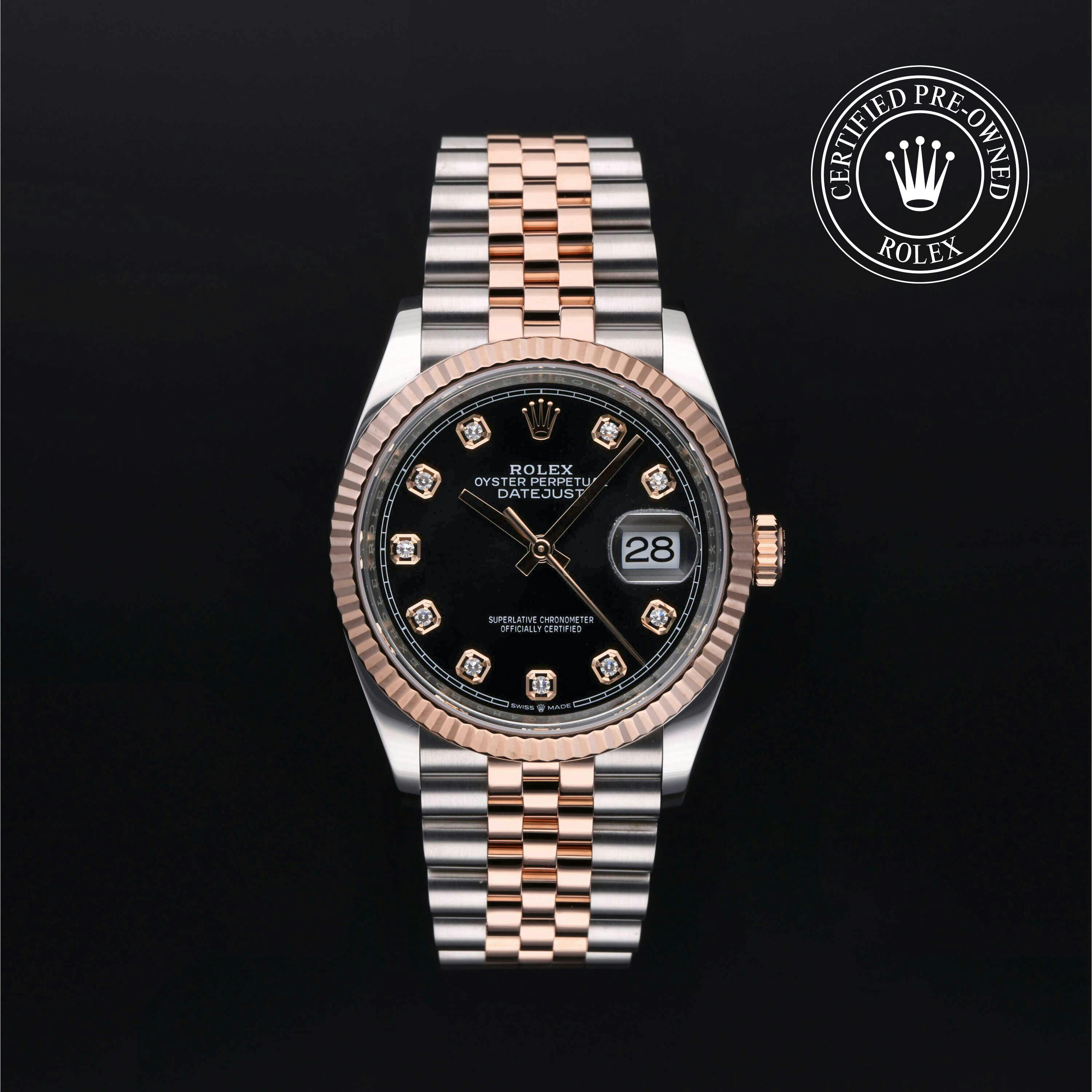 Rolex Certified Pre-Owned Datejust (126231) self - winding automatic watch, features a 36mm stainless steel case with an 18k rose gold fluted bezel surrounding a black diamond set dial on a stainless steel and 18k rose gold jubilee bracelet. Functions include hours, minutes, seconds and date. This watch has received Rolex-authorized service and certification. It comes with the original box and papers, and includes a custom Rolex Certified Pre-Owned hang tag, travel pouch and RCPO international warranty card.