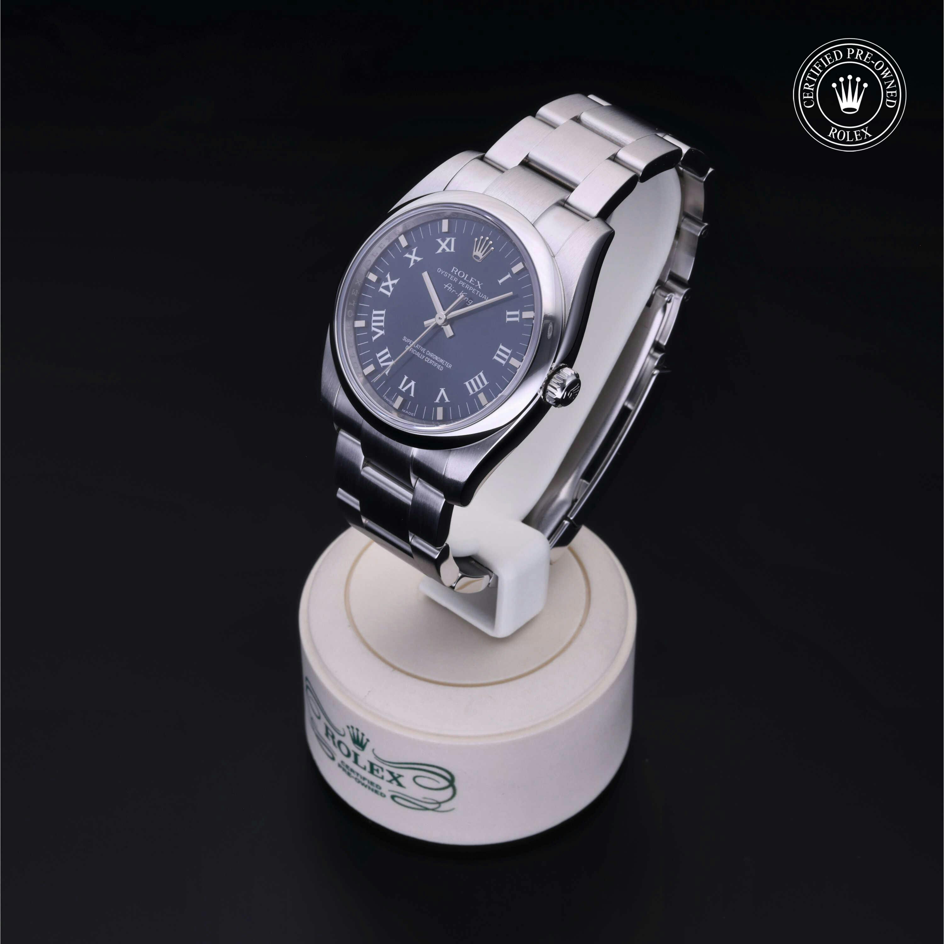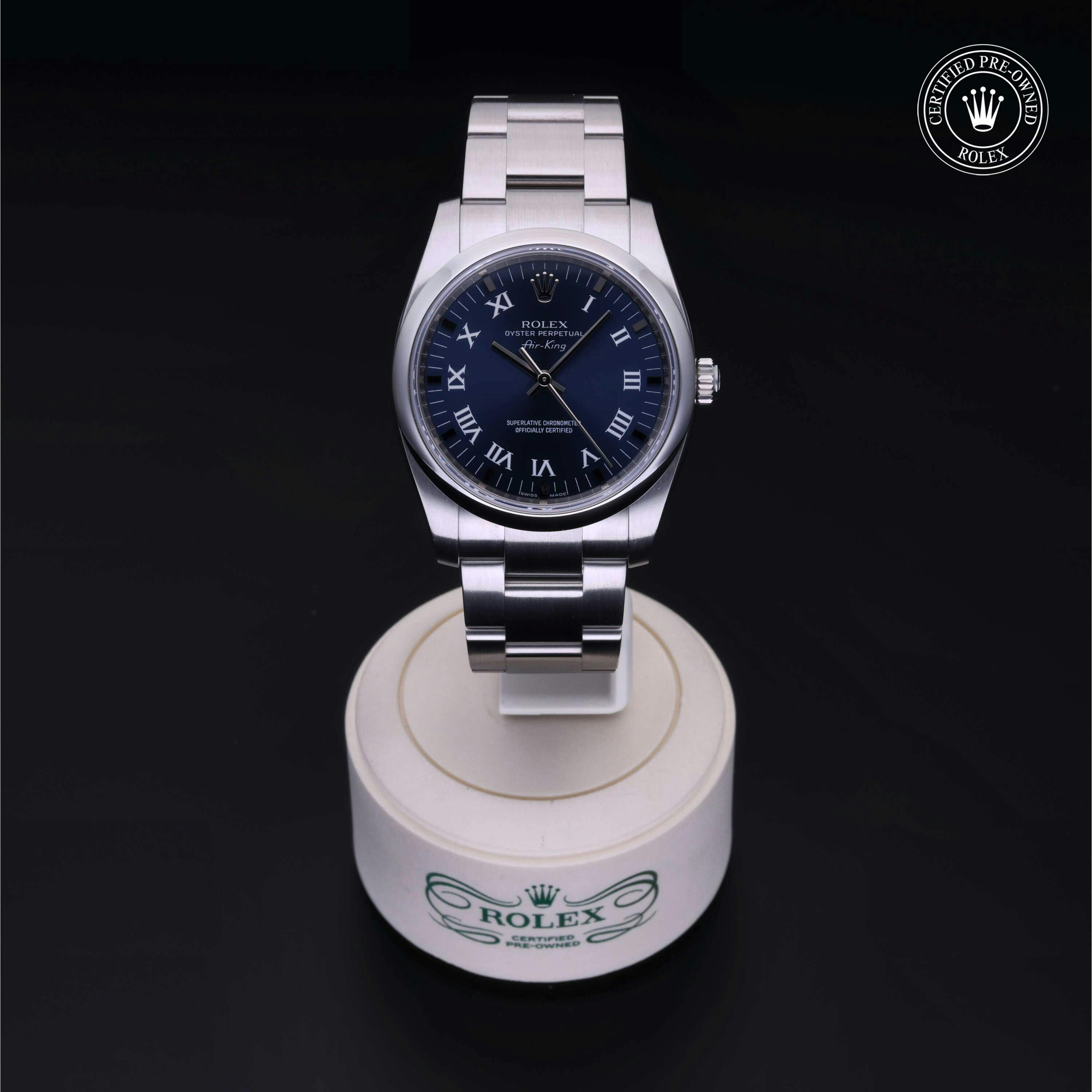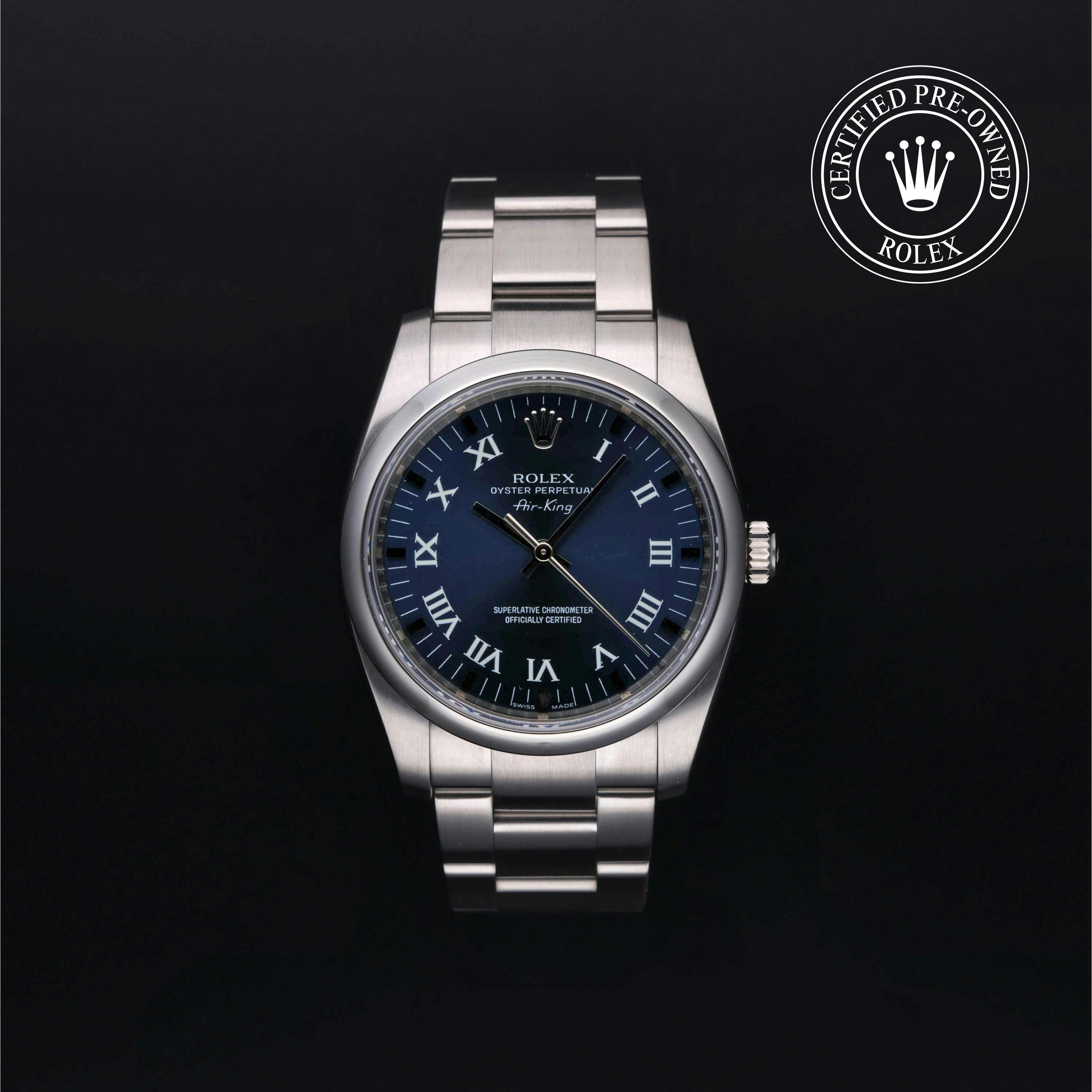 Rolex Certified Pre-Owned Oyster Perpetual Air-King (114200) self - winding automatic watch, features a 36mm stainless steel case and domed bezel surrounding a blue dial on a stainless steel oyster bracelet. Functions include hours, minutes and seconds. This watch has received Rolex-authorized service and certification. It does not come with the original box or papers, but includes a custom Rolex Certified Pre-Owned hang tag, travel pouch and RCPO international warranty card.
