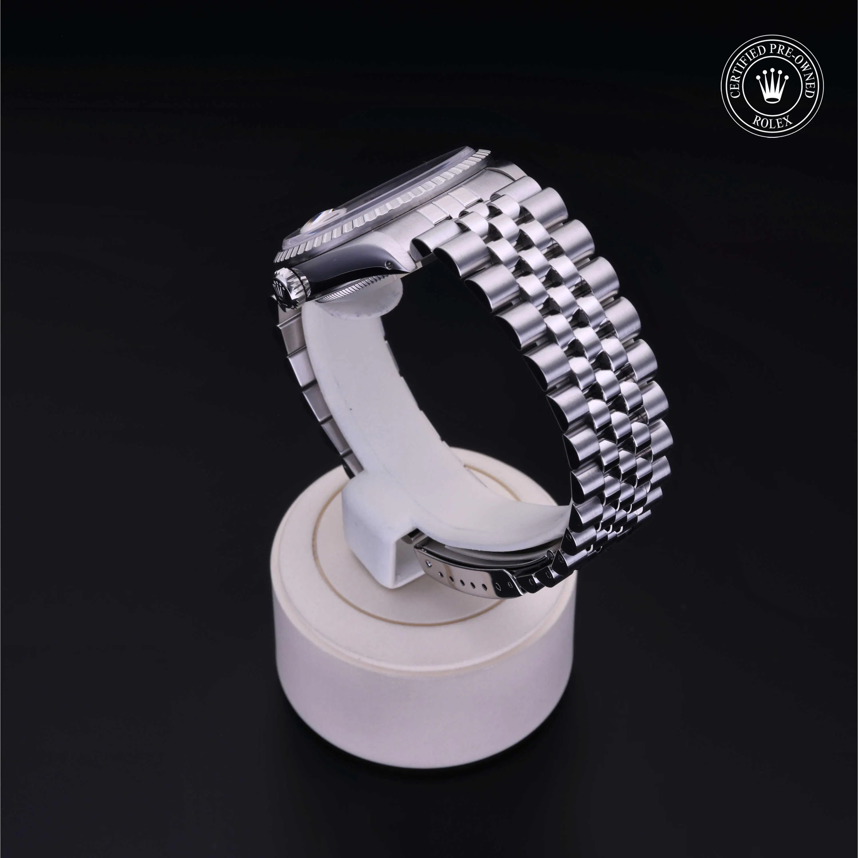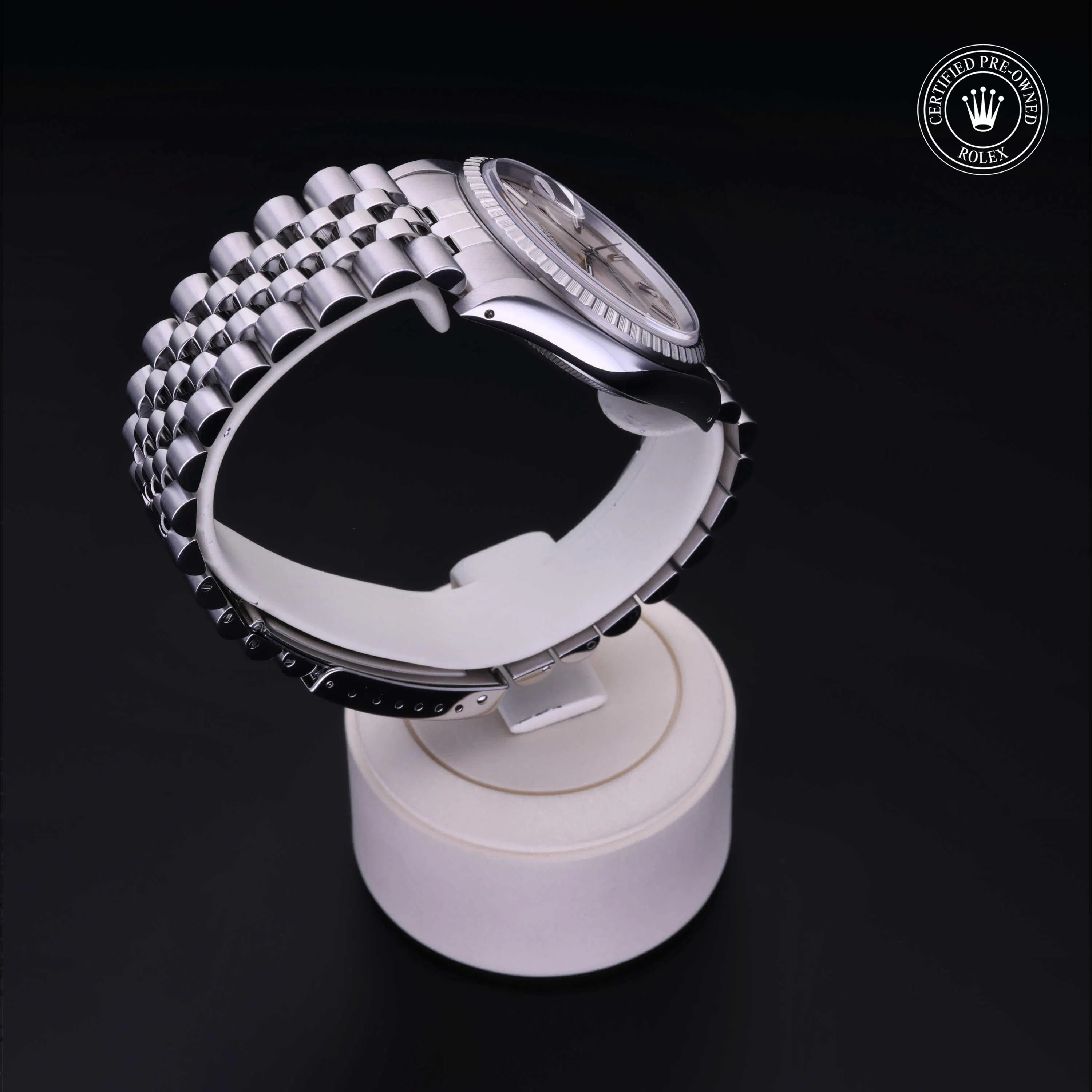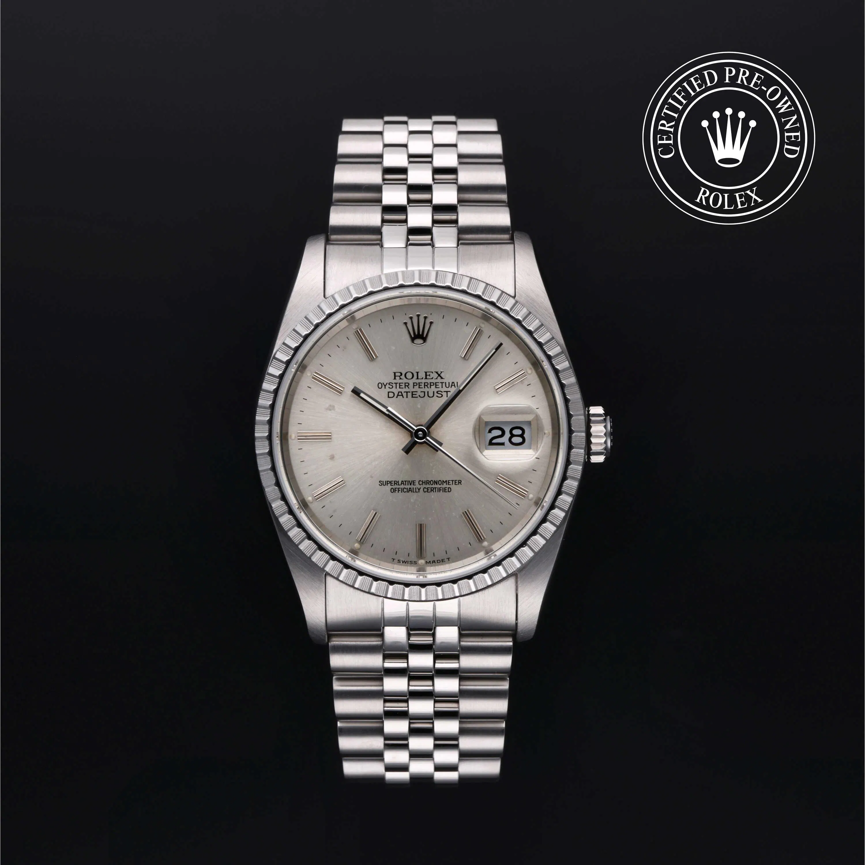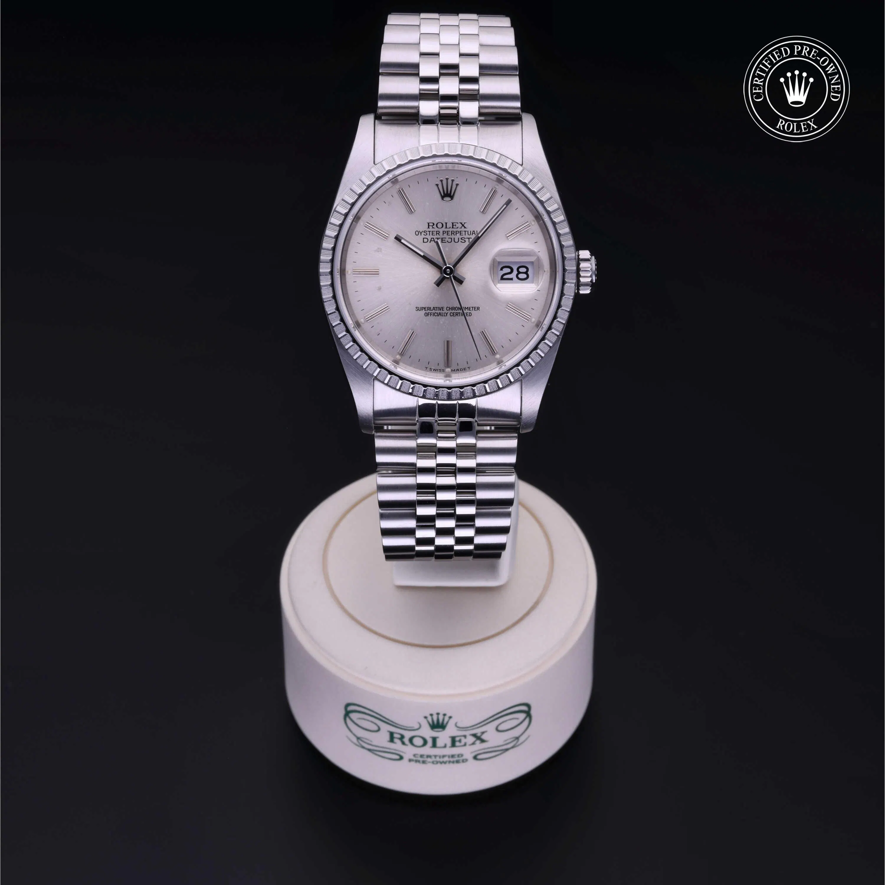 Rolex Certified Pre-Owned Datejust (16220) self - winding automatic watch, features a 36mm stainless steel case and engine-turned bezel surrounding a silver dial on a silver jubilee bracelet. Functions include hours, minutes, seconds and date. This watch has received Rolex-authorized service and certification. It does not come with the original box or papers, but includes a custom Rolex Certified Pre-Owned hang tag, travel pouch and RCPO international warranty card.